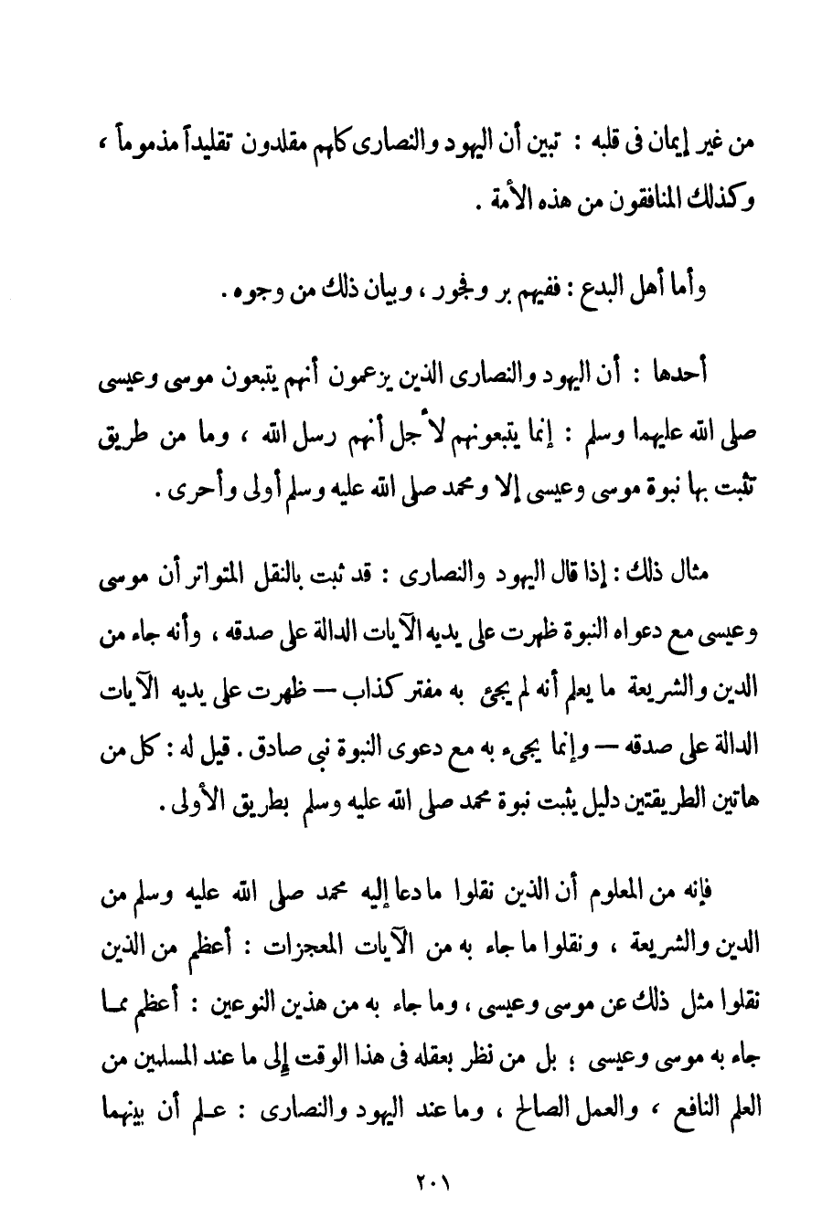 أَحَدُهَا: أَنَّ الْيَهُودَ وَالنَّصَارَى الَّذِينَ يَزْعُمُونَ أَنَّهُمْ يَتَّبِعُونَ مُوسَى وَعِيسَى صَلَّى اللَّهُ عَلَيْهِمَا وَسَلَّمَ إنَّمَا يَتَّبِعُونَهُمْ لِأَجْلِ أَنَّهُمْ رُسُلُ اللَّهِ وَمَا مِنْ طَرِيقٍ تَثْبُتُ بِهَا نُبُوَّةُ مُوسَى وَعِيسَى إلَّا وَمُحَمَّدٌ صَلَّى اللَّهُ عَلَيْهِ وَسَلَّمَ أَوْلَى وَأَحْرَى. مِثَالُ ذَلِكَ: إذَا قَالَ الْيَهُودُ وَالنَّصَارَى: قَدْ ثَبَتَ بِالنَّقْلِ الْمُتَوَاتِرِ أَنَّ مُوسَى وَعِيسَى مَعَ دَعْوَاهُ النُّبُوَّةَ ظَهَرَتْ عَلَى يَدَيْهِ الْآيَاتُ الدَّالَّةُ عَلَى صِدْقِهِ وَأَنَّهُ جَاءَ مِنْ الدِّينِ وَالشَّرِيعَةِ مَا يُعْلَمُ أَنَّهُ لَمْ يَجِئْ بِهِ مُفْتَرٍ كَذَّابٌ - ظَهَرَتْ عَلَى يَدَيْهِ الْآيَاتُ الدَّالَّةُ عَلَى صِدْقِهِ - وَإِنَّمَا يَجِيءُ بِهِ مَعَ دَعْوَى النُّبُوَّةِ نَبِيٌّ صَادِقٌ. قِيلَ لَهُ: كُلٌّ مِنْ هَاتَيْنِ الطَّرِيقَتَيْنِ دَلِيلٌ يُثْبِتُ نُبُوَّةَ مُحَمَّدٍ صَلَّى اللَّهُ عَلَيْهِ وَسَلَّمَ بِطَرِيقِ الْأَوْلَى. فَإِنَّهُ مِنْ الْمَعْلُومِ أَنَّ الَّذِينَ نَقَلُوا مَا دَعَا إلَيْهِ مُحَمَّدٌ صَلَّى اللَّهُ عَلَيْهِ وَسَلَّمَ مِنْ الدِّينِ وَالشَّرِيعَةِ وَنَقَلُوا مَا جَاءَ بِهِ مِنْ الْآيَاتِ الْمُعْجِزَاتِ: أَعْظَمُ مِنْ الَّذِينَ نَقَلُوا مِثْلَ ذَلِكَ عَنْ مُوسَى وَعِيسَى وَمَا جَاءَ بِهِ مِنْ هَذَيْنِ النَّوْعَيْنِ: أَعْظَمُ مِمَّا جَاءَ بِهِ مُوسَى وَعِيسَى؛ بَلْ مَنْ نَظَرَ بِعَقْلِهِ فِي هَذَا الْوَقْتِ إلَى مَا عِنْدَ الْمُسْلِمِينَ مِنْ الْعِلْمِ النَّافِعِ وَالْعَمَلِ الصَّالِحِ وَمَا عِنْدَ الْيَهُودِ وَالنَّصَارَى: عُلِمَ أَنَّ بَيْنَهُمَا