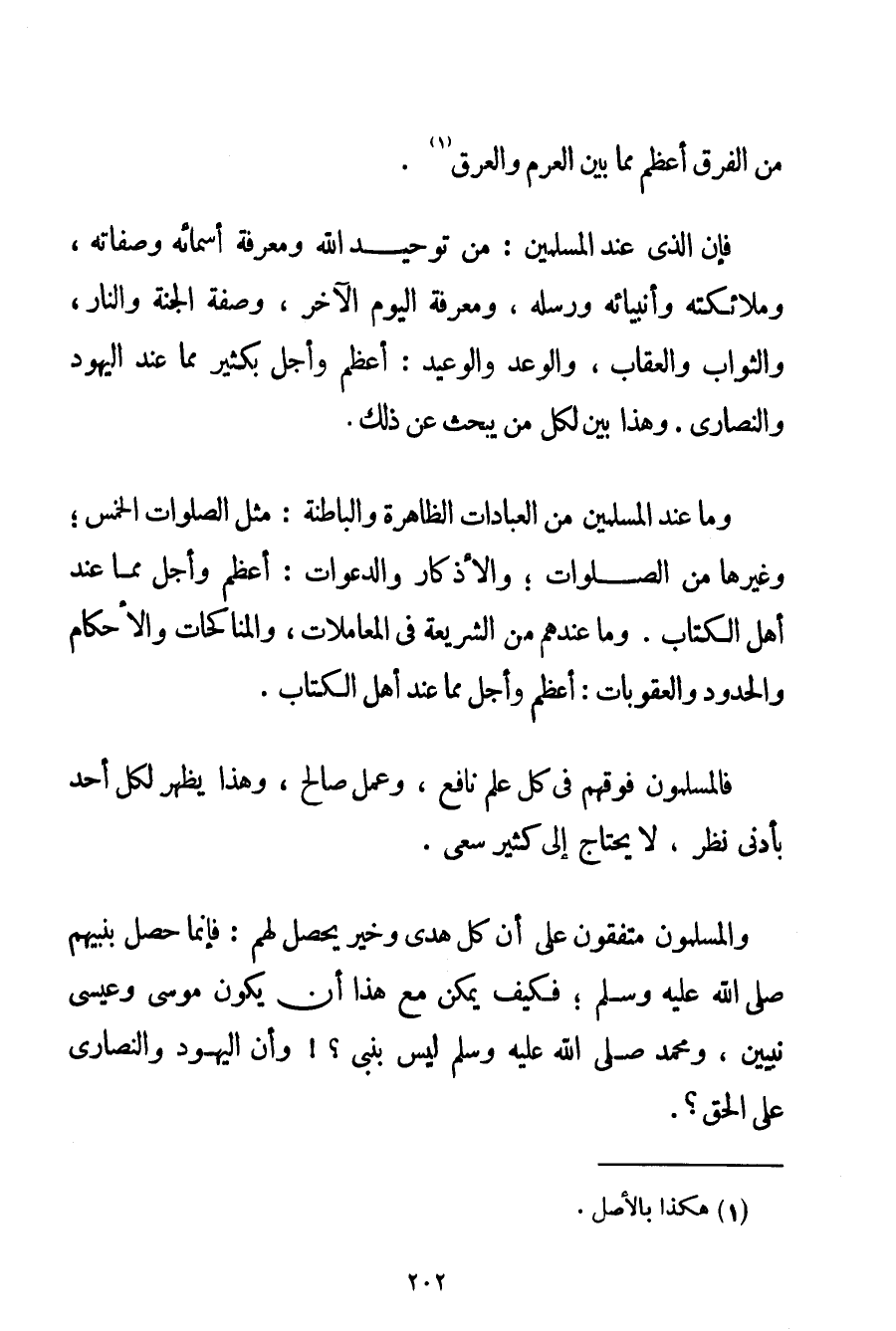 مِنْ الْفَرْقِ أَعْظَمُ مِمَّا بَيْنَ الْعَرِمِ وَالْعَرَقِ. فَإِنَّ الَّذِي عِنْدَ الْمُسْلِمِينَ: مِنْ تَوْحِيدِ اللَّهِ وَمَعْرِفَةِ أَسْمَائِهِ وَصِفَاتِهِ وَمَلَائِكَتِهِ وَأَنْبِيَائِهِ وَرُسُلِهِ وَمَعْرِفَةِ الْيَوْمِ الْآخِرِ وَصِفَةِ الْجَنَّةِ وَالنَّارِ وَالثَّوَابِ وَالْعِقَابِ وَالْوَعْدِ وَالْوَعِيدِ: أَعْظَمُ وَأَجَلُّ بِكَثِيرِ مِمَّا عِنْدَ الْيَهُودِ وَالنَّصَارَى. وَهَذَا بَيِّنٌ لِكُلِّ مَنْ يَبْحَثُ عَنْ ذَلِكَ. وَمَا عِنْدَ الْمُسْلِمِينَ مِنْ الْعِبَادَاتِ الظَّاهِرَةِ وَالْبَاطِنَةِ: مِثْلَ الصَّلَوَاتِ الْخَمْسِ؛ وَغَيْرِهَا مِنْ الصَّلَوَاتِ؛ وَالْأَذْكَارِ وَالدَّعَوَاتِ: أَعْظَمُ وَأَجَلُّ مِمَّا عِنْدَ أَهْلِ الْكِتَابِ. وَمَا عِنْدَهُمْ مِنْ الشَّرِيعَةِ فِي الْمُعَامَلَاتِ وَالْمُنَاكَحَاتِ وَالْأَحْكَامِ وَالْحُدُودِ وَالْعُقُوبَاتِ: أَعْظَمُ وَأَجَلُّ مِمَّا عِنْدَ أَهْلِ الْكِتَابِ. فَالْمُسْلِمُونَ فَوْقَهُمْ فِي كُلِّ عِلْمٍ نَافِعٍ وَعَمَلٍ صَالِحٍ وَهَذَا يَظْهَرُ لِكُلِّ أَحَدٍ بِأَدْنَى نَظَرٍ لَا يَحْتَاجُ إلَى كَثِيرِ سَعْيٍ. وَالْمُسْلِمُونَ مُتَّفِقُونَ عَلَى أَنَّ كُلَّ هُدًى وَخَيْرٍ يَحْصُلُ لَهُمْ: فَإِنَّمَا حَصَلَ بِنَبِيِّهِمْ صَلَّى اللَّهُ عَلَيْهِ وَسَلَّمَ؛ فَكَيْفَ يُمْكِنُ مَعَ هَذَا أَنْ يَكُونَ مُوسَى وَعِيسَى نَبِيَّيْنِ وَمُحَمَّدٌ صَلَّى اللَّهُ عَلَيْهِ وَسَلَّمَ لَيْسَ بِنَبِيِّ وَأَنَّ الْيَهُودَ وَالنَّصَارَى عَلَى الْحَقِّ؟ .