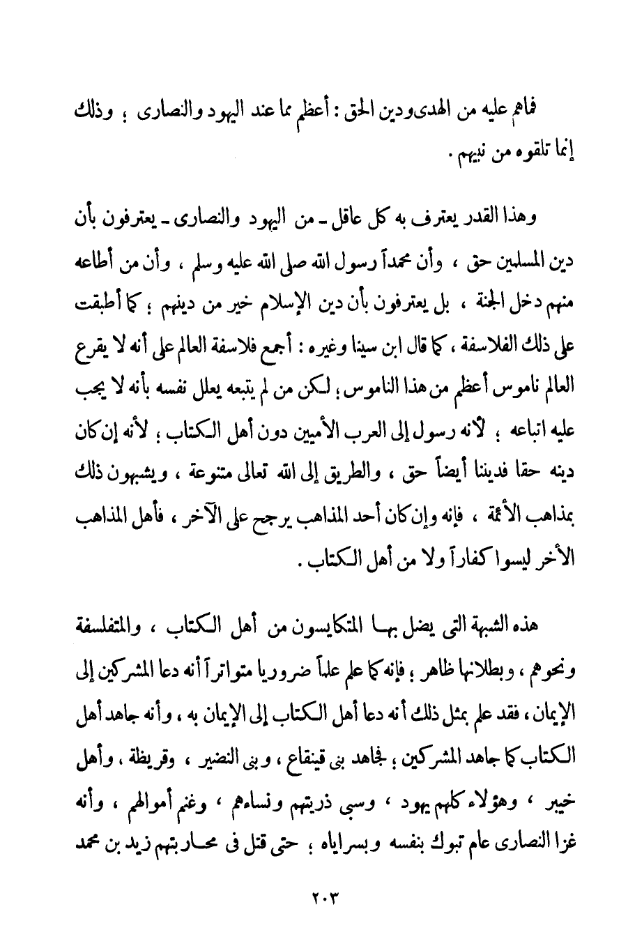 وَهَذَا الْقَدْرُ يَعْتَرِفُ بِهِ كُلُّ عَاقِلٍ - مِنْ الْيَهُودِ وَالنَّصَارَى - يَعْتَرِفُونَ بِأَنَّ دِينَ الْمُسْلِمِينَ حَقٌّ وَأَنَّ مُحَمَّدًا رَسُولُ اللَّهِ صَلَّى اللَّهُ عَلَيْهِ وَسَلَّمَ وَأَنَّ مَنْ أَطَاعَهُ مِنْهُمْ دَخَلَ الْجَنَّةَ بَلْ يَعْتَرِفُونَ بِأَنَّ دِينَ الْإِسْلَامِ خَيْرٌ مِنْ دِينِهِمْ؛ كَمَا أَطْبَقَتْ عَلَى ذَلِكَ الْفَلَاسِفَةُ كَمَا قَالَ ابْنُ سِينَا وَغَيْرُهُ: أَجْمَعَ فَلَاسِفَةُ الْعَالَمِ عَلَى أَنَّهُ لَا يَقْرَعُ الْعَالَمَ نَامُوسٌ أَعْظَمُ مِنْ هَذَا النَّامُوسِ؛ لَكِنْ مَنْ لَمْ يَتَّبِعْهُ يُعَلِّلُ نَفْسَهُ بِأَنَّهُ لَا يَجِبُ عَلَيْهِ اتِّبَاعُهُ؛ لِأَنَّهُ رَسُولٌ إلَى الْعَرَبِ الْأُمِّيِّينَ دُونَ أَهْلِ الْكِتَابِ؛ لِأَنَّهُ إنْ كَانَ دِينُهُ حَقًّا فَدِينُنَا أَيْضًا حَقٌّ وَالطَّرِيقُ إلَى اللَّهِ تَعَالَى مُتَنَوِّعَةٌ وَيُشَبِّهُونَ ذَلِكَ بِمَذَاهِبِ الْأَئِمَّةِ فَإِنَّهُ وَإِنْ كَانَ أَحَدُ الْمَذَاهِبِ يُرَجَّحُ عَلَى الْآخَرِ فَأَهْلُ الْمَذَاهِبِ الْأُخَرى لَيْسُوا كُفَّارًا وَلَا مِنْ أَهْلِ الْكِتَابِ. هَذِهِ الشُّبْهَةُ الَّتِي يَضِلُّ بِهَا المتكايسون مِنْ أَهْلِ الْكِتَابِ والمتفلسفة وَنَحْوِهِمْ وَبُطْلَانُهَا ظَاهِرٌ؛ فَإِنَّهُ كَمَا عُلِمَ عِلْمًا ضَرُورِيًّا مُتَوَاتِرًا أَنَّهُ دَعَا الْمُشْرِكِينَ إلَى الْإِيمَانِ فَقَدْ عُلِمَ بِمِثْلِ ذَلِكَ أَنَّهُ دَعَا أَهْلَ الْكِتَابِ إلَى الْإِيمَانِ بِهِ وَأَنَّهُ جَاهَدَ أَهْلَ الْكِتَابِ كَمَا جَاهَدَ الْمُشْرِكِينَ؛ فَجَاهَدَ بَنِي قَيْنُقَاعَ وَبَنِيَّ النَّضِيرِ وَقُرَيْظَةَ وَأَهْلَ خَيْبَرَ وَهَؤُلَاءِ كُلُّهُمْ يَهُودٌ وَسَبَى ذُرِّيَّتَهُمْ وَنِسَاءَهُمْ وَغَنِمَ أَمْوَالَهُمْ وَأَنَّهُ غَزَا النَّصَارَى عَامَ تَبُوكَ بِنَفْسِهِ وَبِسَرَايَاهُ؛ حَتَّى قُتِلَ فِي مُحَارَبَتِهِمْ زَيْدُ بْنُ مُحَمَّدٍ