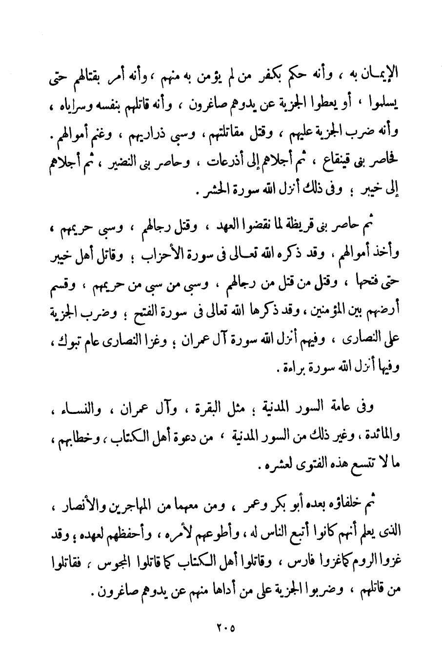 الْإِيمَانِ بِهِ وَأَنَّهُ حَكَمَ بِكُفْرِ مَنْ لَمْ يُؤْمِنْ بِهِ مِنْهُمْ وَأَنَّهُ أَمَرَ بِقِتَالِهِمْ حَتَّى يُسْلِمُوا أَوْ يُعْطُوا الْجِزْيَةَ عَنْ يَدٍ وَهُمْ صَاغِرُونَ وَأَنَّهُ قَاتَلَهُمْ بِنَفْسِهِ وَسَرَايَاهُ وَأَنَّهُ ضَرَبَ الْجِزْيَةَ عَلَيْهِمْ وَقَتَلَ مُقَاتِلَتَهُمْ وَسَبَى ذَرَارِيَّهُمْ وَغَنِمَ أَمْوَالَهُمْ. فَحَاصَرَ بَنِي قَيْنُقَاعَ ثُمَّ أَجْلَاهُمْ إلَى أذرعات وَحَاصَرَ بَنِي النَّضِيرِ ثُمَّ أَجْلَاهُمْ إلَى خَيْبَرَ؛ وَفِي ذَلِكَ أَنْزَلَ اللَّهُ سُورَةَ الْحَشْرِ. ثُمَّ حَاصَرَ بَنِي قُرَيْظَةَ لَمَّا نَقَضُوا الْعَهْدَ وَقَتَلَ رِجَالَهُمْ وَسَبَى حَرِيمَهُمْ وَأَخَذَ أَمْوَالَهُمْ وَقَدْ ذَكَرَهُ اللَّهُ تَعَالَى فِي سُورَةِ الْأَحْزَابِ؛ وَقَاتَلَ أَهْلَ خَيْبَرَ حَتَّى فَتَحَهَا وَقَتَلَ مَنْ قَتَلَ مِنْ رِجَالِهِمْ وَسَبَى مَنْ سَبَى مِنْ حَرِيمِهِمْ وَقَسَّمَ أَرْضَهُمْ بَيْنَ الْمُؤْمِنِينَ وَقَدْ ذَكَرَهَا اللَّهُ تَعَالَى فِي سُورَةِ الْفَتْحِ؛ وَضَرَبَ الْجِزْيَةَ عَلَى النَّصَارَى وَفِيهِمْ أَنْزَلَ اللَّهُ سُورَةَ آلِ عِمْرَانَ؛ وَغَزَا النَّصَارَى عَامَ تَبُوكَ وَفِيهَا أَنْزَلَ اللَّهُ سُورَةَ بَرَاءَةٍ. وَفِي عَامَّةِ السُّوَرِ الْمَدَنِيَّةِ؛ مِثْلِ الْبَقَرَةِ وَآلِ عِمْرَانَ وَالنِّسَاءِ وَالْمَائِدَةِ وَغَيْرِ ذَلِكَ مِنْ السُّوَرِ الْمَدَنِيَّةِ مِنْ دَعْوَةِ أَهْلِ الْكِتَابِ وَخِطَابِهِمْ مَا لَا تَتَّسِعُ هَذِهِ الْفَتْوَى لِعُشْرِهِ. ثُمَّ خُلَفَاؤُهُ بَعْدَهُ أَبُو بَكْرٍ وَعُمَرُ وَمَنْ مَعَهُمَا مِنْ الْمُهَاجِرِينَ وَالْأَنْصَارِ الَّذِي يُعْلَمُ أَنَّهُمْ كَانُوا أَتْبَعَ النَّاسِ لَهُ وَأَطْوَعَهُمْ لِأَمْرِهِ وَأَحْفَظَهُمْ لِعَهْدِهِ؛ وَقَدْ غَزَوْا الرُّومَ كَمَا غَزَوْا فَارِسَ وَقَاتَلُوا أَهْلَ الْكِتَابِ كَمَا قَاتَلُوا الْمَجُوسَ فَقَاتَلُوا مَنْ قَاتَلَهُمْ وَضَرَبُوا الْجِزْيَةَ عَلَى مَنْ أَدَّاهَا مِنْهُمْ عَنْ يَدٍ وَهُمْ صَاغِرُونَ.