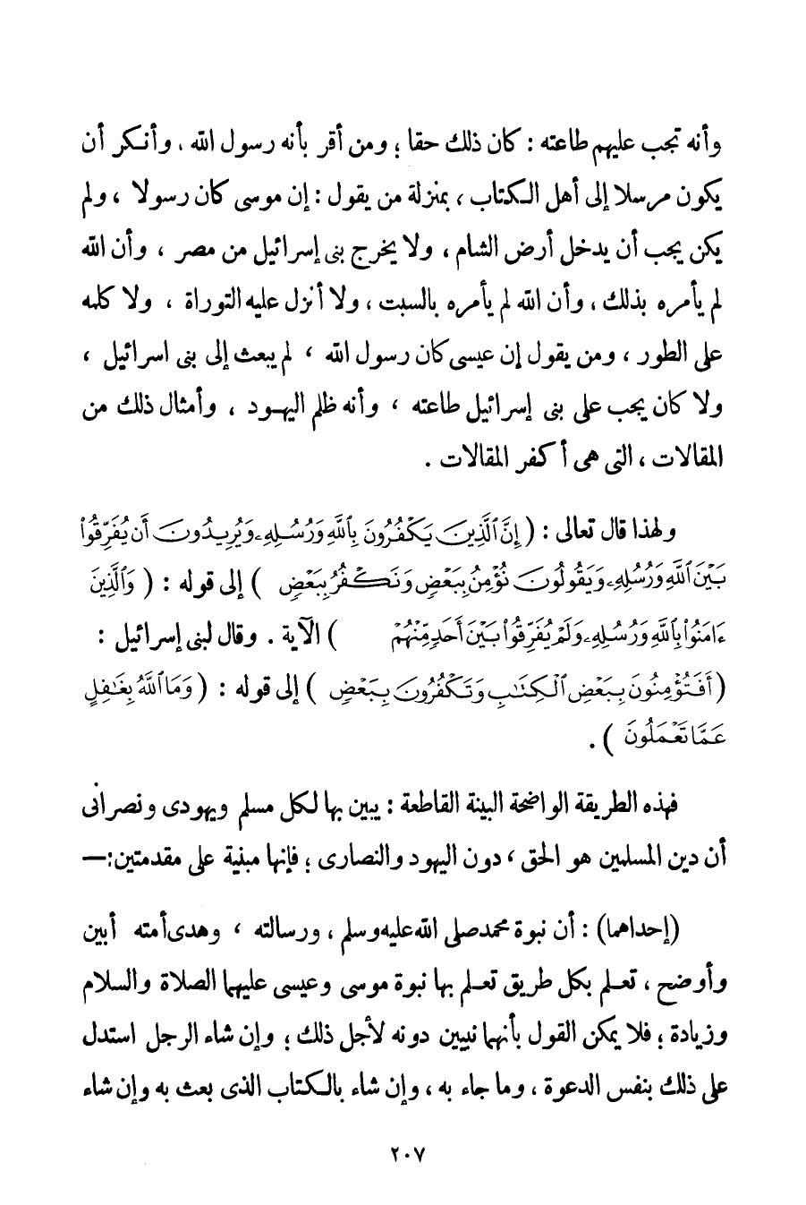 وَأَنَّهُ تَجِبُ عَلَيْهِمْ طَاعَتُهُ: كَانَ ذَلِكَ حَقًّا؛ وَمَنْ أَقَرَّ بِأَنَّهُ رَسُولُ اللَّهِ وَأَنْكَرَ أَنْ يَكُونَ مُرْسَلًا إلَى أَهْلِ الْكِتَابِ بِمَنْزِلَةِ مَنْ يَقُولُ: إنَّ مُوسَى كَانَ رَسُولًا وَلَمْ يَكُنْ يَجِبُ أَنْ يَدْخُلَ أَرْضَ الشَّامِ وَلَا يُخْرِجَ بَنِي إسْرَائِيلَ مِنْ مِصْرَ وَأَنَّ اللَّهَ لَمْ يَأْمُرْهُ بِذَلِكَ وَأَنَّ اللَّهَ لَمْ يَأْمُرْهُ بِالسَّبْتِ وَلَا أَنْزَلَ عَلَيْهِ التَّوْرَاةَ وَلَا كَلَّمَهُ عَلَى الطُّورِ وَمَنْ يَقُولُ إنَّ عِيسَى كَانَ رَسُولَ اللَّهِ لَمْ يُبْعَثْ إلَى بَنِي إسْرَائِيلَ وَلَا كَانَ يَجِبُ عَلَى بَنِي إسْرَائِيلَ طَاعَتُهُ وَأَنَّهُ ظَلَمَ الْيَهُودَ وَأَمْثَالَ ذَلِكَ مِنْ الْمَقَالَاتِ الَّتِي هِيَ أَكْفَرُ الْمَقَالَاتِ. وَلِهَذَا قَالَ تَعَالَى: {إنَّ الَّذِينَ يَكْفُرُونَ بِاللَّهِ وَرُسُلِهِ وَيُرِيدُونَ أَنْ يُفَرِّقُوا بَيْنَ اللَّهِ وَرُسُلِهِ وَيَقُولُونَ نُؤْمِنُ بِبَعْضٍ وَنَكْفُرُ بِبَعْضٍ} إلَى قَوْلِهِ: {وَالَّذِينَ آمَنُوا بِاللَّهِ وَرُسُلِهِ وَلَمْ يُفَرِّقُوا بَيْنَ أَحَدٍ مِنْهُمْ} الْآيَةَ. وَقَالَ لِبَنِي إسْرَائِيلَ: {أَفَتُؤْمِنُونَ بِبَعْضِ الْكِتَابِ وَتَكْفُرُونَ بِبَعْضٍ} إلَى قَوْلِهِ: {وَمَا اللَّهُ بِغَافِلٍ عَمَّا تَعْمَلُونَ} . فَهَذِهِ الطَّرِيقَةُ الْوَاضِحَةُ الْبَيِّنَةُ الْقَاطِعَةُ: يُبَيِّنُ بِهَا لِكُلِّ مُسْلِمٍ وَيَهُودِيٍّ وَنَصْرَانِيٍّ أَنَّ دِينَ الْمُسْلِمِينَ هُوَ الْحَقُّ دُونَ الْيَهُودِ وَالنَّصَارَى؛ فَإِنَّهَا مَبْنِيَّةٌ عَلَى مُقَدِّمَتَيْنِ: - (إحْدَاهُمَا: أَنَّ نُبُوَّةَ مُحَمَّدٍ صَلَّى اللَّهُ عَلَيْهِ وَسَلَّمَ وَرِسَالَتَهُ وَهُدَى أُمَّتِهِ أَبْيَنُ وَأَوْضَحُ تُعْلَمُ بِكُلِّ طَرِيقٍ تُعْلَمُ بِهَا نُبُوَّةُ مُوسَى وَعِيسَى عَلَيْهِمَا الصَّلَاةُ وَالسَّلَامُ وَزِيَادَةً؛ فَلَا يُمْكِنُ الْقَوْلُ بِأَنَّهُمَا نَبِيَّيْنِ دُونَهُ لِأَجْلِ ذَلِكَ؛ وَإِنْ شَاءَ الرَّجُلُ اسْتَدَلَّ عَلَى ذَلِكَ بِنَفْسِ الدَّعْوَةِ وَمَا جَاءَ بِهِ وَإِنْ شَاءَ بِالْكِتَابِ الَّذِي بُعِثَ بِهِ وَإِنْ شَاءَ