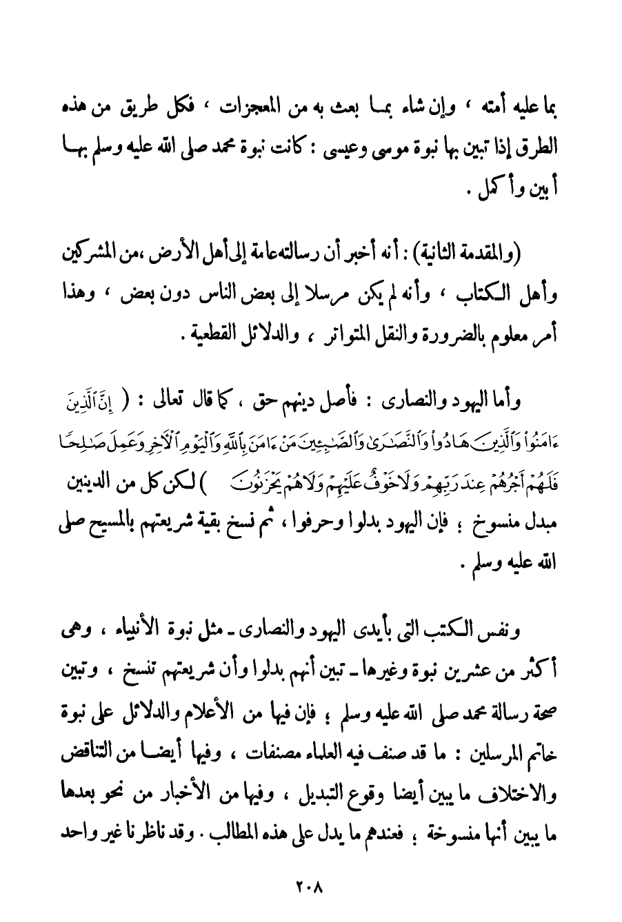 بِمَا عَلَيْهِ أُمَّتُهُ وَإِنْ شَاءَ بِمَا بُعِثَ بِهِ مِنْ الْمُعْجِزَاتِ فَكُلُّ طَرِيقٍ مِنْ هَذِهِ الطُّرُقِ إذَا تَبَيَّنَ بِهَا نُبُوَّةُ مُوسَى وَعِيسَى: كَانَتْ نُبُوَّةُ مُحَمَّدٍ صَلَّى اللَّهُ عَلَيْهِ وَسَلَّمَ بِهَا أَبْيَنَ وَأَكْمَلَ. (وَالْمُقَدِّمَةُ الثَّانِيَةُ: أَنَّهُ أَخْبَرَ أَنَّ رِسَالَتَهُ عَامَّةٌ إلَى أَهْلِ الْأَرْضِ مِنْ الْمُشْرِكِينَ وَأَهْلِ الْكِتَابِ وَأَنَّهُ لَمْ يَكُنْ مُرْسَلًا إلَى بَعْضِ النَّاسِ دُونَ بَعْضٍ وَهَذَا أَمْرٌ مَعْلُومٌ بِالضَّرُورَةِ وَالنَّقْلِ الْمُتَوَاتِرِ وَالدَّلَائِلِ الْقَطْعِيَّةِ. وَأَمَّا الْيَهُودُ وَالنَّصَارَى: فَأَصْلُ دِينِهِمْ حَقٌّ كَمَا قَالَ تَعَالَى: {إنَّ الَّذِينَ آمَنُوا وَالَّذِينَ هَادُوا وَالنَّصَارَى وَالصَّابِئِينَ مَنْ آمَنَ بِاللَّهِ وَالْيَوْمِ الْآخِرِ وَعَمِلَ صَالِحًا فَلَهُمْ أَجْرُهُمْ عِنْدَ رَبِّهِمْ وَلَا خَوْفٌ عَلَيْهِمْ وَلَا هُمْ يَحْزَنُونَ} لَكِنْ كُلٌّ مِنْ الدِّينَيْنِ مُبَدَّلٌ مَنْسُوخٌ؛ فَإِنَّ الْيَهُودَ بَدَّلُوا وَحَرَّفُوا ثُمَّ نُسِخَ بَقِيَّةُ شَرِيعَتِهِمْ بِالْمَسِيحِ صَلَّى اللَّهُ عَلَيْهِ وَسَلَّمَ. وَنَفْسُ الْكُتُبِ الَّتِي بِأَيْدِي الْيَهُودِ وَالنَّصَارَى - مِثْلُ نُبُوَّةِ الْأَنْبِيَاءِ وَهِيَ أَكْثَرُ مِنْ عِشْرِينَ نُبُوَّةً وَغَيْرُهَا - تُبَيِّنُ أَنَّهُمْ بَدَّلُوا وَأَنَّ شَرِيعَتَهُمْ تَنْسَخُ وَتُبَيِّنُ صِحَّةَ رِسَالَةِ مُحَمَّدٍ صَلَّى اللَّهُ عَلَيْهِ وَسَلَّمَ فَإِنَّ فِيهَا مِنْ الْإِعْلَامِ وَالدَّلَائِلِ عَلَى نُبُوَّةِ خَاتَمِ الْمُرْسَلِينَ: مَا قَدْ صَنَّفَ فِيهِ الْعُلَمَاءُ مُصَنَّفَاتٍ وَفِيهَا أَيْضًا مِنْ التَّنَاقُضِ وَالِاخْتِلَافِ مَا يُبَيِّنُ أَيْضًا وُقُوعَ التَّبْدِيلِ وَفِيهَا مِنْ الْأَخْبَارِ مِنْ نَحْوٍ بَعْدَهَا مَا يُبَيِّنُ أَنَّهَا مَنْسُوخَةٌ؛ فَعِنْدَهُمْ مَا يَدُلُّ عَلَى هَذِهِ الْمَطَالِبِ. وَقَدْ نَاظَرْنَا غَيْرَ وَاحِدٍ