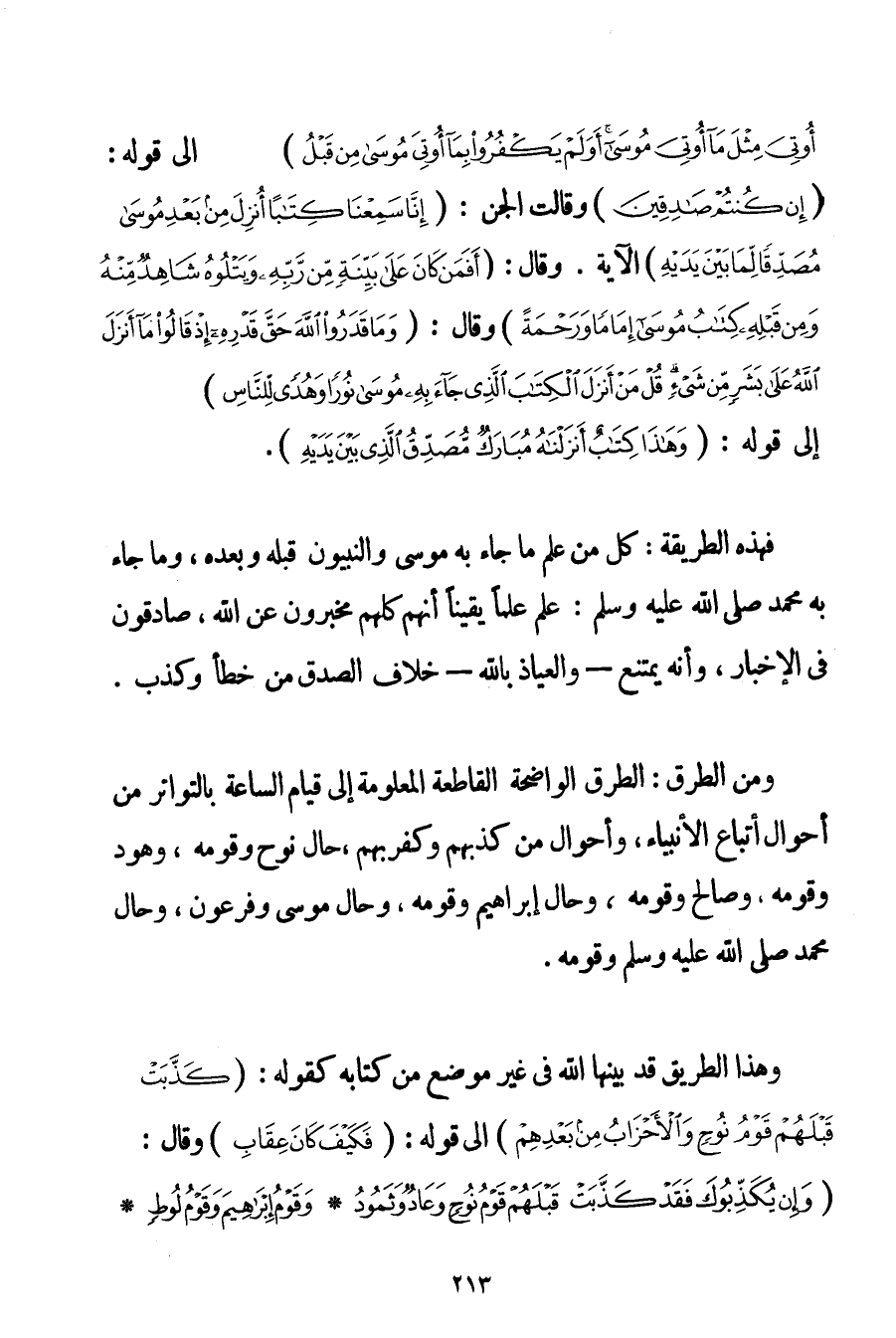 أُوتِيَ مِثْلَ مَا أُوتِيَ مُوسَى أَوَلَمْ يَكْفُرُوا بِمَا أُوتِيَ مُوسَى مِنْ قَبْلُ} إلَى قَوْلِهِ: {إنْ كُنْتُمْ صَادِقِينَ} وَقَالَتْ الْجِنُّ: {إنَّا سَمِعْنَا كِتَابًا أُنْزِلَ مِنْ بَعْدِ مُوسَى مُصَدِّقًا لِمَا بَيْنَ يَدَيْهِ} الْآيَةَ. وَقَالَ: {أَفَمَنْ كَانَ عَلَى بَيِّنَةٍ مِنْ رَبِّهِ وَيَتْلُوهُ شَاهِدٌ مِنْهُ وَمِنْ قَبْلِهِ كِتَابُ مُوسَى إمَامًا وَرَحْمَةً} وَقَالَ: {وَمَا قَدَرُوا اللَّهَ حَقَّ قَدْرِهِ إذْ قَالُوا مَا أَنْزَلَ اللَّهُ عَلَى بَشَرٍ مِنْ شَيْءٍ قُلْ مَنْ أَنْزَلَ الْكِتَابَ الَّذِي جَاءَ بِهِ مُوسَى نُورًا وَهُدًى لِلنَّاسِ} إلَى قَوْلِهِ: {وَهَذَا كِتَابٌ أَنْزَلْنَاهُ مُبَارَكٌ مُصَدِّقُ الَّذِي بَيْنَ يَدَيْهِ} . فَهَذِهِ الطَّرِيقَةُ: كُلُّ مَنْ عَلِمَ مَا جَاءَ بِهِ مُوسَى وَالنَّبِيُّونَ قَبْلَهُ وَبَعْدَهُ وَمَا جَاءَ بِهِ مُحَمَّدٌ صَلَّى اللَّهُ عَلَيْهِ وَسَلَّمَ عَلِمَ عِلْمًا يَقِينًا أَنَّهُمْ كُلَّهُمْ مُخْبِرُونَ عَنْ اللَّهِ صَادِقُونَ فِي الْإِخْبَارِ وَأَنَّهُ يَمْتَنِعُ - وَالْعِيَاذُ بِاَللَّهِ - خِلَافُ الصِّدْقِ مِنْ خَطَأٍ وَكَذِبٍ. وَمِنْ الطُّرُقِ: الطُّرُقُ الْوَاضِحَةُ الْقَاطِعَةُ الْمَعْلُومَةُ إلَى قِيَامِ السَّاعَةِ بِالتَّوَاتُرِ مِنْ أَحْوَالِ أَتْبَاعِ الْأَنْبِيَاءِ وَأَحْوَالِ مَنْ كَذَّبَهُمْ وَكَفَرَ بِهِمْ حَالِ نُوحٍ وَقَوْمِهِ وَهُودٍ وَقَوْمِهِ وَصَالِحٍ وَقَوْمِهِ وَحَالِ إبْرَاهِيمَ وَقَوْمِهِ وَحَالِ مُوسَى وَفِرْعَوْنَ وَحَالِ مُحَمَّدٍ صَلَّى اللَّهُ عَلَيْهِ وَسَلَّمَ وَقَوْمِهِ. وَهَذَا الطَّرِيقُ قَدْ بَيَّنَهَا اللَّهُ فِي غَيْرِ مَوْضِعٍ مِنْ كِتَابِهِ كَقَوْلِهِ: {كَذَّبَتْ قَبْلَهُمْ قَوْمُ نُوحٍ وَالْأَحْزَابُ مِنْ بَعْدِهِمْ} إلَى قَوْلِهِ: {فَكَيْفَ كَانَ عِقَابِ} وَقَالَ: {وَإِنْ يُكَذِّبُوكَ فَقَدْ كَذَّبَتْ قَبْلَهُمْ قَوْمُ نُوحٍ وَعَادٌ وَثَمُودُ} {وَقَوْمُ إبْرَاهِيمَ وَقَوْمُ لُوطٍ}