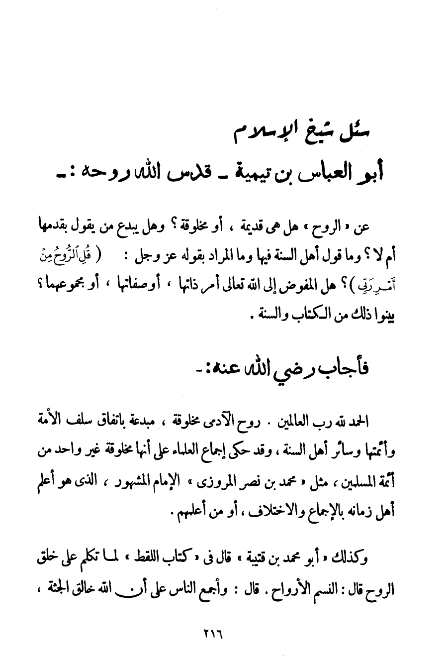 الْحَمْدُ لِلَّهِ رَبِّ الْعَالَمِينَ، رُوحُ الْآدَمِيِّ مَخْلُوقَةٌ مُبْدَعَةٌ بِاتِّفَاقِ سَلَفِ الْأُمَّةِ وَأَئِمَّتِهَا وَسَائِرِ أَهْلِ السُّنَّةِ وَقَدْ حَكَى إجْمَاعَ الْعُلَمَاءِ عَلَى أَنَّهَا مَخْلُوقَةٌ غَيْرُ وَاحِدٍ مِنْ أَئِمَّةِ الْمُسْلِمِينَ مِثْلُ " مُحَمَّدِ بْنِ نَصْرٍ الْمَرْوَزِي " الْإِمَامِ الْمَشْهُورِ الَّذِي هُوَ أَعْلَمُ أَهْلِ زَمَانِهِ بِالْإِجْمَاعِ وَالِاخْتِلَافِ أَوْ مِنْ أَعْلَمِهِمْ. وَكَذَلِكَ " أَبُو مُحَمَّدِ بْنِ قُتَيْبَةَ " قَالَ فِي " كِتَابِ اللقط " لَمَّا تَكَلَّمَ عَلَى خَلْقِ الرُّوحِ قَالَ: النَّسَمُ الْأَرْوَاحُ. قَالَ: وَأَجْمَعَ النَّاسُ عَلَى أَنَّ اللَّهَ خَالِقُ الْجُثَّةِ