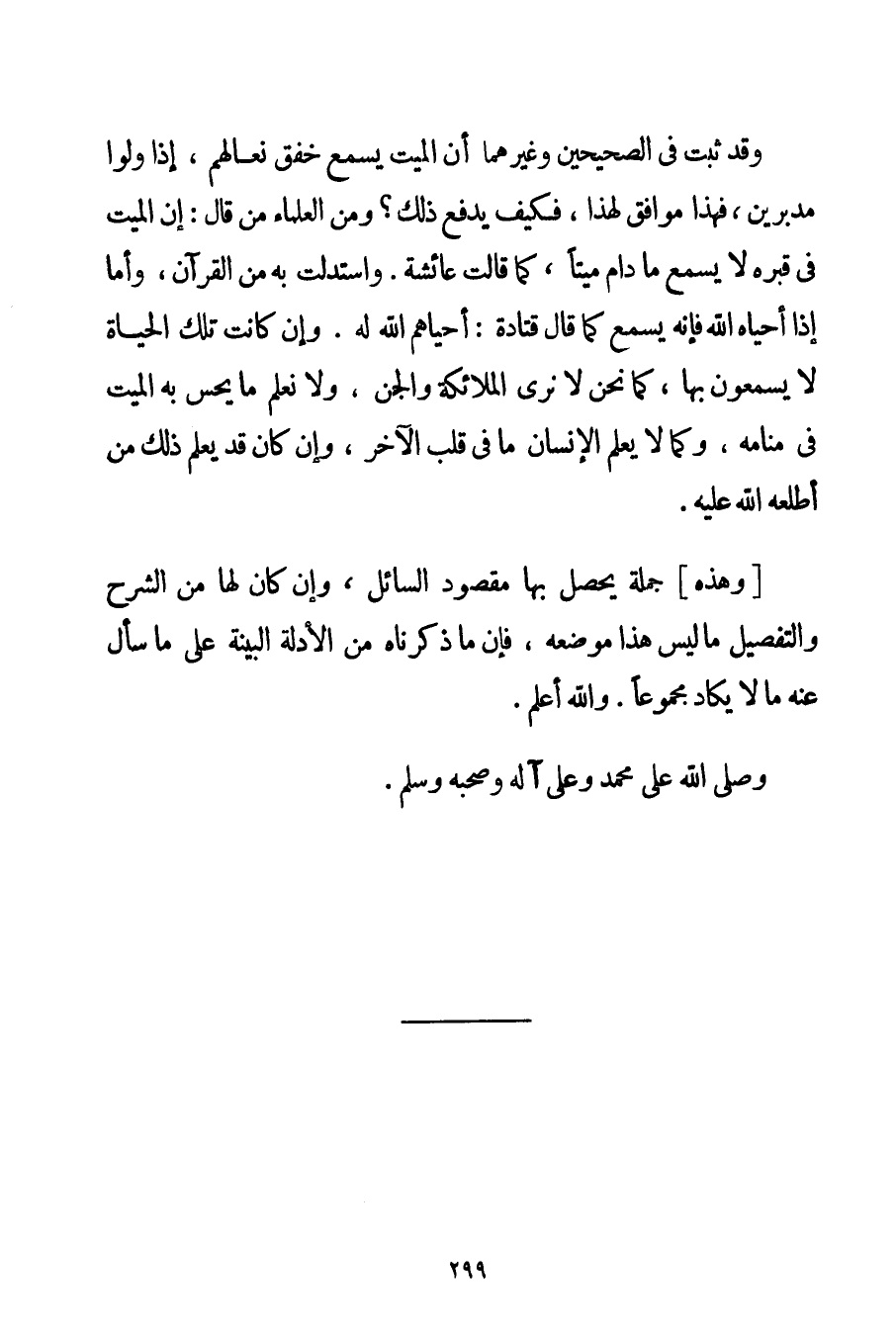 وَقَدْ ثَبَتَ فِي الصَّحِيحَيْنِ وَغَيْرِهِمَا أَنَّ الْمَيِّتَ يَسْمَعُ خَفْقَ نِعَالِهِمْ إذَا وَلَّوْا مُدْبِرِينَ فَهَذَا مُوَافِقٌ لِهَذَا فَكَيْفَ يَدْفَعُ ذَلِكَ؟ وَمِنْ الْعُلَمَاءِ مَنْ قَالَ: إنَّ الْمَيِّتَ فِي قَبْرِهِ لَا يَسْمَعُ مَا دَامَ مَيِّتًا كَمَا قَالَتْ عَائِشَةُ. وَاسْتَدَلَّتْ بِهِ مِنْ الْقُرْآنِ وَأَمَّا إذَا أَحْيَاهُ اللَّهُ فَإِنَّهُ يَسْمَعُ كَمَا قَالَ قتادة: أَحْيَاهُمْ اللَّهُ لَهُ. وَإِنْ كَانَتْ تِلْكَ الْحَيَاةُ لَا يَسْمَعُونَ بِهَا كَمَا نَحْنُ لَا نَرَى الْمَلَائِكَةَ وَالْجِنَّ وَلَا نَعْلَمُ مَا يُحِسُّ بِهِ الْمَيِّتُ فِي مَنَامِهِ وَكَمَا لَا يَعْلَمُ الْإِنْسَانُ مَا فِي قَلْبِ الْآخَرِ وَإِنْ كَانَ قَدْ يَعْلَمُ ذَلِكَ مَنْ أَطْلَعَهُ اللَّهُ عَلَيْهِ. وَهَذِهِ جُمْلَةٌ يَحْصُلُ بِهَا مَقْصُودُ السَّائِلِ وَإِنْ كَانَ لَهَا مِنْ الشَّرْحِ وَالتَّفْصِيلِ مَا لَيْسَ هَذَا مَوْضِعَهُ فَإِنَّ مَا ذَكَرْنَاهُ مِنْ الْأَدِلَّةِ الْبَيِّنَةِ عَلَى مَا سَأَلَ عَنْهُ مَا لَا يَكَادُ مَجْمُوعًا. وَاَللَّهُ أَعْلَمُ. وَصَلَّى اللَّهُ عَلَى مُحَمَّدٍ وَعَلَى آلِهِ وَصَحْبِهِ وَسَلَّمَ.
