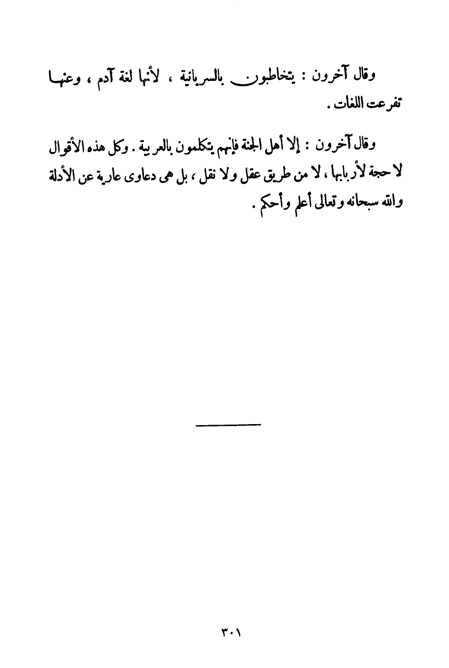 وَقَالَ آخَرُونَ: يَتَخَاطَبُونَ بِالسُّرْيانِيَّةِ لِأَنَّهَا لُغَةُ آدَمَ وَعَنْهَا تَفَرَّعَتْ اللُّغَاتُ. وَقَالَ آخَرُونَ: إلَّا أَهْلُ الْجَنَّةِ فَإِنَّهُمْ يَتَكَلَّمُونَ بِالْعَرَبِيَّةِ. وَكُلُّ هَذِهِ الْأَقْوَالِ لَا حُجَّةَ لِأَرْبَابِهَا لَا مِنْ طَرِيقِ عَقْلٍ وَلَا نَقْلٍ بَلْ هِيَ دَعَاوَى عَارِيَةٌ عَنْ الْأَدِلَّةِ وَاَللَّهُ سُبْحَانَهُ وَتَعَالَى أَعْلَمُ وَأَحْكَمُ.