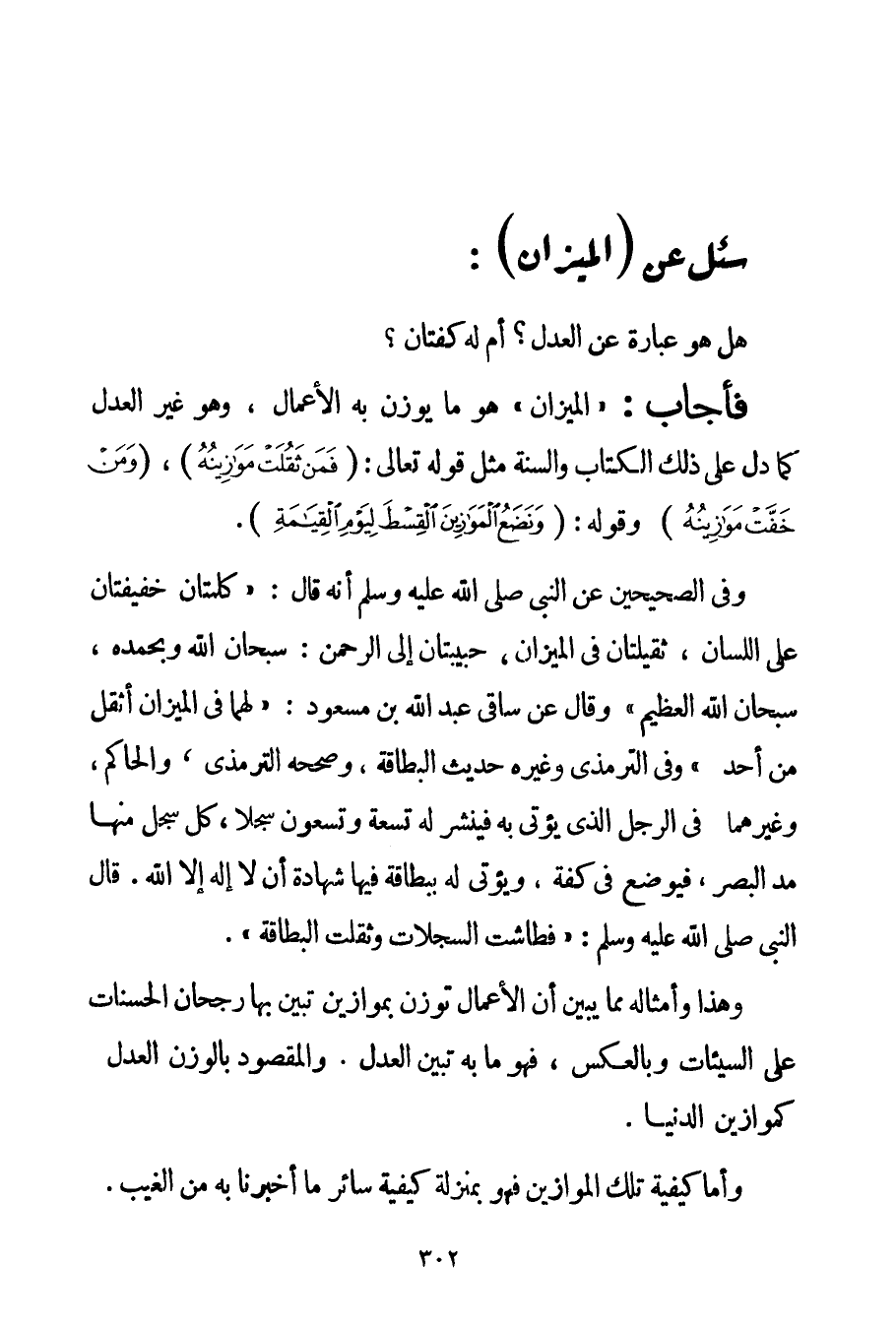 " الْمِيزَانُ " هُوَ مَا يُوزَنُ بِهِ الْأَعْمَالُ وَهُوَ غَيْرُ الْعَدْلِ كَمَا دَلَّ عَلَى ذَلِكَ الْكِتَابُ وَالسُّنَّةُ مِثْلُ قَوْله تَعَالَى {فَمَنْ ثَقُلَتْ مَوَازِينُهُ} {وَمَنْ خَفَّتْ مَوَازِينُهُ} وَقَوْلِهِ: {وَنَضَعُ الْمَوَازِينَ الْقِسْطَ لِيَوْمِ الْقِيَامَةِ} . وَفِي الصَّحِيحَيْنِ عَنْ النَّبِيِّ صَلَّى اللَّهُ عَلَيْهِ وَسَلَّمَ أَنَّهُ قَالَ: {كَلِمَتَانِ خَفِيفَتَانِ عَلَى اللِّسَانِ ثَقِيلَتَانِ فِي الْمِيزَانِ حَبِيبَتَانِ إلَى الرَّحْمَنِ: سُبْحَانَ اللَّهِ وَبِحَمْدِهِ سُبْحَانَ اللَّهِ الْعَظِيمِ} " {وَقَالَ عَنْ سَاقَيْ عَبْدِ اللَّهِ بْنِ مَسْعُودٍ: لَهُمَا فِي الْمِيزَانِ أَثْقَلُ مِنْ أُحُدٍ} وَفِي التِّرْمِذِيِّ وَغَيْرِهِ حَدِيثُ الْبِطَاقَةِ وَصَحَّحَهُ التِّرْمِذِيُّ وَالْحَاكِمُ وَغَيْرُهُمَا: {فِي الرَّجُلِ الَّذِي يُؤْتَى بِهِ فَيُنْشَرُ لَهُ تِسْعَةٌ وَتِسْعُونَ سِجِلًّا كُلُّ سِجِلٍّ مِنْهَا مَدُّ الْبَصَرِ فَيُوضَعُ فِي كِفَّةٍ وَيُؤْتَى لَهُ بِبِطَاقَةِ فِيهَا شَهَادَةُ أَنْ لَا إلَهَ إلَّا اللَّهُ. قَالَ النَّبِيُّ صَلَّى اللَّهُ عَلَيْهِ وَسَلَّمَ فَطَاشَتْ السِّجِلَّاتُ وَثَقُلَتْ الْبِطَاقَةُ} . وَهَذَا وَأَمْثَالُهُ مِمَّا يُبَيِّنُ أَنَّ الْأَعْمَالَ تُوزَنُ بِمَوَازِينَ تَبَيَّنَ بِهَا رُجْحَانُ الْحَسَنَاتِ عَلَى السَّيِّئَاتِ وَبِالْعَكْسِ فَهُوَ مَا بِهِ تَبَيَّنَ الْعَدْلُ. وَالْمَقْصُودُ بِالْوَزْنِ الْعَدْلُ كَمَوَازِينِ الدُّنْيَا. وَأَمَّا كَيْفِيَّةُ تِلْكَ الْمَوَازِينِ فَهُوَ بِمَنْزِلَةِ كَيْفِيَّةِ سَائِرِ مَا أُخْبِرْنَا بِهِ مِنْ الْغَيْبِ.