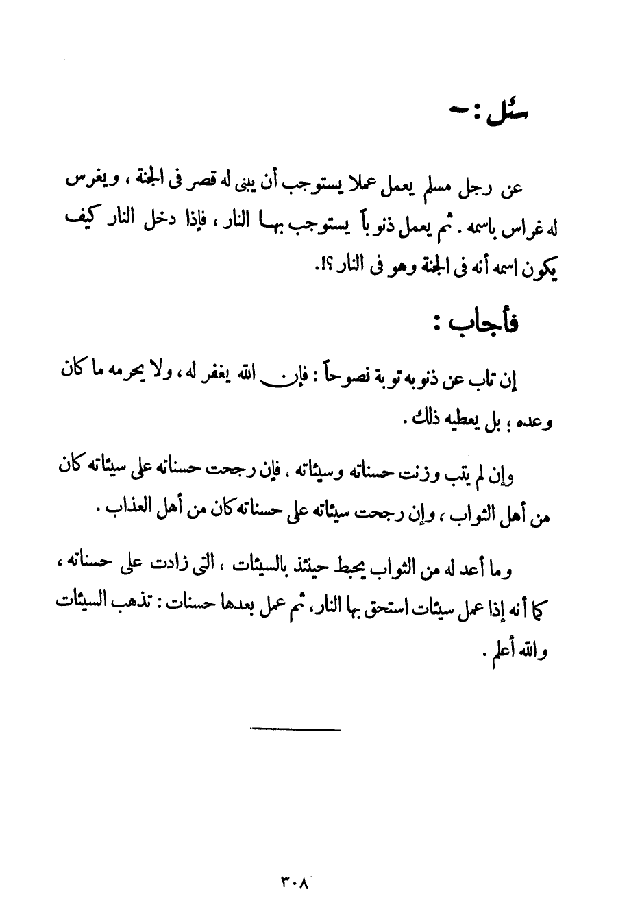 عَنْ رَجُلٍ مُسْلِمٍ يَعْمَلُ عَمَلًا يَسْتَوْجِبُ أَنْ يُبْنَى لَهُ قَصْرٌ فِي الْجَنَّةِ وَيُغْرَسُ لَهُ غِرَاسٌ بِاسْمِهِ. ثُمَّ يَعْمَلُ ذُنُوبًا يَسْتَوْجِبُ بِهَا النَّارَ فَإِذَا دَخَلَ النَّارَ كَيْفَ يَكُونُ اسْمُهُ أَنَّهُ فِي الْجَنَّةِ وَهُوَ فِي النَّارِ.