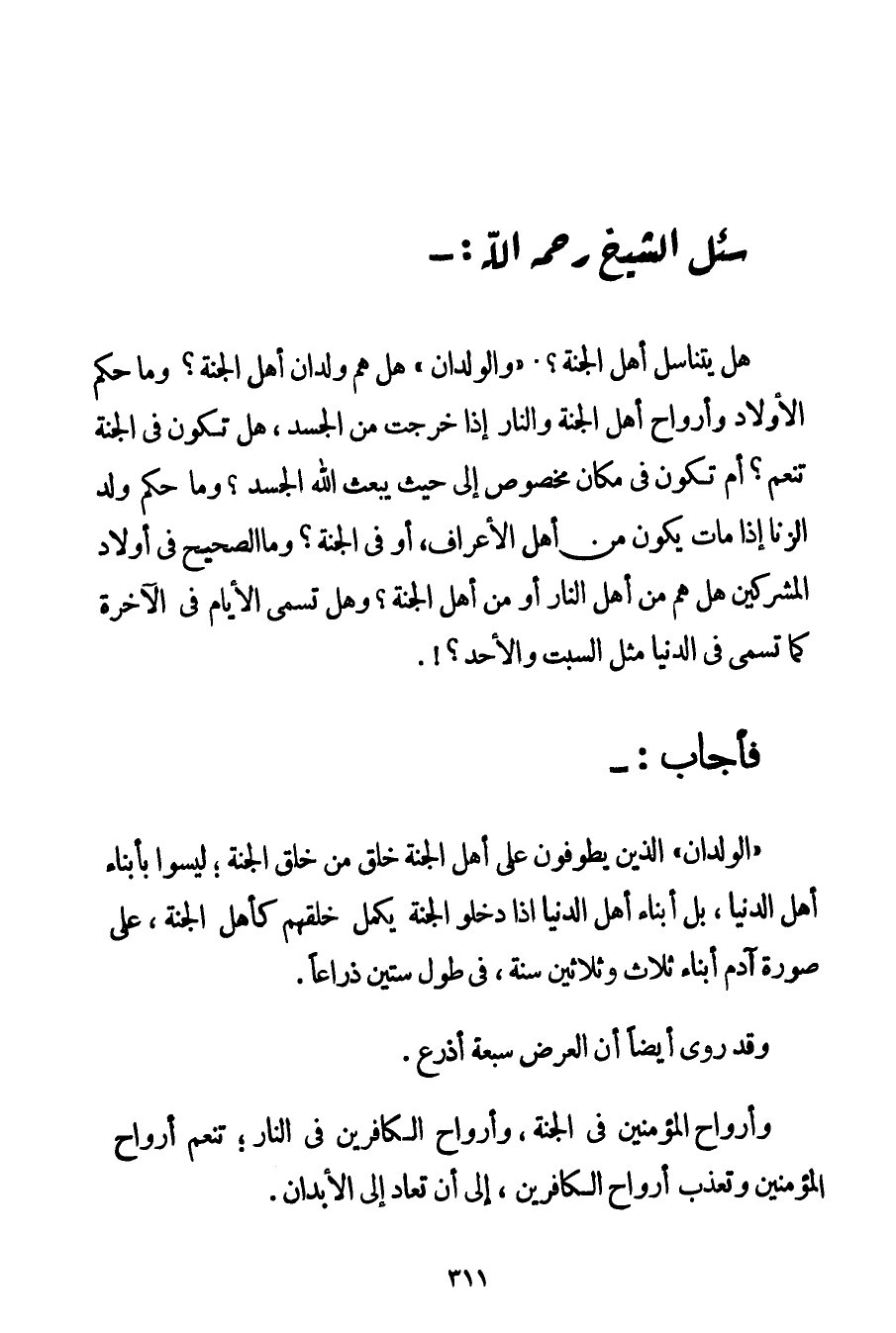 هَلْ يَتَنَاسَلُ أَهْلُ الْجَنَّةِ؟ . " وَالْوِلْدَانُ " هَلْ هُمْ وِلْدَانُ أَهْلِ الْجَنَّةِ؟ وَمَا حُكْمُ الْأَوْلَادِ وَأَرْوَاحُ أَهْلِ الْجَنَّةِ وَالنَّارِ إذَا خَرَجَتْ مِنْ الْجَسَدِ هَلْ تَكُونُ فِي الْجَنَّةِ تُنَعَّمُ؟ أَمْ تَكُونُ فِي مَكَانٍ مَخْصُوصٍ إلَى حَيْثُ يَبْعَثُ اللَّهُ الْجَسَدَ؟ وَمَا حُكْمُ وَلَدِ الزِّنَا إذَا مَاتَ يَكُونُ مِنْ أَهْلِ الْأَعْرَافِ أَوْ فِي الْجَنَّةِ؟ وَمَا الصَّحِيحُ فِي أَوْلَادِ الْمُشْرِكِينَ هَلْ هُمْ مِنْ أَهْلِ النَّارِ أَوْ مِنْ أَهْلِ الْجَنَّةِ؟ وَهَلْ تُسَمَّى الْأَيَّامُ فِي الْآخِرَةِ كَمَا تُسَمَّى فِي الدُّنْيَا مِثْلُ السَّبْتِ وَالْأَحَدِ.