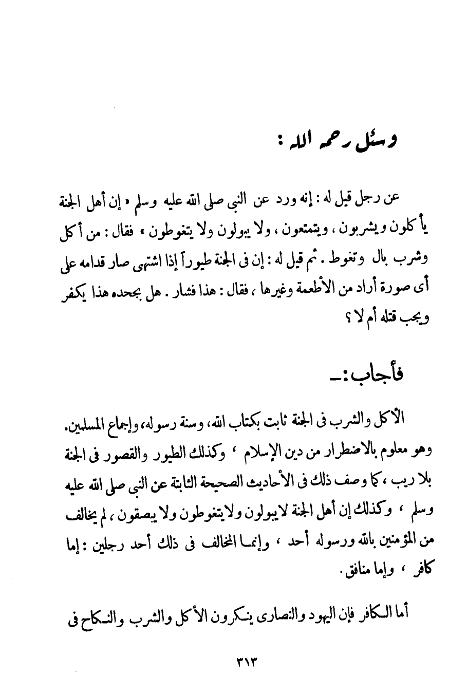 الْأَكْلُ وَالشُّرْبُ فِي الْجَنَّةِ ثَابِتٌ بِكِتَابِ اللَّهِ وَسُنَّةِ رَسُولِهِ وَإِجْمَاعِ الْمُسْلِمِينَ. وَهُوَ مَعْلُومٌ بِالِاضْطِرَارِ مِنْ دِينِ الْإِسْلَامِ وَكَذَلِكَ الطُّيُورُ وَالْقُصُورُ فِي الْجَنَّةِ بِلَا رَيْبٍ كَمَا وُصِفَ ذَلِكَ فِي الْأَحَادِيثِ الصَّحِيحَةِ الثَّابِتَةِ عَنْ النَّبِيِّ صَلَّى اللَّهُ عَلَيْهِ وَسَلَّمَ وَكَذَلِكَ إنَّ أَهْلَ الْجَنَّةِ لَا يَبُولُونَ وَلَا يَتَغَوَّطُونَ وَلَا يَبْصُقُونَ لَمْ يُخَالِفْ مِنْ الْمُؤْمِنِينَ بِاَللَّهِ وَرَسُولِهِ أَحَدٌ وَإِنَّمَا الْمُخَالِفُ فِي ذَلِكَ أَحَدُ رَجُلَيْنِ: إمَّا كَافِرٌ وَإِمَّا مُنَافِقٌ. أَمَّا الْكَافِرُ فَإِنَّ الْيَهُودَ وَالنَّصَارَى يُنْكِرُونَ الْأَكْلَ وَالشُّرْبَ وَالنِّكَاحَ فِي