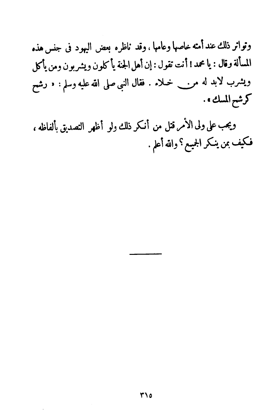 وَتَوَاتَرَ ذَلِكَ عِنْدَ أُمَّتِهِ خَاصِّهَا وَعَامِّهَا وَقَدْ نَاظَرَهُ بَعْضُ الْيَهُودِ فِي جِنْسِ هَذِهِ الْمَسْأَلَةِ وَقَالَ: {يَا مُحَمَّدُ أَنْتَ تَقُولُ: إنَّ أَهْلَ الْجَنَّةِ يَأْكُلُونَ وَيَشْرَبُونَ وَمَنْ يَأْكُلُ وَيَشْرَبُ لَا بُدَّ لَهُ مِنْ خَلَاءٍ. فَقَالَ النَّبِيُّ صَلَّى اللَّهُ عَلَيْهِ وَسَلَّمَ رَشْحٌ كَرَشْحِ الْمِسْكِ} ". وَيَجِبُ عَلَى وَلِيِّ الْأَمْرِ قَتْلُ مَنْ أَنْكَرَ ذَلِكَ وَلَوْ أَظْهَرَ التَّصْدِيقَ بِأَلْفَاظِهِ فَكَيْفَ بِمَنْ يُنْكِرُ الْجَمِيعَ؟ وَاَللَّهُ أَعْلَمُ.