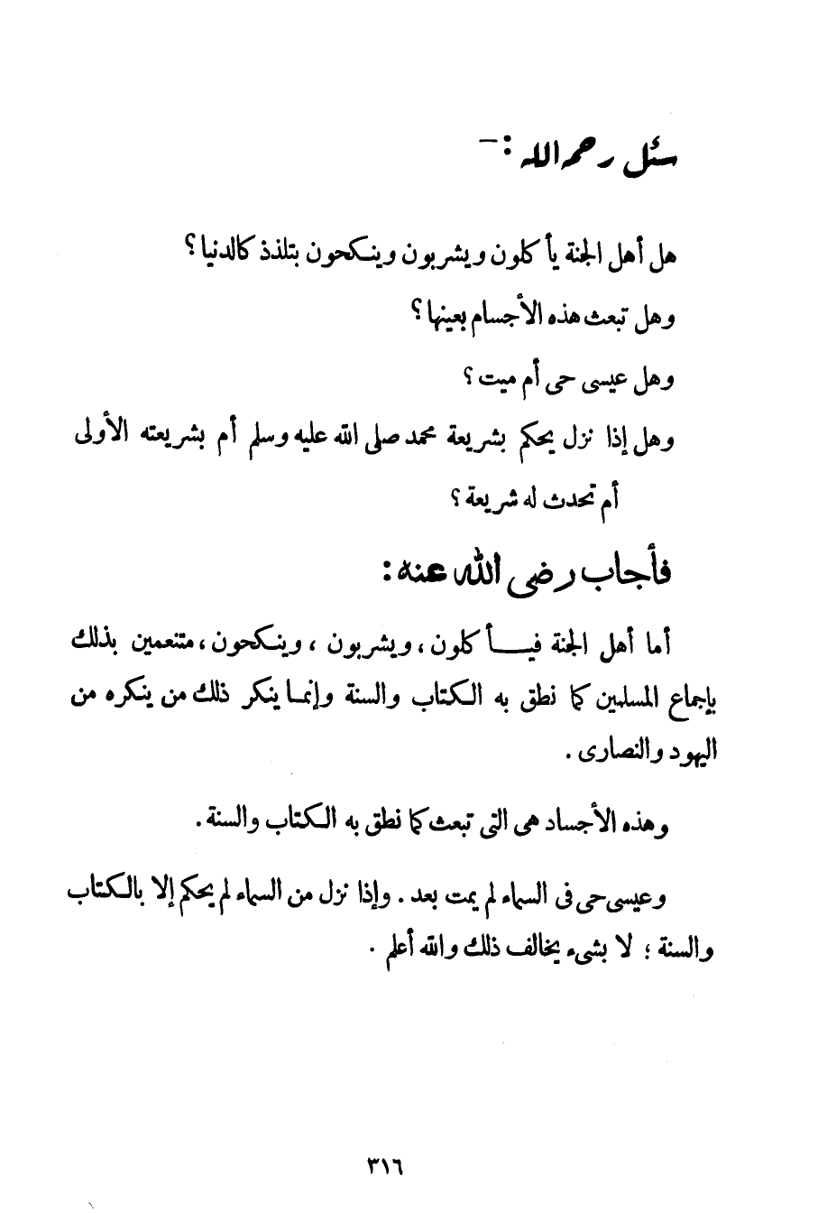 هَلْ أَهْلُ الْجَنَّةِ يَأْكُلُونَ وَيَشْرَبُونَ وَيَنْكِحُونَ بِتَلَذُّذِ كَالدُّنْيَا؟ وَهَلْ تُبْعَثُ هَذِهِ الْأَجْسَامُ بِعَيْنِهَا؟ وَهَلْ عِيسَى حَيٌّ أَمْ مَيِّتٌ؟ وَهَلْ إذَا نَزَلَ يَحْكُمُ بِشَرِيعَةِ مُحَمَّدٍ صَلَّى اللَّهُ عَلَيْهِ وَسَلَّمَ أَمْ بِشَرِيعَتِهِ الْأُولَى أَمْ تُحْدَثُ لَهُ شَرِيعَةٌ؟