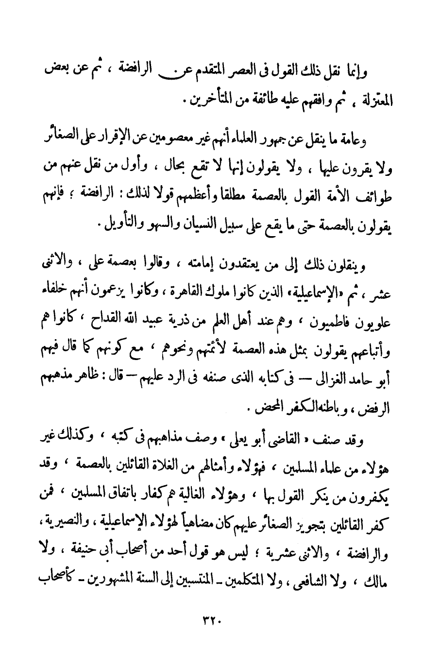 وَإِنَّمَا نُقِلَ ذَلِكَ الْقَوْلَ فِي الْعَصْرِ الْمُتَقَدِّمِ عَنْ الرَّافِضَةِ ثُمَّ عَنْ بَعْضِ الْمُعْتَزِلَةِ ثُمَّ وَافَقَهُمْ عَلَيْهِ طَائِفَةٌ مِنْ الْمُتَأَخِّرِينَ. وَعَامَّةُ مَا يُنْقَلُ عَنْ جُمْهُورِ الْعُلَمَاءِ أَنَّهُمْ غَيْرُ مَعْصُومِينَ عَنْ الْإِقْرَارِ عَلَى الصَّغَائِرِ وَلَا يُقَرُّونَ عَلَيْهَا وَلَا يَقُولُونَ إنَّهَا لَا تَقَعُ بِحَالِ وَأَوَّلُ مَنْ نُقِلَ عَنْهُمْ مِنْ طَوَائِفِ الْأُمَّةِ الْقَوْلُ بِالْعِصْمَةِ مُطْلَقًا وَأَعْظَمُهُمْ قَوْلًا لِذَلِكَ: الرَّافِضَةُ فَإِنَّهُمْ يَقُولُونَ بِالْعِصْمَةِ حَتَّى مَا يَقَعُ عَلَى سَبِيلِ النِّسْيَانِ وَالسَّهْوِ وَالتَّأْوِيلِ. وَيَنْقُلُونَ ذَلِكَ إلَى مَنْ يَعْتَقِدُونَ إمَامَتَهُ وَقَالُوا بِعِصْمَةِ عَلِيٍّ وَالِاثْنَيْ عَشَرَ ثُمَّ " الْإِسْمَاعِيلِيَّة " الَّذِينَ كَانُوا مُلُوكَ الْقَاهِرَةِ وَكَانُوا يَزْعُمُونَ أَنَّهُمْ خُلَفَاءُ عَلَوِيُّونَ فَاطِمِيُّونَ وَهُمْ عِنْدَ أَهْلِ الْعِلْمِ مِنْ ذُرِّيَّةِ عُبَيْدِ اللَّهِ الْقَدَّاحِ كَانُوا هُمْ وَأَتْبَاعُهُمْ يَقُولُونَ بِمِثْلِ هَذِهِ الْعِصْمَةِ لِأَئِمَّتِهِمْ وَنَحْوِهِمْ مَعَ كَوْنِهِمْ كَمَا قَالَ فِيهِمْ أَبُو حَامِدٍ الْغَزَالِيُّ - فِي كِتَابِهِ الَّذِي صَنَّفَهُ فِي الرَّدِّ عَلَيْهِمْ - قَالَ: ظَاهِرُ مَذْهَبِهِمْ الرَّفْضُ وَبَاطِنُهُ الْكُفْرُ الْمَحْضُ. وَقَدْ صَنَّفَ " الْقَاضِي أَبُو يَعْلَى " وَصْفَ مَذَاهِبِهِمْ فِي كُتُبِهِ وَكَذَلِكَ غَيْرُ هَؤُلَاءِ مِنْ عُلَمَاءِ الْمُسْلِمِينَ فَهَؤُلَاءِ وَأَمْثَالُهُمْ مِنْ الْغُلَاةِ الْقَائِلِينَ بِالْعِصْمَةِ وَقَدْ يُكَفِّرُونَ مَنْ يُنْكِرُ الْقَوْلَ بِهَا وَهَؤُلَاءِ الْغَالِيَةُ هُمْ كُفَّارٌ بِاتِّفَاقِ الْمُسْلِمِينَ فَمَنْ كَفَّرَ الْقَائِلِينَ بِتَجْوِيزِ الصَّغَائِرِ عَلَيْهِمْ كَانَ مُضَاهِيًا لِهَؤُلَاءِ الْإِسْمَاعِيلِيَّة وَالْنُصَيْرِيَّة وَالرَّافِضَةِ وَالِاثْنَيْ عَشَرِيَّةَ. لَيْسَ هُوَ قَوْلَ أَحَدٍ مِنْ أَصْحَابِ أَبِي حَنِيفَةَ وَلَا مَالِكٍ وَلَا الشَّافِعِيِّ وَلَا الْمُتَكَلِّمِينَ - الْمُنْتَسِبِينَ إلَى السُّنَّةِ الْمَشْهُورِينَ - كَأَصْحَابِ