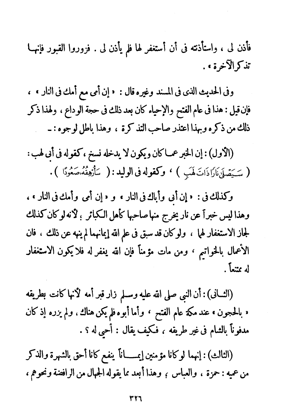 فَأَذِنَ لِي وَاسْتَأْذَنْته فِي أَنْ أَسْتَغْفِرَ لَهَا فَلَمْ يَأْذَنْ لِي. فَزُورُوا الْقُبُورَ فَإِنَّهَا تُذَكِّرُ الْآخِرَةَ} ". وَفِي الْحَدِيثِ الَّذِي فِي الْمُسْنَدِ وَغَيْرِهِ قَالَ: " {إنَّ أُمِّي مَعَ أُمِّك فِي النَّارِ} " فَإِنْ قِيلَ: هَذَا فِي عَامِ الْفَتْحِ وَالْإِحْيَاءِ كَانَ بَعْدَ ذَلِكَ فِي حَجَّةِ الْوَدَاعِ وَلِهَذَا ذَكَرَ ذَلِكَ مَنْ ذَكَرَهُ وَبِهَذَا اعْتَذَرَ صَاحِبُ التَّذْكِرَةِ وَهَذَا بَاطِلٌ لِوُجُوهِ: - (الْأَوَّلُ: إنَّ الْخَبَرَ عَمَّا كَانَ وَيَكُونُ لَا يَدْخُلُهُ نَسْخٌ كَقَوْلِهِ فِي أَبِي لَهَبٍ: {سَيَصْلَى نَارًا ذَاتَ لَهَبٍ} وَكَقَوْلِهِ فِي الْوَلِيدِ: {سَأُرْهِقُهُ صَعُودًا} . وَكَذَلِكَ فِي: " {إنَّ أَبِي وَأَبَاك فِي النَّارِ} " وَ " {إنَّ أُمِّي وَأُمَّك فِي النَّارِ} " وَهَذَا لَيْسَ خَبَرًا عَنْ نَارٍ يَخْرُجُ مِنْهَا صَاحِبُهَا كَأَهْلِ الْكَبَائِرِ؛ لِأَنَّهُ لَوْ كَانَ كَذَلِكَ لَجَازَ الِاسْتِغْفَارُ لَهُمَا وَلَوْ كَانَ قَدْ سَبَقَ فِي عِلْمِ اللَّهِ إيمَانُهُمَا لَمْ يَنْهَهُ عَنْ ذَلِكَ فَإِنَّ الْأَعْمَالَ بِالْخَوَاتِيمِ وَمَنْ مَاتَ مُؤْمِنًا فَإِنَّ اللَّهَ يَغْفِرُ لَهُ فَلَا يَكُونُ الِاسْتِغْفَارُ لَهُ مُمْتَنِعًا. (الثَّانِي: أَنَّ النَّبِيَّ صَلَّى اللَّهُ عَلَيْهِ وَسَلَّمَ زَارَ قَبْرَ أُمِّهِ لِأَنَّهَا كَانَتْ بِطَرِيقِهِ " بِالْحَجُونِ " عِنْدَ مَكَّةَ عَامَ الْفَتْحِ وَأَمَّا أَبُوهُ فَلَمْ يَكُنْ هُنَاكَ وَلَمْ يَزُرْهُ إذْ كَانَ مَدْفُونًا بِالشَّامِ فِي غَيْرِ طَرِيقِهِ فَكَيْفَ يُقَالُ: أُحْيِيَ لَهُ؟ . (الثَّالِثُ: إنَّهُمَا لَوْ كَانَا مُؤْمِنَيْنِ إيمَانًا يَنْفَعُ كَانَا أَحَقّ بِالشُّهْرَةِ وَالذِّكْرِ مِنْ عَمَّيْهِ: حَمْزَةَ وَالْعَبَّاسِ؛ وَهَذَا أَبْعَد مِمَّا يَقُولُهُ الْجُهَّالُ مِنْ الرَّافِضَةِ وَنَحْوِهِمْ