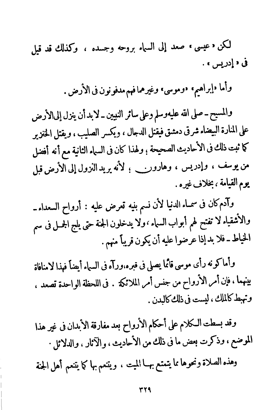 لَكِنَّ " عِيسَى " صَعِدَ إلَى السَّمَاءِ بِرُوحِهِ وَجَسَدِهِ وَكَذَلِكَ قَدْ قِيلَ فِي " إدْرِيسَ ". وَأَمَّا " إبْرَاهِيمُ " " وَمُوسَى " وَغَيْرُهُمَا فَهُمْ مَدْفُونُونَ فِي الْأَرْضِ. وَالْمَسِيحُ - صَلَّى اللَّهُ عَلَيْهِ وَسَلَّمَ وَعَلَى سَائِرِ النَّبِيِّينَ - لَا بُدَّ أَنْ يَنْزِلَ إلَى الْأَرْضِ عَلَى الْمَنَارَةِ الْبَيْضَاءِ شَرْقِيِّ دِمَشْقَ فَيَقْتُلُ الدَّجَّالَ وَيَكْسِرُ الصَّلِيبَ وَيَقْتُلُ الْخِنْزِيرَ كَمَا ثَبَتَ ذَلِكَ فِي الْأَحَادِيثِ الصَّحِيحَةِ؛ وَلِهَذَا كَانَ فِي السَّمَاءِ الثَّانِيَةِ مَعَ أَنَّهُ أَفْضَلُ مِنْ يُوسُفَ وَإِدْرِيسَ وَهَارُونَ؛ لِأَنَّهُ يُرِيدُ النُّزُولَ إلَى الْأَرْضِ قَبْلَ يَوْمِ الْقِيَامَةِ بِخِلَافِ غَيْرِهِ. وَآدَمُ كَانَ فِي سَمَاءِ الدُّنْيَا لِأَنَّ نَسَمَ بَنِيهِ تُعْرَضُ عَلَيْهِ: أَرْوَاحُ السُّعَدَاءِ - وَالْأَشْقِيَاءِ لَا تُفَتَّحُ لَهُمْ أَبْوَابُ السَّمَاءِ وَلَا يَدْخُلُونَ الْجَنَّةَ حَتَّى يَلِجَ الْجَمَلُ فِي سَمِّ الْخِيَاطِ - فَلَا بُدَّ إذَا عَرَضُوا عَلَيْهِ أَنْ يَكُونَ قَرِيبًا مِنْهُمْ. وَأَمَّا كَوْنُهُ رَأَى مُوسَى قَائِمًا يُصَلِّي فِي قَبْرِهِ وَرَآهُ فِي السَّمَاءِ أَيْضًا فَهَذَا لَا مُنَافَاةَ بَيْنَهُمَا فَإِنَّ أَمْرَ الْأَرْوَاحِ مِنْ جِنْس أَمْرِ الْمَلَائِكَةِ. فِي اللَّحْظَةِ الْوَاحِدَةِ تَصْعَدُ وَتَهْبِطُ كَالْمَلَكِ لَيْسَتْ فِي ذَلِكَ كَالْبَدَنِ. وَقَدْ بَسَطْت الْكَلَامَ عَلَى أَحْكَامِ الْأَرْوَاحِ بَعْدَ مُفَارَقَةِ الْأَبْدَانِ فِي غَيْرِ هَذَا الْمَوْضِعِ وَذَكَرْت بَعْضَ مَا فِي ذَلِكَ مِنْ الْأَحَادِيثِ وَالْآثَارِ وَالدَّلَائِلِ.