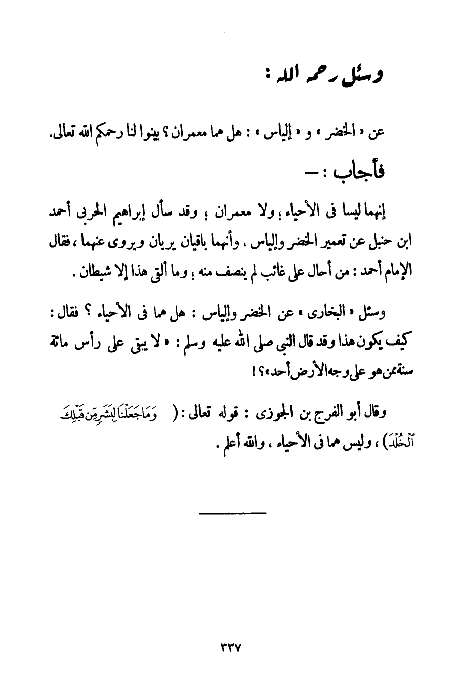 إنَّهُمَا لَيْسَا فِي الْأَحْيَاءِ؛ وَلَا مُعَمَّرَانِ (*) ؛ وَقَدْ سَأَلَ إبْرَاهِيمُ الْحَرْبِيُّ أَحْمَدَ بْنَ حَنْبَلٍ عَنْ تَعْمِيرِ الْخَضِرِ وَإِلْيَاسَ وَأَنَّهُمَا بَاقِيَانِ يَرَيَانِ وَيُرْوَى عَنْهُمَا فَقَالَ الْإِمَامُ أَحْمَدُ: مَنْ أَحَالَ عَلَى غَائِبٍ لَمْ يُنْصِفْ مِنْهُ؛ وَمَا أَلْقَى هَذَا إلَّا شَيْطَانٌ. وَسُئِلَ " الْبُخَارِيُّ " عَنْ الْخَضِرِ وَإِلْيَاسَ: هَلْ هُمَا فِي الْأَحْيَاءِ؟ فَقَالَ: كَيْفَ يَكُونُ هَذَا وَقَدْ قَالَ النَّبِيُّ صَلَّى اللَّهُ عَلَيْهِ وَسَلَّمَ {لَا يَبْقَى عَلَى رَأْسِ مِائَةِ سَنَةٍ مِمَّنْ هُوَ عَلَى وَجْهِ الْأَرْضِ أَحَدٌ} "؟ وَقَالَ أَبُو الْفَرَجِ ابْنُ الْجَوْزِيِّ: قَوْله تَعَالَى {وَمَا جَعَلْنَا لِبَشَرٍ مِنْ قَبْلِكَ الْخُلْدَ} وَلَيْسَ هُمَا فِي الْأَحْيَاءِ وَاَللَّهُ أَعْلَمُ.