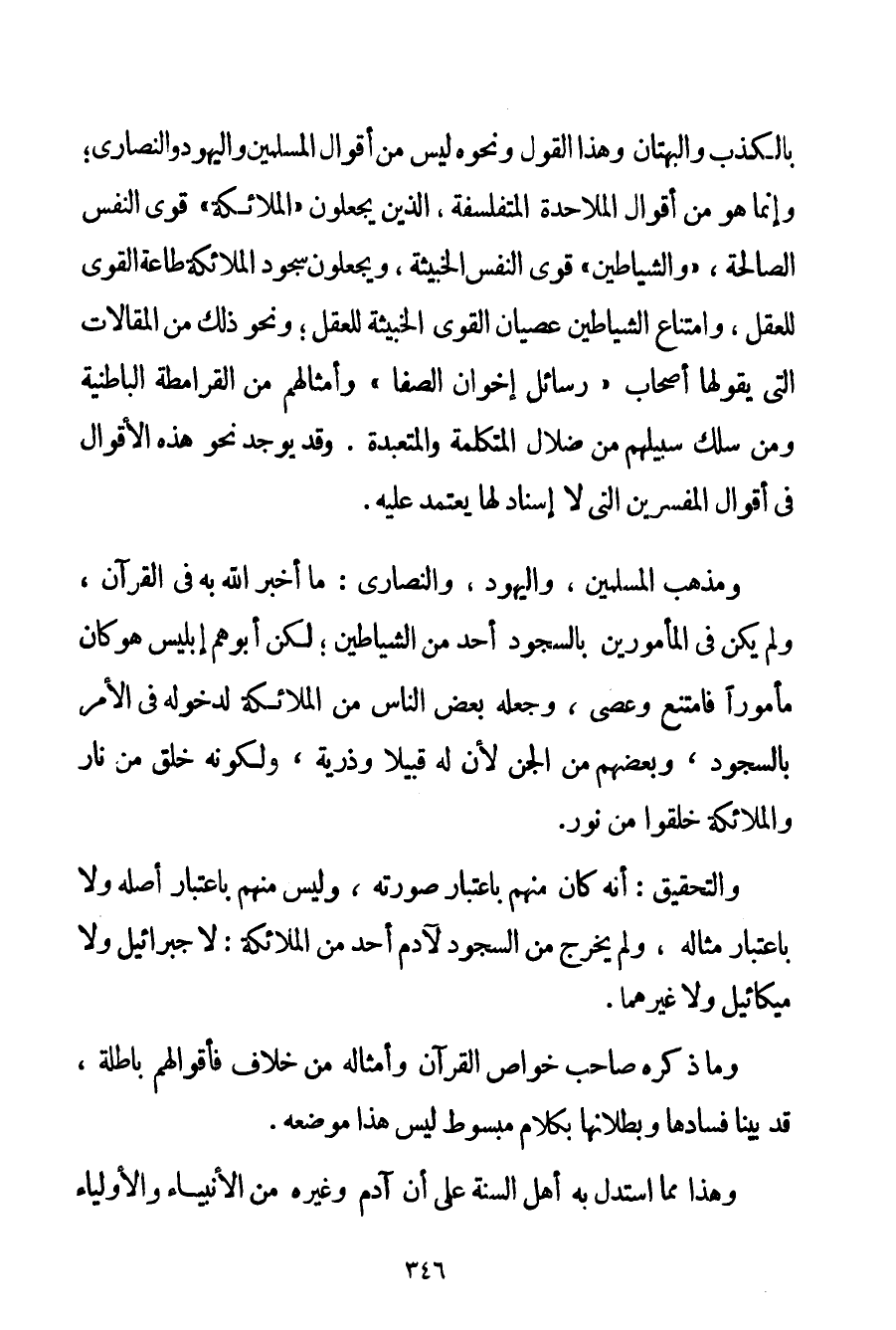 بِالْكَذِبِ وَالْبُهْتَانِ وَهَذَا الْقَوْلُ وَنَحْوُهُ لَيْسَ مِنْ أَقْوَالِ الْمُسْلِمِينَ وَالْيَهُودِ وَالنَّصَارَى؛ وَإِنَّمَا هُوَ مِنْ أَقْوَالِ الْمَلَاحِدَةِ الْمُتَفَلْسِفَةِ الَّذِينَ يَجْعَلُونَ " الْمَلَائِكَةَ " قُوَى النَّفْسِ الصَّالِحَةِ " وَالشَّيَاطِينَ " قُوَى النَّفْسِ الْخَبِيثَةِ وَيَجْعَلُونَ سُجُودَ الْمَلَائِكَةِ طَاعَةَ الْقُوَى لِلْعَقْلِ وَامْتِنَاعَ الشَّيَاطِينِ عِصْيَانَ الْقُوَى الْخَبِيثَةِ لِلْعَقْلِ؛ وَنَحْوَ ذَلِكَ مِنْ الْمَقَالَاتِ الَّتِي يَقُولُهَا أَصْحَابُ " رَسَائِلِ إخْوَانِ الصَّفَا " وَأَمْثَالُهُمْ مِنْ الْقَرَامِطَةِ الْبَاطِنِيَّةِ وَمَنْ سَلَكَ سَبِيلَهُمْ مِنْ ضُلَّالِ الْمُتَكَلِّمَةِ وَالْمُتَعَبِّدَةِ. وَقَدْ يُوجَدُ نَحْوُ هَذِهِ الْأَقْوَالِ فِي أَقْوَالِ الْمُفَسِّرِينَ الَّتِي لَا إسْنَادَ لَهَا يُعْتَمَدُ عَلَيْهِ. وَمَذْهَبُ الْمُسْلِمِينَ وَالْيَهُودِ وَالنَّصَارَى: مَا أَخْبَرَ اللَّهُ بِهِ فِي الْقُرْآنِ وَلَمْ يَكُنْ فِي الْمَأْمُورَيْنِ بِالسُّجُودِ أَحَدٌ مِنْ الشَّيَاطِينِ؛ لَكِنْ أَبُوهُمْ إبْلِيسُ هُوَ كَانَ مَأْمُورًا فَامْتَنَعَ وَعَصَى وَجَعَلَهُ بَعْضُ النَّاسِ مِنْ الْمَلَائِكَةِ لِدُخُولِهِ فِي الْأَمْرِ بِالسُّجُودِ وَبَعْضُهُمْ مِنْ الْجِنِّ لِأَنَّ لَهُ قَبِيلًا وَذُرِّيَّةً وَلِكَوْنِهِ خُلِقَ مِنْ نَارٍ وَالْمَلَائِكَةُ خُلِقُوا مِنْ نُورٍ. وَالتَّحْقِيقُ: أَنَّهُ كَانَ مِنْهُمْ بِاعْتِبَارِ صُورَتِهِ وَلَيْسَ مِنْهُمْ بِاعْتِبَارِ أَصْلِهِ وَلَا بِاعْتِبَارِ مِثَالِهِ وَلَمْ يَخْرُجْ مِنْ السُّجُودِ لِآدَمَ أَحَدٌ مِنْ الْمَلَائِكَةِ: لَا جبرائيل وَلَا ميكائيل وَلَا غَيْرُهُمَا. وَمَا ذَكَرَهُ صَاحِبُ خَوَاصِّ الْقُرْآنِ وَأَمْثَالُهُ مِنْ خِلَافٍ فَأَقْوَالُهُمْ بَاطِلَةٌ قَدْ بَيَّنَّا فَسَادَهَا وَبُطْلَانَهَا بِكَلَامِ مَبْسُوطٍ لَيْسَ هَذَا مَوْضِعَهُ. وَهَذَا مِمَّا اسْتَدَلَّ بِهِ أَهْلُ السُّنَّةِ عَلَى أَنَّ آدَمَ وَغَيْرَهُ مِنْ الْأَنْبِيَاءِ وَالْأَوْلِيَاءِ