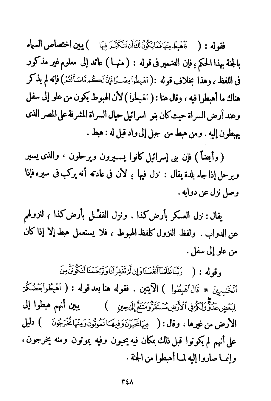 فَقَوْلُهُ: {فَاهْبِطْ مِنْهَا فَمَا يَكُونُ لَكَ أَنْ تَتَكَبَّرَ فِيهَا} يُبَيِّنُ اخْتِصَاصَ السَّمَاءِ بِالْجَنَّةِ بِهَذَا الْحُكْمِ؛ فَإِنَّ الضَّمِيرَ فِي قَوْلِهِ: {مِنْهَا} عَائِدٌ إلَى مَعْلُومٍ غَيْرِ مَذْكُورٍ فِي اللَّفْظِ وَهَذَا بِخِلَافِ قَوْلِهِ: {اهْبِطُوا مِصْرًا فَإِنَّ لَكُمْ مَا سَأَلْتُمْ} فَإِنَّهُ لَمْ يَذْكُرْ هُنَاكَ مَا أهبطوا فِيهِ وَقَالَ هُنَا: {اهْبِطُوا} لِأَنَّ الْهُبُوطَ يَكُونُ مِنْ عُلُوٍّ إلَى سُفْلٍ وَعِنْدَ أَرْضِ السَّرَاةِ حَيْثُ كَانَ بَنُو إسْرَائِيلَ حِيَالَ السَّرَاةِ الْمُشْرِفَةِ عَلَى الْمِصْرِ الَّذِي يَهْبِطُونَ إلَيْهِ وَمَنْ هَبَطَ مِنْ جَبَلٍ إلَى وَادٍ قِيلَ لَهُ: هَبَطَ. (وَأَيْضًا فَإِنَّ بَنِي إسْرَائِيلَ كَانُوا يَسِيرُونَ وَيَرْحَلُونَ وَاَلَّذِي يَسِيرُ وَيَرْحَلُ إذَا جَاءَ بَلْدَةً يُقَالُ: نَزَلَ فِيهَا؛ لِأَنَّ فِي عَادَتِهِ أَنَّهُ يَرْكَبُ فِي سَيْرِهِ فَإِذَا وَصَلَ نَزَلَ عَنْ دَوَابِّهِ. يُقَالُ: نَزَلَ الْعَسْكَرُ بِأَرْضِ كَذَا وَنَزَلَ الْقُفْلُ بِأَرْضِ كَذَا؛ لِنُزُولِهِمْ عَنْ الدَّوَابِّ. وَلَفْظُ النُّزُولِ كَلَفْظِ الْهُبُوطِ فَلَا يُسْتَعْمَلُ هَبَطَ إلَّا إذَا كَانَ مِنْ عُلُوٍّ إلَى سُفْلٍ. وَقَوْلُهُ: {رَبَّنَا ظَلَمْنَا أَنْفُسَنَا وَإِنْ لَمْ تَغْفِرْ لَنَا وَتَرْحَمْنَا لَنَكُونَنَّ مِنَ الْخَاسِرِينَ} {قَالَ اهْبِطُوا} الْآيَتَيْنِ. فَقَوْلُهُ هُنَا بَعْدَ قَوْلِهِ: {اهْبِطُوا بَعْضُكُمْ لِبَعْضٍ عَدُوٌّ وَلَكُمْ فِي الْأَرْضِ مُسْتَقَرٌّ وَمَتَاعٌ إلَى حِينٍ} يُبَيِّنُ أَنَّهُمْ هَبَطُوا إلَى الْأَرْضِ مِنْ غَيْرِهَا وَقَالَ: {فِيهَا تَحْيَوْنَ وَفِيهَا تَمُوتُونَ وَمِنْهَا تُخْرَجُونَ} دَلِيلٌ عَلَى أَنَّهُمْ لَمْ يَكُونُوا قَبْلَ ذَلِكَ بِمَكَانِ فِيهِ يَحْيَوْنَ وَفِيهِ يَمُوتُونَ وَمِنْهُ يُخْرَجُونَ وَإِنَّمَا صَارُوا إلَيْهِ لَمَّا أهبطوا مِنْ الْجَنَّةِ.