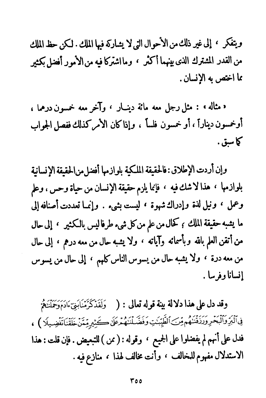 وَيَتَفَكَّرُ إلَى غَيْرِ ذَلِكَ مِنْ الْأَحْوَالِ الَّتِي لَا يُشَارِكُهُ فِيهَا الْمَلَكُ. لَكِنَّ حَظَّ الْمَلَكِ مِنْ الْقَدْرِ الْمُشْتَرَكِ الَّذِي بَيْنَهُمَا أَكْثَرُ وَمَا اشْتَرَكَا فِيهِ مِنْ الْأُمُورِ أَفْضَلُ بِكَثِيرِ مِمَّا اُخْتُصَّ بِهِ الْإِنْسَانُ. " مِثَالُهُ ": مِثْلُ رَجُلٍ مَعَهُ مِائَةُ دِينَارٍ وَآخَرُ مَعَهُ خَمْسُونَ دِرْهَمًا أَوْ خَمْسُونَ دِينَارًا أَوْ خَمْسُونَ فَلْسًا وَإِذَا كَانَ الْأَمْرُ كَذَلِكَ فَفَصْلُ الْجَوَابِ كَمَا سَبَقَ. وَإِنْ أَرَدْت الْإِطْلَاقَ: فَالْحَقِيقَةُ الْمَلَكِيَّةُ بِلَوَازِمِهَا أَفْضَلُ مِنْ الْحَقِيقَةِ الْإِنْسَانِيَّةِ بِلَوَازِمِهَا هَذَا لَا شَكَّ فِيهِ فَإِنَّمَا يَلْزَمُ حَقِيقَةُ الْإِنْسَانِ مِنْ حَيَاةٍ وَحِسٍّ وَعِلْمٍ وَعَمَلٍ وَنَيْلِ لَذَّةٍ وَإِدْرَاكِ شَهْوَةٍ لَيْسَتْ بِشَيْءِ. وَإِنَّمَا تَعَدَّدَتْ أَصْنَافُهُ إلَى مَا يُشْبِهُ حَقِيقَةَ الْمَلَكِ؛ كَحَالِ مَنْ عَلِمَ مِنْ كُلِّ شَيْءٍ طَرَفًا لَيْسَ بِالْكَثِيرِ إلَى حَالِ مَنْ أَتْقَنَ الْعِلْمَ بِاَللَّهِ وَبِأَسْمَائِهِ وَآيَاتِهِ وَلَا يُشْبِهُ حَالَ مَنْ مَعَهُ دِرْهَمٌ إلَى حَالِ مَنْ مَعَهُ دُرَّةٌ وَلَا يُشْبِهُ حَالَ مَنْ يَسُوسُ النَّاسَ كُلَّهُمْ إلَى حَالِ مَنْ يَسُوسُ إنْسَانًا وَفَرَسًا. وَقَدْ دَلَّ عَلَى هَذَا دَلَالَةً بَيِّنَةً قَوْله تَعَالَى {وَلَقَدْ كَرَّمْنَا بَنِي آدَمَ وَحَمَلْنَاهُمْ فِي الْبَرِّ وَالْبَحْرِ وَرَزَقْنَاهُمْ مِنَ الطَّيِّبَاتِ وَفَضَّلْنَاهُمْ عَلَى كَثِيرٍ مِمَّنْ خَلَقْنَا تَفْضِيلًا} فَدَلَّ عَلَى أَنَّهُمْ لَمْ يُفَضِّلُوا عَلَى الْجَمِيعِ وَقَوْلُهُ: {مِمَّنْ} لِلتَّبْعِيضِ. فَإِنْ قُلْت: هَذَا الِاسْتِدْلَالُ مَفْهُومٌ لِلْمُخَالِفِ وَأَنْتَ مُخَالِفٌ لِهَذَا مُنَازِعٌ فِيهِ.