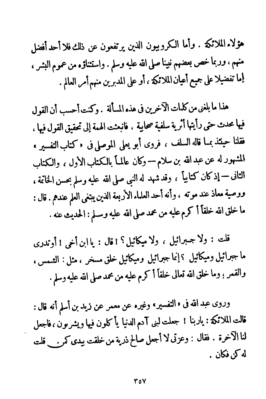 مِنْ هَؤُلَاءِ الْمَلَائِكَةِ. وَأَمَّا الكروبيون الَّذِينَ يَرْتَفِعُونَ عَنْ ذَلِكَ فَلَا أَحَدَ أَفْضَلُ مِنْهُمْ وَرُبَّمَا خَصَّ بَعْضُهُمْ نَبِيَّنَا صَلَّى اللَّهُ عَلَيْهِ وَسَلَّمَ. وَاسْتِثْنَاؤُهُ مِنْ عُمُومِ الْبَشَرِ إمَّا تَفْضِيلًا عَلَى جَمِيعِ أَعْيَانِ الْمَلَائِكَةِ أَوْ عَلَى الْمُدَبِّرِينَ مِنْهُمْ أَمْرَ الْعَالَمِ. هَذَا مَا بَلَغَنِي مِنْ كَلِمَاتِ الْآخَرِينَ فِي هَذِهِ الْمَسْأَلَةِ. وَكُنْت أَحْسَبُ أَنَّ الْقَوْلَ فِيهَا مُحْدَثٌ حَتَّى رَأَيْتهَا أَثَرِيَّةً سَلَفِيَّةً صَحَابِيَّةً فَانْبَعَثَتْ الْهِمَّةُ إلَى تَحْقِيقِ الْقَوْلِ فِيهَا فَقُلْنَا حِينَئِذٍ بِمَا قَالَهُ السَّلَف فَرَوَى أَبُو يَعْلَى الموصلي فِي " كِتَابِ التَّفْسِيرِ " الْمَشْهُورِ لَهُ عَنْ عَبْدِ اللَّهِ بْنِ سَلَامٍ - وَكَانَ عَالِمًا بِالْكِتَابِ الْأَوَّلِ وَالْكِتَابِ الثَّانِي - إذْ كَانَ كِتَابِيًّا وَقَدْ شَهِدَ لَهُ النَّبِيُّ صَلَّى اللَّهُ عَلَيْهِ وَسَلَّمَ بِحُسْنِ الْخَاتِمَةِ وَوَصِيَّةُ مُعَاذٍ عِنْدَ مَوْتِهِ وَأَنَّهُ أَحَدُ الْعُلَمَاءِ الْأَرْبَعَةِ الَّذِينَ يُبْتَغَى الْعِلْمُ عِنْدَهُمْ. قَالَ: مَا خَلَقَ اللَّهُ خَلْقًا أَكْرَمَ عَلَيْهِ مِنْ مُحَمَّدٍ صَلَّى اللَّهُ عَلَيْهِ وَسَلَّمَ الْحَدِيثُ عَنْهُ. قُلْت: وَلَا جبرائيل وَلَا ميكائيل قَالَ: يَا ابْنَ أَخِي أَوَتَدْرِي مَا جبرائيل وميكائيل؟ إنَّمَا جبرائيل وميكائيل خَلْقٌ مُسَخَّرٌ مِثْلُ: الشَّمْسِ وَالْقَمَرِ؛ وَمَا خَلَقَ اللَّهُ تَعَالَى خَلْقًا أَكْرَمَ عَلَيْهِ مِنْ مُحَمَّدٍ صَلَّى اللَّهُ عَلَيْهِ وَسَلَّمَ. وَرَوَى عَبْدُ اللَّهِ فِي " التَّفْسِيرِ " (*) وَغَيْرِهِ عَنْ مَعْمَرٍ عَنْ زَيْدِ بْنِ أَسْلَمَ أَنَّهُ قَالَ: {قَالَتْ الْمَلَائِكَةُ: يَا رَبَّنَا جَعَلْت لِبَنِي آدَمَ الدُّنْيَا يَأْكُلُونَ فِيهَا وَيَشْرَبُونَ فَاجْعَلْ لَنَا الْآخِرَةَ. فَقَالَ: وَعِزَّتِي لَا أَجْعَلُ صَالِحَ ذَرِّيَّةِ مَنْ خَلَقْت بِيَدَيَّ كَمَنْ قُلْت لَهُ كُنْ فَكَانَ} .
