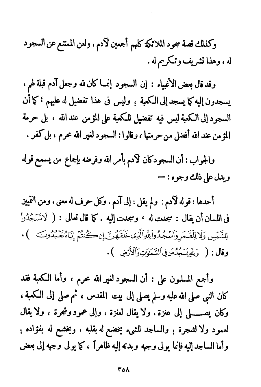 وَكَذَلِكَ قِصَّةُ سُجُودِ الْمَلَائِكَةِ كُلِّهِمْ أَجْمَعِينَ لِآدَمَ وَلَعْنُ الْمُمْتَنِعِ عَنْ السُّجُودِ لَهُ وَهَذَا تَشْرِيفٌ وَتَكْرِيمٌ لَهُ. وَقَدْ قَالَ بَعْضُ الْأَغْبِيَاءِ: إنَّ السُّجُودَ إنَّمَا كَانَ لِلَّهِ وَجَعْلِ آدَمَ قِبْلَةً لَهُمْ يَسْجُدُونَ إلَيْهِ كَمَا يَسْجُدُ إلَى الْكَعْبَةِ؛ وَلَيْسَ فِي هَذَا تَفْضِيلٌ لَهُ عَلَيْهِمْ؛ كَمَا أَنَّ السُّجُودَ إلَى الْكَعْبَةِ لَيْسَ فِيهِ تَفْضِيلٌ لِلْكَعْبَةِ عَلَى الْمُؤْمِنِ عِنْدَ اللَّهِ بَلْ حُرْمَةُ الْمُؤْمِنِ عِنْدَ اللَّهِ أَفْضَلُ مِنْ حُرْمَتِهَا وَقَالُوا: السُّجُودُ لِغَيْرِ اللَّهِ مُحَرَّمٌ بَلْ كُفْرٌ. وَالْجَوَابُ: أَنَّ السُّجُودَ كَانَ لِآدَمَ بِأَمْرِ اللَّهِ وَفَرْضِهِ بِإِجْمَاعِ مَنْ يُسْمَعُ قَوْلُهُ وَيَدُلُّ عَلَى ذَلِكَ وُجُوهٌ: - أَحَدُهَا: قَوْلُهُ لِآدَمَ: وَلَمْ يَقُلْ: إلَى آدَمَ. وَكُلُّ حَرْفٍ لَهُ مَعْنَى وَمِنْ التَّمْيِيزِ فِي اللِّسَانِ أَنْ يُقَالَ: سَجَدْت لَهُ وَسَجَدْت إلَيْهِ. كَمَا قَالَ تَعَالَى: {لَا تَسْجُدُوا لِلشَّمْسِ وَلَا لِلْقَمَرِ وَاسْجُدُوا لِلَّهِ الَّذِي خَلَقَهُنَّ إنْ كُنْتُمْ إيَّاهُ تَعْبُدُونَ} وَقَالَ {وَلِلَّهِ يَسْجُدُ مَنْ فِي السَّمَاوَاتِ وَالْأَرْضِ} .