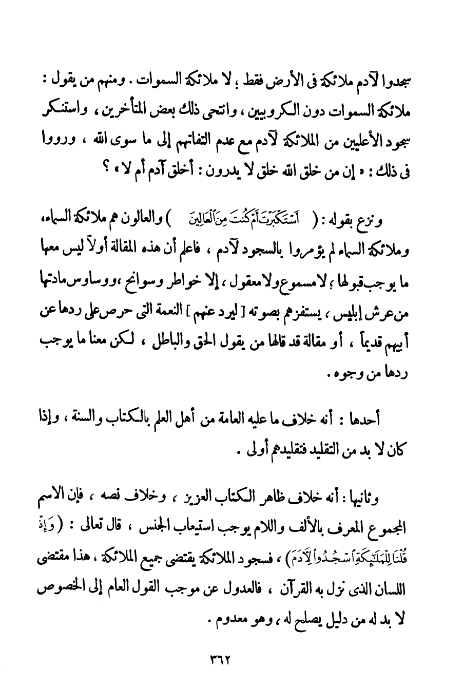 سَجَدُوا لِآدَمَ مَلَائِكَةٌ فِي الْأَرْضِ فَقَطْ؛ لَا مَلَائِكَةُ السَّمَوَاتِ. وَمِنْهُمْ مَنْ يَقُولُ: مَلَائِكَةُ السَّمَوَاتِ دُونَ الكروبيين وَانْتَحَى ذَلِكَ بَعْضُ الْمُتَأَخِّرِينَ وَاسْتَنْكَرَ سُجُودَ الْأَعْلَيَيْنِ مِنْ الْمَلَائِكَةِ لِآدَمَ مَعَ عَدَمِ الْتِفَاتِهِمْ إلَى مَا سِوَى اللَّهِ وَرَوَوْا فِي ذَلِكَ: " إنَّ مِنْ خَلْقِ اللَّهِ خَلْقٌ لَا يَدْرُونَ: أَخُلِقَ آدَمَ أَمْ لَا "؟ وَنَزَعَ بِقَوْلِهِ: {أَسْتَكْبَرْتَ أَمْ كُنْتَ مِنَ الْعَالِينَ} وَالْعَالُونَ هُمْ مَلَائِكَةُ السَّمَاءِ وَمَلَائِكَةُ السَّمَاءِ لَمْ يُؤْمَرُوا بِالسُّجُودِ لِآدَمَ فَاعْلَمْ أَنَّ هَذِهِ الْمَقَالَةَ أَوَّلًا لَيْسَ مَعَهَا مَا يُوجِبُ قَبُولَهَا؛ لَا مَسْمُوعٌ وَلَا مَعْقُولٌ إلَّا خَوَاطِرُ وَسَوَانِحُ وَوَسَاوِسُ مَادَّتُهَا مِنْ عَرْشِ إبْلِيسَ يَسْتَفِزُّهُمْ بِصَوْتِهِ لِيَرُدَّ عَنْهُمْ النِّعْمَةَ الَّتِي حَرَصَ عَلَى رَدِّهَا عَنْ أَبِيهِمْ قَدِيمًا أَوْ مَقَالَةٌ قَدْ قَالَهَا مَنْ يَقُولُ الْحَقَّ وَالْبَاطِلَ لَكِنَّ مَعَنَا مَا يُوجِبُ رَدَّهَا مِنْ وُجُوهٍ. أَحَدُهَا: أَنَّهُ خِلَافَ مَا عَلَيْهِ الْعَامَّةُ مِنْ أَهْلِ الْعِلْمِ بِالْكِتَابِ وَالسُّنَّةِ وَإِذَا كَانَ لَا بُدَّ مِنْ التَّقْلِيدِ فَتَقْلِيدُهُمْ أَوْلَى. وَثَانِيهَا: أَنَّهُ خِلَافُ ظَاهِرِ الْكِتَابِ الْعَزِيزِ وَخِلَافُ نَصِّهِ فَإِنَّ الِاسْمَ الْمَجْمُوعَ الْمُعَرَّفَ بِالْأَلِفِ وَاللَّامِ يُوجِبُ اسْتِيعَابَ الْجِنْسِ قَالَ تَعَالَى: {وَإِذْ قُلْنَا لِلْمَلَائِكَةِ اسْجُدُوا لِآدَمَ} فَسُجُودُ الْمَلَائِكَةِ يَقْتَضِي جَمِيعَ الْمَلَائِكَةِ هَذَا مُقْتَضَى اللِّسَانِ الَّذِي نَزَلَ بِهِ الْقُرْآنُ فَالْعُدُولُ عَنْ مُوجِبِ الْقَوْلِ الْعَامِّ إلَى الْخُصُوصِ لَا بُدَّ لَهُ مِنْ دَلِيلٍ يَصْلُحُ لَهُ وَهُوَ مَعْدُومٌ.