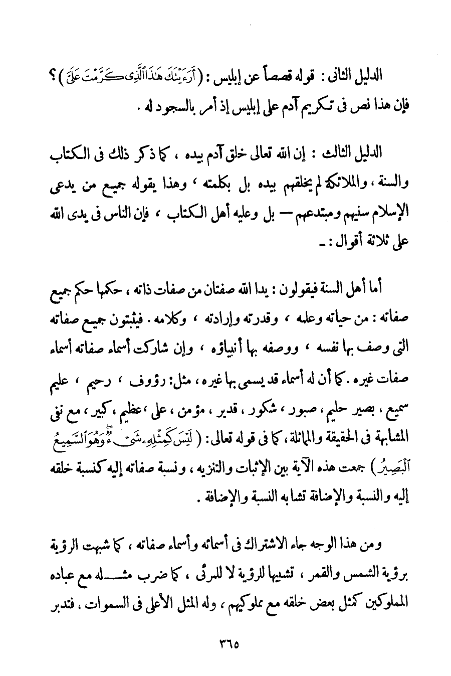 الدَّلِيلُ الثَّانِي: قَوْلُهُ قَصَصًا عَنْ إبْلِيسَ: {أَرَأَيْتَكَ هَذَا الَّذِي كَرَّمْتَ عَلَيَّ} ؟ . فَإِنَّ هَذَا نَصٌّ فِي تَكْرِيمِ آدَمَ عَلَى إبْلِيسَ إذْ أُمِرَ بِالسُّجُودِ لَهُ. الدَّلِيلُ الثَّالِثُ: إنَّ اللَّهَ تَعَالَى خَلَقَ آدَمَ بِيَدِهِ كَمَا ذَكَرَ ذَلِكَ فِي الْكِتَابِ وَالسُّنَّةِ وَالْمَلَائِكَةُ لَمْ يَخْلُقْهُمْ بِيَدِهِ بَلْ بِكَلِمَتِهِ وَهَذَا يَقُولُهُ جَمِيعُ مَنْ يَدَّعِي الْإِسْلَامَ سُنِّيُّهُمْ وَمُبْتَدِعُهُمْ - بَلْ وَعَلَيْهِ أَهْلُ الْكِتَابِ فَإِنَّ النَّاسَ فِي يَدَيْ اللَّهِ عَلَى ثَلَاثَةِ أَقْوَالٍ: - أَمَّا أَهْلُ السُّنَّةِ فَيَقُولُونَ: يَدَا اللَّهِ صِفَتَانِ مِنْ صِفَاتِ ذَاتِهِ حُكْمُهَا حُكْمُ جَمِيعِ صِفَاتِهِ: مِنْ حَيَاتِهِ وَعِلْمِهِ وَقُدْرَتِهِ وَإِرَادَتِهِ وَكَلَامِهِ. فَيُثْبِتُونَ جَمِيعَ صِفَاتِهِ الَّتِي وَصَفَ بِهَا نَفْسَهُ وَوَصَفَهُ بِهَا أَنْبِيَاؤُهُ وَإِنْ شَارَكَتْ أَسْمَاءُ صِفَاتِهِ أَسْمَاءَ صِفَاتِ غَيْرِهِ. كَمَا أَنَّ لَهُ أَسْمَاءً قَدْ يُسَمَّى بِهَا غَيْرُهُ مِثْلُ: رَءُوفٌ رَحِيمٌ عَلِيمٌ سَمِيعٌ بَصِيرٌ حَلِيمٌ صَبُورٌ شَكُورٌ قَدِيرٌ مُؤْمِنٌ عَلِيٌّ عَظِيمٌ كَبِيرٌ مَعَ نَفْيِ الْمُشَابَهَةِ فِي الْحَقِيقَةِ وَالْمُمَاثَلَةِ كَمَا فِي قَوْله تَعَالَى {لَيْسَ كَمِثْلِهِ شَيْءٌ وَهُوَ السَّمِيعُ الْبَصِيرُ} جَمَعَتْ هَذِهِ الْآيَةُ بَيْنَ الْإِثْبَاتِ وَالتَّنْزِيهِ وَنِسْبَةُ صِفَاتِهِ إلَيْهِ كَنِسْبَةِ خَلْقِهِ إلَيْهِ وَالنِّسْبَةُ وَالْإِضَافَةُ تُشَابِهُ النِّسْبَةَ وَالْإِضَافَةَ. وَمِنْ هَذَا الْوَجْهِ جَاءَ الِاشْتِرَاكُ فِي أَسْمَائِهِ وَأَسْمَاءِ صِفَاتِهِ كَمَا شُبِّهَتْ الرُّؤْيَةُ بِرُؤْيَةِ الشَّمْسِ وَالْقَمَرِ تَشْبِيهًا لِلرُّؤْيَةِ لَا لِلْمَرْئِيِّ كَمَا ضَرَبَ مَثَلَهُ مَعَ عِبَادِهِ الْمَمْلُوكِينَ كَمَثَلِ بَعْضِ خَلْقِهِ مَعَ مَمْلُوكِيهِمْ وَلَهُ الْمَثَلُ الْأَعْلَى فِي السَّمَوَاتِ فَتَدَبَّرْ