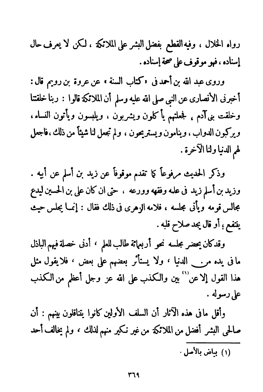 رَوَاهُ الْخَلَّالُ وَفِيهِ الْقَطْعُ بِفَضْلِ الْبَشَرِ عَلَى الْمَلَائِكَةِ لَكِنْ لَا يُعْرَفُ حَالُ إسْنَادِهِ فَهُوَ مَوْقُوفٌ عَلَى صِحَّةِ إسْنَادِهِ. وَرَوَى عَبْدُ اللَّهِ بْنُ أَحْمَدَ فِي " كِتَابِ السُّنَّةِ " عَنْ عُرْوَةَ بْنِ رويم قَالَ: أَخْبَرَنِي الْأَنْصَارِيُّ عَنْ النَّبِيِّ صَلَّى اللَّهُ عَلَيْهِ وَسَلَّمَ {أَنَّ الْمَلَائِكَةَ قَالُوا: رَبَّنَا خَلَقْتنَا وَخَلَقْت بَنِي آدَمَ فَجَعَلْتهمْ يَأْكُلُونَ وَيَشْرَبُونَ وَيَلْبَسُونَ وَيَأْتُونَ النِّسَاءَ وَيَرْكَبُونَ الدَّوَابَّ وَيَنَامُونَ وَيَسْتَرِيحُونَ وَلَمْ تَجْعَلْ لَنَا شَيْئًا مِنْ ذَلِكَ فَاجْعَلْ لَهُمْ الدُّنْيَا وَلَنَا الْآخِرَةَ} . وَذَكَرَ الْحَدِيثَ مَرْفُوعًا كَمَا تَقَدَّمَ مَوْقُوفًا عَنْ زَيْدِ بْنِ أَسْلَمَ عَنْ أَبِيهِ. وَزَيْدُ بْنُ أَسْلَمَ زِيدَ فِي عِلْمِهِ وَفِقْهِهِ وَوَرَعِهِ حَتَّى إنْ كَانَ عَلِيُّ بْنُ الْحُسَيْنِ لَيَدَعُ مَجَالِسَ قَوْمِهِ وَيَأْتِيَ مَجْلِسَهُ فَلَامَهُ الزُّهْرِيُّ فِي ذَلِكَ فَقَالَ: إنَّمَا يَجْلِسُ حَيْثُ يَنْتَفِعُ؛ أَوْ قَالَ يَجِدُ صَلَاحَ قَلْبِهِ. وَقَدْ كَانَ يَحْضُرُ مَجْلِسَهُ نَحْوُ أَرْبَعُمِائَةِ طَالِبٍ لِلْعِلْمِ أَدْنَى خَصْلَةٍ فِيهِمْ الْبَاذِلُ مَا فِي يَدِهِ مِنْ الدُّنْيَا وَلَا يَسْتَأْثِرُ بَعْضُهُمْ عَلَى بَعْضٍ فَلَا يَقُولُ مِثْلُ هَذَا الْقَوْلِ إلَّا عَنْ. . . (1) بَيِّنٍ وَالْكَذِبُ عَلَى اللَّهِ عَزَّ وَجَلَّ أَعْظَمُ مِنْ الْكَذِبِ عَلَى رَسُولِهِ. وَأَقَلُّ مَا فِي هَذِهِ الْآثَارِ أَنَّ السَّلَف الْأَوَّلِينَ كَانُوا يَتَنَاقَلُونَ بَيْنَهُمْ: أَنَّ صَالِحِي الْبَشَرِ أَفْضَلُ مِنْ الْمَلَائِكَةِ مِنْ غَيْرِ نَكِيرٍ مِنْهُمْ لِذَلِكَ وَلَمْ يُخَالِفْ أَحَدٌ