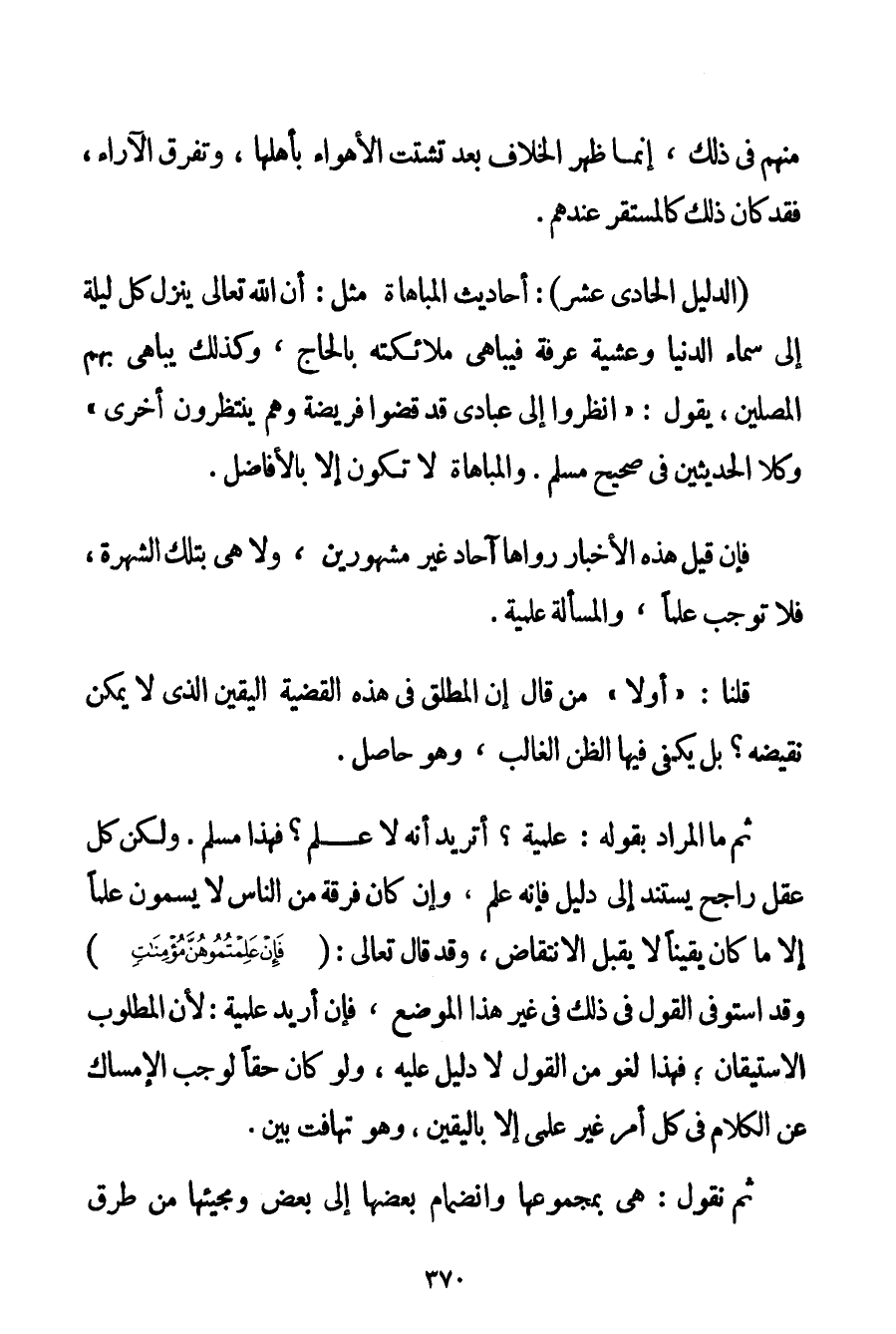 الدَّلِيلُ الْحَادِي عَشَرَ (1) : أَحَادِيثُ الْمُبَاهَاةِ مِثْلُ: {إنَّ اللَّهَ تَعَالَى يَنْزِلُ كُلَّ لَيْلَةٍ إلَى سَمَاءِ الدُّنْيَا وَعَشِيَّةَ عَرَفَةَ فَيُبَاهِي مَلَائِكَتَهُ بِالْحَاجِّ وَكَذَلِكَ يُبَاهِي بِهِمْ الْمُصَلِّينَ يَقُولُ: اُنْظُرُوا إلَى عِبَادِي قَدْ قَضَوْا فَرِيضَةً وَهُمْ يَنْتَظِرُونَ أُخْرَى} وَكِلَا الْحَدِيثَيْنِ فِي صَحِيحِ مُسْلِمٍ. وَالْمُبَاهَاةُ لَا تَكُونُ إلَّا بِالْأَفَاضِلِ. فَإِنْ قِيلَ هَذِهِ الْأَخْبَارُ رَوَاهَا آحَادٌ غَيْرُ مَشْهُورِينَ وَلَا هِيَ بِتِلْكَ الشُّهْرَةِ فَلَا تُوجِبُ عِلْمًا وَالْمَسْأَلَةُ عِلْمِيَّةٌ. قُلْنَا: " أَوَّلًا " مَنْ قَالَ إنَّ الْمُطْلَقَ فِي هَذِهِ الْقَضِيَّةِ الْيَقِينُ الَّذِي لَا يُمْكِنُ نَقِيضُهُ؟ بَلْ يَكْفِي فِيهَا الظَّنُّ الْغَالِبُ وَهُوَ حَاصِلٌ. ثُمَّ مَا الْمُرَادُ بِقَوْلِهِ: عِلْمِيَّةٌ؟ أَتُرِيدُ أَنَّهُ لَا عِلْمَ؟ فَهَذَا مُسْلِمٌ. وَلَكِنْ كُلُّ عَقْلٍ رَاجِحٌ يَسْتَنِدُ إلَى دَلِيلٍ فَإِنَّهُ عِلْمٌ وَإِنْ كَانَ فِرْقَةٌ مِنْ النَّاسِ لَا يُسَمَّوْنَ عِلْمًا إلَّا مَا كَانَ يَقِينًا لَا يَقْبَلُ الِانْتِقَاضَ وَقَدْ قَالَ تَعَالَى: {فَإِنْ عَلِمْتُمُوهُنَّ مُؤْمِنَاتٍ} وَقَدْ اسْتَوْفَى الْقَوْلَ فِي ذَلِكَ فِي غَيْرِ هَذَا الْمَوْضِعِ فَإِنْ أُرِيدَ عِلْمِيَّةٌ: لِأَنَّ الْمَطْلُوبَ الِاسْتِيقَانُ؛ فَهَذَا لَغْوٌ مِنْ الْقَوْلِ لَا دَلِيلَ عَلَيْهِ وَلَوْ كَانَ حَقًّا لَوَجَبَ الْإِمْسَاكُ عَنْ الْكَلَامِ فِي كُلِّ أَمْرٍ غَيْرِ عِلْمِيٍّ إلَّا بِالْيَقِينِ وَهُوَ تَهَافُتٌ بَيِّنٌ. ثُمَّ نَقُولُ: هِيَ بِمَجْمُوعِهَا وَانْضِمَامِ بَعْضِهَا إلَى بَعْضٍ وَمَجِيئِهَا مِنْ