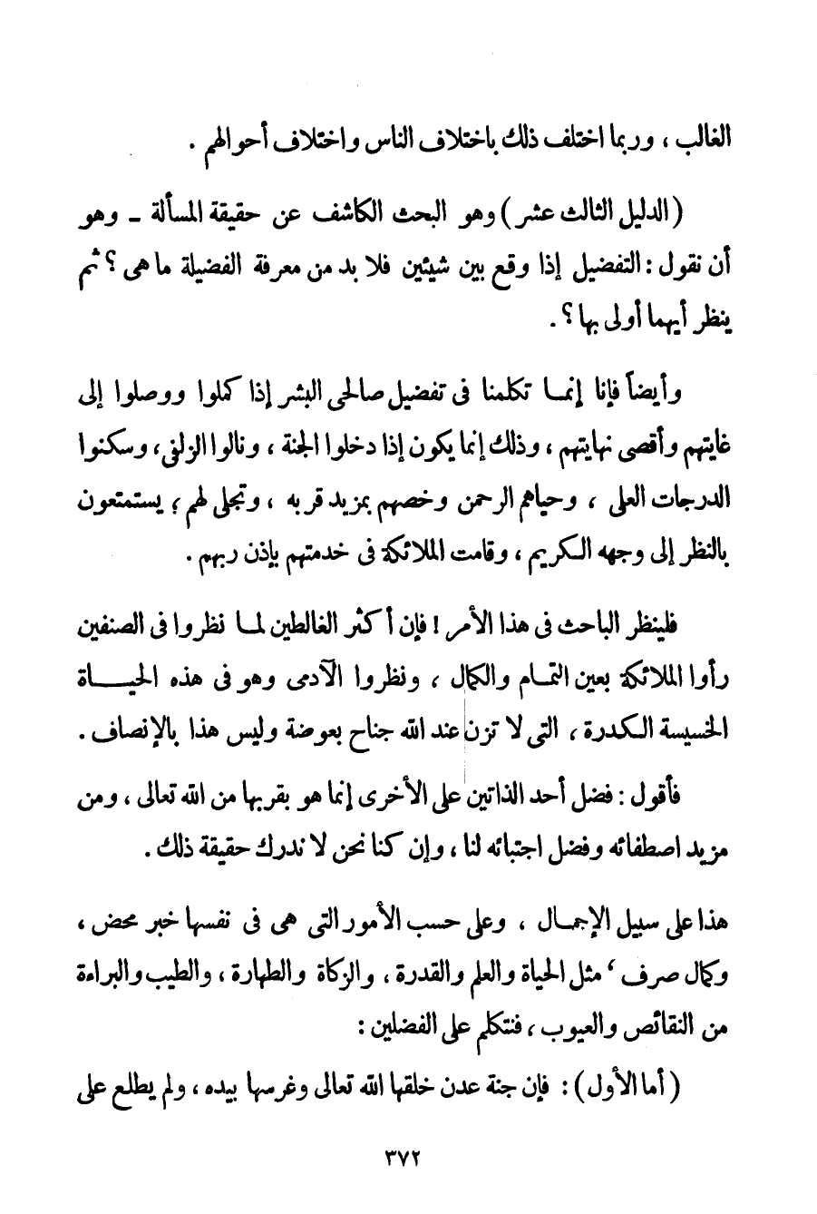 الدَّلِيلُ الثَّالِثَ عَشَرَ (1) : وَهُوَ الْبَحْثُ الْكَاشِفُ عَنْ حَقِيقَةِ الْمَسْأَلَةِ - وَهُوَ أَنْ نَقُولَ: التَّفْضِيلُ إذَا وَقَعَ بَيْنَ شَيْئَيْنِ فَلَا بُدَّ مِنْ مَعْرِفَةِ الْفَضِيلَةِ مَا هِيَ؟ ثُمَّ يُنْظَرُ أَيُّهُمَا أَوْلَى بِهَا؟ . وَأَيْضًا فَإِنَّا إنَّمَا تَكَلَّمْنَا فِي تَفْضِيلِ صَالِحِي الْبَشَرِ إذَا كَمُلُوا وَوَصَلُوا إلَى غَايَتِهِمْ وَأَقْصَى نِهَايَتِهِمْ وَذَلِكَ إنَّمَا يَكُونُ إذَا دَخَلُوا الْجَنَّةَ وَنَالُوا الزُّلْفَى وَسَكَنُوا الدَّرَجَاتِ الْعُلَى وَحَيَّاهُمْ الرَّحْمَنُ وَخَصَّهُمْ بِمَزِيدِ قُرْبِهِ وَتَجَلَّى لَهُمْ؛ يَسْتَمْتِعُونَ بِالنَّظَرِ إلَى وَجْهِهِ الْكَرِيمِ وَقَامَتْ الْمَلَائِكَةُ فِي خِدْمَتِهِمْ بِإِذْنِ رَبِّهِمْ. فَلْيَنْظُرْ الْبَاحِثُ فِي هَذَا الْأَمْرِ فَإِنَّ أَكْثَرَ الغالطين لَمَّا نَظَرُوا فِي الصِّنْفَيْنِ رَأَوْا الْمَلَائِكَةَ بِعَيْنِ التَّمَامِ وَالْكَمَالِ وَنَظَرُوا الْآدَمِيَّ وَهُوَ فِي هَذِهِ الْحَيَاةِ الْخَسِيسَةِ الْكَدِرَةِ الَّتِي لَا تَزِنُ عِنْدَ اللَّهِ جَنَاحَ بَعُوضَةٍ وَلَيْسَ هَذَا بِالْإِنْصَافِ. فَأَقُولُ: فَضْلُ أَحَدِ الذَّاتَيْنِ عَلَى الْأُخْرَى إنَّمَا هُوَ بِقُرْبِهَا مِنْ اللَّهِ تَعَالَى وَمِنْ مَزِيدِ اصْطِفَائِهِ وَفَضْلِ اجْتِبَائِهِ لَنَا وَإِنْ كُنَّا نَحْنُ لَا نُدْرِكُ حَقِيقَةَ ذَلِكَ. هَذَا عَلَى سَبِيلِ الْإِجْمَالِ وَعَلَى حَسَبِ الْأُمُورِ الَّتِي هِيَ فِي نَفْسِهَا خَبَرٌ مَحْضٌ وَكَمَالٌ صِرْفٌ مِثْلُ الْحَيَاةِ وَالْعِلْمِ وَالْقُدْرَةِ وَالزَّكَاةِ وَالطَّهَارَةِ وَالطِّيبِ وَالْبَرَاءَةِ مِنْ النَّقَائِصِ وَالْعُيُوبِ فَنَتَكَلَّمُ عَلَى الْفَضْلَيْنِ: (أَمَّا الْأَوَّلُ: فَإِنَّ جَنَّةَ عَدْنٍ خَلَقَهَا اللَّهُ تَعَالَى وَغَرَسَهَا بِيَدِهِ وَلَمْ يُطْلِعْ عَلَى