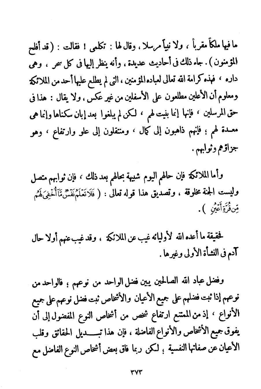 مَا فِيهَا مَلَكًا مُقَرَّبًا وَلَا نَبِيًّا مُرْسَلًا وَقَالَ لَهَا: تَكَلَّمِي فَقَالَتْ: قَدْ أَفْلَحَ الْمُؤْمِنُونَ. جَاءَ ذَلِكَ فِي أَحَادِيثَ عَدِيدَةٍ وَأَنَّهُ يَنْظُرُ إلَيْهَا فِي كُلِّ سَحَرٍ وَهِيَ دَارُهُ فَهَذِهِ كَرَامَةُ اللَّهِ تَعَالَى لِعِبَادِهِ الْمُؤْمِنِينَ الَّتِي لَمْ يَطَّلِعْ عَلَيْهَا أَحَدٌ مِنْ الْمَلَائِكَةِ وَمَعْلُومٌ أَنَّ الْأَعْلَيْنَ مُطَّلِعُونَ عَلَى الْأَسْفَلِينَ مِنْ غَيْرِ عَكْسٍ وَلَا يُقَالُ: هَذَا فِي حَقِّ الْمُرْسَلِينَ فَإِنَّهَا إنَّمَا بُنِيَتْ لَهُمْ لَكِنْ لَمْ يَبْلُغُوا بَعْدُ إبَّانَ سُكْنَاهَا وَإِنَّمَا هِيَ مُعَدَّةٌ لَهُمْ؛ فَإِنَّهُمْ ذَاهِبُونَ إلَى كَمَالٍ وَمُنْتَقِلُونَ إلَى عُلُوٍّ وَارْتِفَاعٍ وَهُوَ جَزَاؤُهُمْ وَثَوَابُهُمْ. وَأَمَّا الْمَلَائِكَةُ فَإِنَّ حَالَهُمْ الْيَوْمَ شَبِيهَةٌ بِحَالِهِمْ بَعْدَ ذَلِكَ فَإِنَّ ثَوَابَهُمْ مُتَّصِلٌ وَلَيْسَتْ الْجَنَّةُ مَخْلُوقَةً (*) وَتَصْدِيقُ هَذَا قَوْله تَعَالَى {فَلَا تَعْلَمُ نَفْسٌ مَا أُخْفِيَ لَهُمْ مِنْ قُرَّةِ أَعْيُنٍ} . فَحَقِيقَةُ مَا أَعَدَّهُ اللَّهُ لِأَوْلِيَائِهِ غَيْبٌ عَنْ الْمَلَائِكَةِ وَقَدْ غَيَّبَ عَنْهُمْ أَوَّلًا حَالَ آدَمَ فِي النَّشْأَةِ الْأُولَى وَغَيْرِهَا. وَفَضْلُ عِبَادِ اللَّهِ الصَّالِحِينَ يُبَيِّنُ فَضْلَ الْوَاحِدِ مِنْ نَوْعِهِمْ؛ فَالْوَاحِدُ مِنْ نَوْعِهِمْ إذَا ثَبَتَ فَضْلُهُمْ عَلَى جَمِيعِ الْأَعْيَانِ وَالْأَشْخَاصِ ثَبَتَ فَضْلُ نَوْعِهِمْ عَلَى جَمِيعِ الْأَنْوَاعِ إذْ مِنْ الْمُمْتَنِعِ ارْتِفَاعُ شَخْصٍ مِنْ أَشْخَاصِ النَّوْعِ الْمَفْضُولِ إلَى أَنْ يَفُوقَ جَمِيعَ الْأَشْخَاصِ وَالْأَنْوَاعِ الْفَاضِلَةِ فَإِنَّ هَذَا تَبْدِيلُ الْحَقَائِقِ وَقَلْبُ الْأَعْيَانِ عَنْ صِفَاتِهَا النَّفْسِيَّةِ؛ لَكِنْ رُبَّمَا فَاقَ بَعْضَ أَشْخَاصِ النَّوْعِ الْفَاضِلِ مَعَ