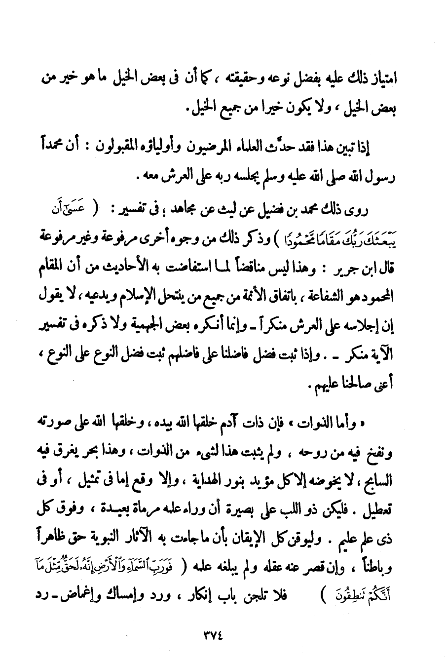 امْتِيَازِ ذَلِكَ عَلَيْهِ بِفَضْلِ نَوْعِهِ وَحَقِيقَتِهِ كَمَا أَنَّ فِي بَعْضِ الْخَيْلِ مَا هُوَ خَيْرٌ مِنْ بَعْضِ الْخَيْلِ وَلَا يَكُونُ خَيْرًا مِنْ جَمِيعِ الْخَيْلِ. إذَا تَبَيَّنَ هَذَا فَقَدْ حَدَثَ الْعُلَمَاءُ الْمَرْضِيُّونَ وَأَوْلِيَاؤُهُ الْمَقْبُولُونَ: أَنَّ مُحَمَّدًا رَسُولَ اللَّهِ صَلَّى اللَّهُ عَلَيْهِ وَسَلَّمَ يُجْلِسُهُ رَبُّهُ عَلَى الْعَرْشِ مَعَهُ. رَوَى ذَلِكَ مُحَمَّدُ بْنُ فَضِيلٍ عَنْ لَيْثٍ عَنْ مُجَاهِدٍ؛ فِي تَفْسِيرِ: {عَسَى أَنْ يَبْعَثَكَ رَبُّكَ مَقَامًا مَحْمُودًا} وَذَكَرَ ذَلِكَ مِنْ وُجُوهٍ أُخْرَى مَرْفُوعَةٍ وَغَيْرِ مَرْفُوعَةٍ قَالَ ابْنُ جَرِيرٍ: وَهَذَا لَيْسَ مُنَاقِضًا لِمَا اسْتَفَاضَتْ بِهِ الْأَحَادِيثُ مِنْ أَنَّ الْمَقَامَ الْمَحْمُودَ هُوَ الشَّفَاعَةُ بِاتِّفَاقِ الْأَئِمَّةِ مِنْ جَمِيعِ مَنْ يَنْتَحِلُ الْإِسْلَامَ وَيَدَّعِيه لَا يَقُولُ إنَّ إجْلَاسَهُ عَلَى الْعَرْشِ مُنْكَرًا (*) - وَإِنَّمَا أَنْكَرَهُ بَعْضُ الْجَهْمِيَّة وَلَا ذَكَرَهُ فِي تَفْسِيرِ الْآيَةِ مُنْكَرٌ -. وَإِذَا ثَبَتَ فَضْلُ فَاضِلِنَا عَلَى فَاضِلِهِمْ ثَبَتَ فَضْلُ النَّوْع عَلَى النَّوْعِ أَعْنِي صَالِحَنَا عَلَيْهِمْ. " وَأَمَّا الذَّوَاتُ " فَإِنَّ ذَاتَ آدَمَ خَلَقَهَا اللَّهُ بِيَدِهِ وَخَلَقَهَا اللَّهُ عَلَى صُورَتِهِ وَنَفَخَ فِيهِ مِنْ رُوحِهِ وَلَمْ يَثْبُتْ هَذَا لِشَيْءِ مِنْ الذَّوَاتِ وَهَذَا بَحْرٌ يَغْرَقُ فِيهِ السَّابِحُ لَا يَخُوضُهُ إلَّا كُلُّ مُؤَيَّدٍ بِنُورِ الْهِدَايَةِ وَإِلَّا وَقَعَ إمَّا فِي تَمْثِيلٍ أَوْ فِي تَعْطِيلٍ. فَلْيَكُنْ ذُو اللُّبِّ عَلَى بَصِيرَةٍ أَنَّ وَرَاءَ عِلْمِهِ مِرْمَاةٌ بَعِيدَةٌ وَفَوْقَ كُلِّ ذِي عِلْمٍ عَلِيمٌ. وَلْيُوقِنْ كُلَّ الْإِيقَانِ بِأَنَّ مَا جَاءَتْ بِهِ الْآثَارُ النَّبَوِيَّةُ حَقٌّ ظَاهِرًا وَبَاطِنًا وَإِنْ قَصَرَ عَنْهُ عَقْلُهُ وَلَمْ يَبْلُغْهُ عِلْمُهُ {فَوَرَبِّ السَّمَاءِ وَالْأَرْضِ إنَّهُ لَحَقٌّ مِثْلَ مَا أَنَّكُمْ تَنْطِقُونَ} فَلَا تَلِجْنَ بَابَ إنْكَارٍ وُرُودَ إمْسَاكٍ وَإِغْمَاضٍ - رَدًّا