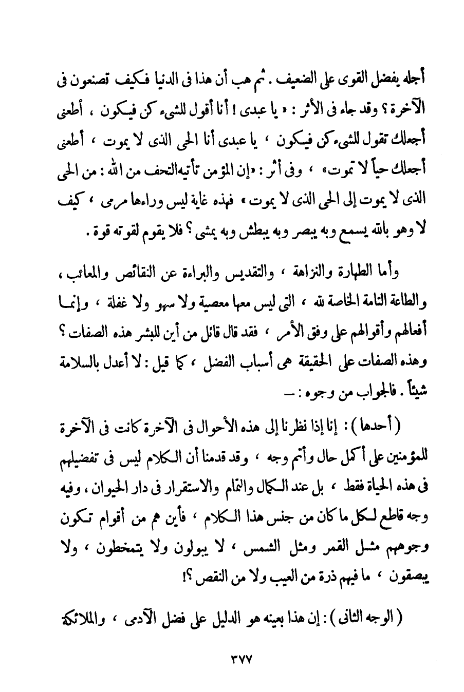 أَجْلِهِ يُفَضَّلُ الْقَوِيُّ عَلَى الضَّعِيفِ. ثُمَّ هَبْ أَنَّ هَذَا فِي الدُّنْيَا فَكَيْفَ تَصْنَعُونَ فِي الْآخِرَةِ؟ وَقَدْ جَاءَ فِي الْأَثَرِ: " {يَا عَبْدِي أَنَا أَقُولُ لِلشَّيْءِ كُنْ فَيَكُونُ أَطِعْنِي أَجْعَلْك تَقُولُ لِلشَّيْءِ كُنْ فَيَكُونُ يَا عَبْدِي أَنَا الْحَيُّ الَّذِي لَا يَمُوتُ أَطِعْنِي أَجْعَلْك حَيًّا لَا تَمُوتُ} " وَفِي أَثَرٍ: " {إنَّ الْمُؤْمِنَ تَأْتِيهِ التُّحَفُ مِنْ اللَّهِ: مَنْ الْحَيُّ الَّذِي لَا يَمُوتُ إلَى الْحَيِّ الَّذِي لَا يَمُوتُ} " فَهَذِهِ غَايَةٌ لَيْسَ وَرَاءَهَا مَرْمَى كَيْفَ لَا وَهُوَ بِاَللَّهِ يَسْمَعُ وَبِهِ يُبْصِرُ وَبِهِ يَبْطِشُ وَبِهِ يَمْشِي؟ فَلَا يَقُومُ لِقُوَّتِهِ قُوَّةٌ. وَأَمَّا الطَّهَارَةُ وَالنَّزَاهَةُ وَالتَّقْدِيسُ وَالْبَرَاءَةُ عَنْ النَّقَائِصِ والمعائب وَالطَّاعَةُ التَّامَّةُ الْخَاصَّةُ لِلَّهِ الَّتِي لَيْسَ مَعَهَا مَعْصِيَةٌ وَلَا سَهْوٌ وَلَا غَفْلَةٌ وَإِنَّمَا أَفْعَالُهُمْ وَأَقْوَالُهُمْ عَلَى وَفْقِ الْأَمْرِ فَقَدْ قَالَ قَائِلٌ مِنْ أَيْنَ لِلْبَشَرِ هَذِهِ الصِّفَاتِ؟ وَهَذِهِ الصِّفَاتُ عَلَى الْحَقِيقَةِ هِيَ أَسْبَابُ الْفَضْلِ كَمَا قِيلَ: لَا أَعْدِلُ بِالسَّلَامَةِ شَيْئًا. فَالْجَوَابُ مِنْ وُجُوهٍ: