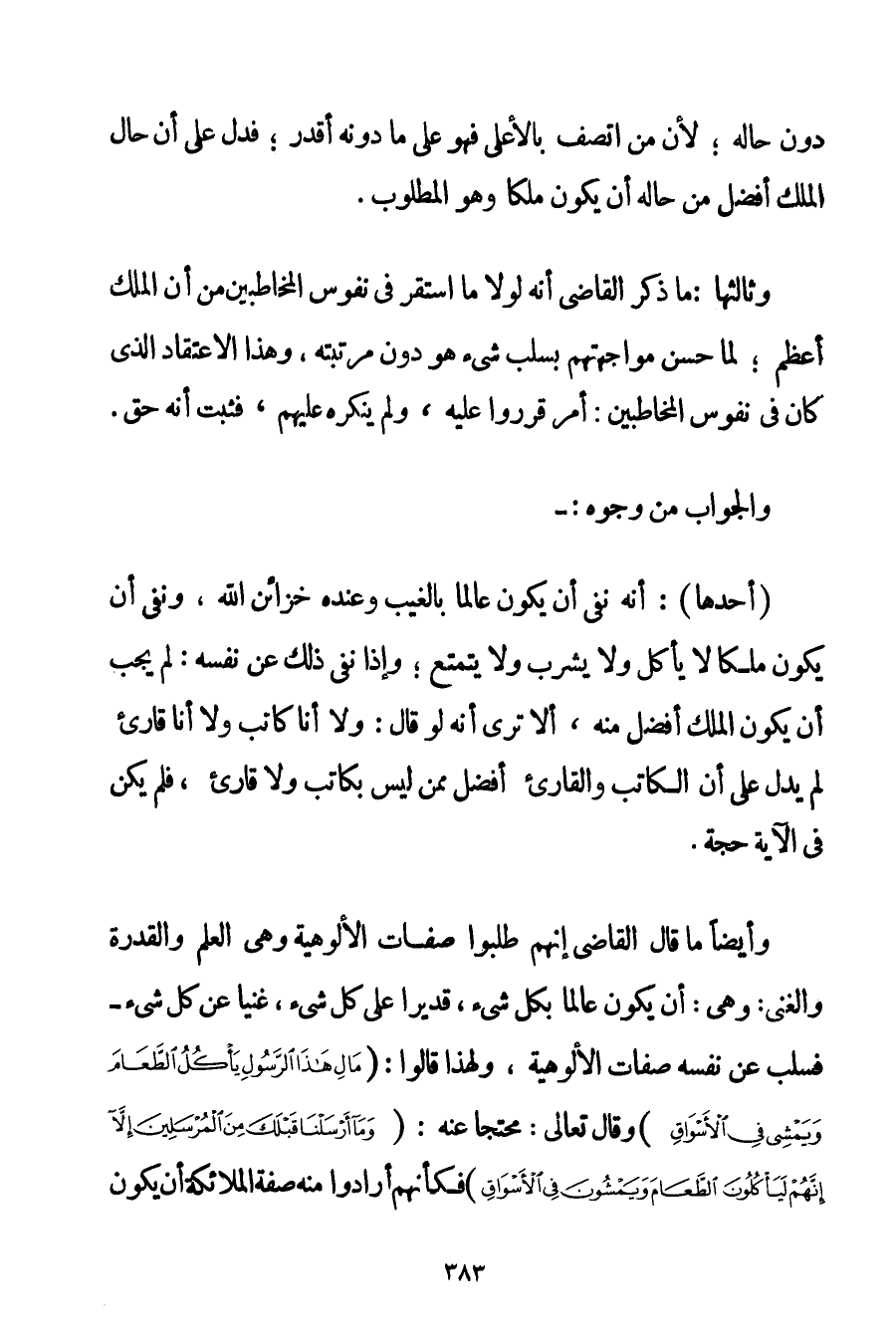 دُونَ حَالِهِ؛ لِأَنَّ مَنْ اتَّصَفَ بِالْأَعْلَى فَهُوَ عَلَى مَا دُونَهُ أَقْدَرُ؛ فَدَلَّ عَلَى أَنَّ حَالَ الْمَلَكِ أَفْضَلُ مِنْ حَالِهِ أَنْ يَكُونَ مَلَكًا وَهُوَ الْمَطْلُوبُ. وَثَالِثُهَا: مَا ذَكَرَ الْقَاضِي أَنَّهُ لَوْلَا مَا اسْتَقَرَّ فِي نُفُوسِ الْمُخَاطَبِينَ مِنْ أَنَّ الْمَلَكَ أَعْظَمُ؛ لَمَا حَسُنَ مُوَاجَهَتُهُمْ بِسَلْبِ شَيْءٍ هُوَ دُونَ مَرْتَبَتِهِ وَهَذَا الِاعْتِقَادُ الَّذِي كَانَ فِي نُفُوسِ الْمُخَاطَبِينَ: أَمْرٌ قُرِّرُوا عَلَيْهِ وَلَمْ يُنْكِرْهُ عَلَيْهِمْ فَثَبَتَ أَنَّهُ حَقٌّ. وَالْجَوَابُ مِنْ وُجُوهٍ: (أَحَدُهَا: أَنَّهُ نَفَى أَنْ يَكُونَ عَالِمًا بِالْغَيْبِ وَعِنْدَهُ خَزَائِنُ اللَّهِ وَنَفَى أَنْ يَكُونَ مَلَكًا لَا يَأْكُلُ وَلَا يَشْرَبُ وَلَا يَتَمَتَّعُ؛ وَإِذَا نَفَى ذَلِكَ عَنْ نَفْسِهِ: لَمْ يَجِبْ أَنْ يَكُونَ الْمَلَكُ أَفْضَلَ مِنْهُ أَلَّا تَرَى أَنَّهُ لَوْ قَالَ: وَلَا أَنَا كَاتِبٌ وَلَا أَنَا قَارِئٌ لَمْ يَدُلّ عَلَى أَنَّ الْكَاتِبَ وَالْقَارِئَ أَفْضَلُ مِمَّنْ لَيْسَ بِكَاتِبِ وَلَا قَارِئٍ فَلَمْ يَكُنْ فِي الْآيَةِ حُجَّةٌ. وَأَيْضًا مَا قَالَ الْقَاضِي إنَّهُمْ طَلَبُوا صِفَاتِ الْأُلُوهِيَّةِ وَهِيَ الْعِلْمُ وَالْقُدْرَةُ وَالْغِنَى: وَهِيَ: أَنْ يَكُونَ عَالِمًا بِكُلِّ شَيْءٍ قَدِيرًا عَلَى كُلِّ شَيْءٍ غَنِيًّا عَنْ كُلِّ شَيْءٍ - فَسَلَبَ عَنْ نَفْسِهِ صِفَاتِ الْأُلُوهِيَّةِ وَلِهَذَا قَالُوا: {مَالِ هَذَا الرَّسُولِ يَأْكُلُ الطَّعَامَ وَيَمْشِي فِي الْأَسْوَاقِ} وَقَالَ تَعَالَى: مُحْتَجًّا عَنْهُ: {وَمَا أَرْسَلْنَا قَبْلَكَ مِنَ الْمُرْسَلِينَ إلَّا إنَّهُمْ لَيَأْكُلُونَ الطَّعَامَ وَيَمْشُونَ فِي الْأَسْوَاقِ} فَكَأَنَّهُمْ أَرَادُوا مِنْهُ صِفَةَ الْمَلَائِكَةِ أَنْ يَكُونَ