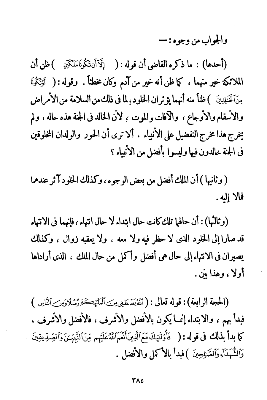الْحُجَّةُ الرَّابِعَةُ: قَوْلُهُ تَعَالَى: {اللَّهُ يَصْطَفِي مِنَ الْمَلَائِكَةِ رُسُلًا وَمِنَ النَّاسِ} فَبَدَأَ بِهِمْ وَالِابْتِدَاءُ إنَّمَا يَكُونُ بِالْأَفْضَلِ وَالْأَشْرَفِ فَالْأَفْضَلُ وَالْأَشْرَفُ كَمَا بَدَأَ بِذَلِكَ فِي قَوْلِهِ: {فَأُولَئِكَ مَعَ الَّذِينَ أَنْعَمَ اللَّهُ عَلَيْهِمْ مِنَ النَّبِيِّينَ وَالصِّدِّيقِينَ وَالشُّهَدَاءِ وَالصَّالِحِينَ} فَبَدَأَ بِالْأَكْمَلِ وَالْأَفْضَلِ.