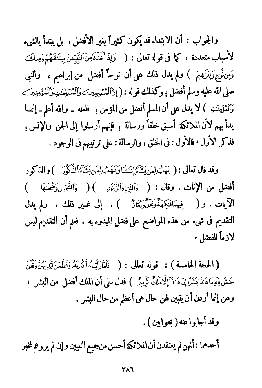 وَالْجَوَابُ: أَنَّ الِابْتِدَاءَ قَدْ يَكُونُ كَثِيرًا بِغَيْرِ الْأَفْضَلِ بَلْ يُبْتَدَأُ بِالشَّيْءِ لِأَسْبَابِ مُتَعَدِّدَةٍ كَمَا فِي قَوْله تَعَالَى {وَإِذْ أَخَذْنَا مِنَ النَّبِيِّينَ مِيثَاقَهُمْ وَمِنْكَ وَمِنْ نُوحٍ وَإِبْرَاهِيمَ} وَلَمْ يَدُلَّ ذَلِكَ عَلَى أَنَّ نُوحًا أَفْضَلُ مِنْ إبْرَاهِيمَ وَالنَّبِيُّ صَلَّى اللَّهُ عَلَيْهِ وَسَلَّمَ أَفْضَلُ؛ وَكَذَلِكَ قَوْلُهُ: {إنَّ الْمُسْلِمِينَ وَالْمُسْلِمَاتِ وَالْمُؤْمِنِينَ وَالْمُؤْمِنَاتِ} لَا يَدُلُّ عَلَى أَنَّ الْمُسْلِمَ أَفْضَلُ مِنْ الْمُؤْمِنِ؛ فَلَعَلَّهُ - وَاَللَّهُ أَعْلَمُ - إنَّمَا بَدَأَ بِهِمْ لِأَنَّ الْمَلَائِكَةَ أَسْبَقُ خَلْقًا وَرِسَالَةً؛ فَإِنَّهُمْ أُرْسِلُوا إلَى الْجِنِّ وَالْإِنْسِ؛ فَذَكَرَ الْأَوَّلَ فَالْأَوَّلَ: فِي الْخَلْقِ وَالرِّسَالَةِ: عَلَى تَرْتِيبِهِمْ فِي الْوُجُودِ. وَقَدْ قَالَ تَعَالَى: {يَهَبُ لِمَنْ يَشَاءُ إنَاثًا وَيَهَبُ لِمَنْ يَشَاءُ الذُّكُورَ} وَالذُّكُورُ أَفْضَلُ مِنْ الْإِنَاثِ. وَقَالَ: {وَالتِّينِ وَالزَّيْتُونِ} {وَالشَّمْسِ وَضُحَاهَا} الْآيَاتِ. و {فِيهِمَا فَاكِهَةٌ وَنَخْلٌ وَرُمَّانٌ} إلَى غَيْرِ ذَلِكَ وَلَمْ يَدُلّ التَّقْدِيمُ فِي شَيْءٍ مِنْ هَذِهِ الْمَوَاضِعِ عَلَى فَضْلِ الْمَبْدُوءِ بِهِ فَعُلِمَ أَنَّ التَّقْدِيمَ لَيْسَ لَازِمًا لِلْفَضْلِ. (الْحُجَّةُ الْخَامِسَةُ: قَوْله تَعَالَى {فَلَمَّا رَأَيْنَهُ أَكْبَرْنَهُ وَقَطَّعْنَ أَيْدِيَهُنَّ وَقُلْنَ حَاشَ لِلَّهِ مَا هَذَا بَشَرًا إنْ هَذَا إلَّا مَلَكٌ كَرِيمٌ} فَدَلَّ عَلَى أَنَّ الْمَلَكَ أَفْضَلُ مِنْ الْبَشَرِ وَهُنَّ إنَّمَا أَرَدْنَ أَنْ يَتَبَيَّنَ لَهُنَّ حَالٌ هِيَ أَعْظَمُ مِنْ حَالِ الْبَشَرِ. وَقَدْ أَجَابُوا عَنْهُ بِجَوَابَيْنِ. أَحَدُهُمَا أَنَّهُنَّ لَمْ يَعْتَقِدْنَ أَنَّ الْمَلَائِكَةَ أَحْسَنُ مِنْ جَمِيعِ النَّبِيِّينَ وَإِنْ لَمْ يَرَوْهُمْ لِمُخْبِرٍ