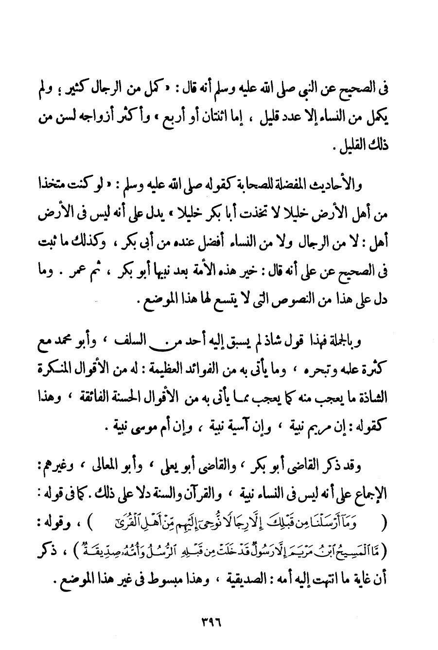 فِي الصَّحِيحِ عَنْ النَّبِيِّ صَلَّى اللَّهُ عَلَيْهِ وَسَلَّمَ أَنَّهُ قَالَ: {كَمُلَ مِنْ الرِّجَالِ كَثِيرٌ؛ وَلَمْ يَكْمُلْ مِنْ النِّسَاءِ إلَّا عَدَدٌ قَلِيلٌ إمَّا اثْنَتَانِ أَوْ أَرْبَعٌ} " وَأَكْثَرُ أَزْوَاجِهِ لَسْنَ مِنْ ذَلِكَ الْقَلِيلِ. وَالْأَحَادِيثُ الْمُفَضِّلَةُ لِلصَّحَابَةِ كَقَوْلِهِ صَلَّى اللَّهُ عَلَيْهِ وَسَلَّمَ " {لَوْ كُنْت مُتَّخِذًا مِنْ أَهْلِ الْأَرْضِ خَلِيلًا لَاِتَّخَذْت أَبَا بَكْرٍ خَلِيلًا} " يَدُلُّ عَلَى أَنَّهُ لَيْسَ فِي الْأَرْضِ أَهْلٌ: لَا مِنْ الرِّجَالِ وَلَا مِنْ النِّسَاءِ أَفْضَلُ عِنْدَهُ مِنْ أَبِي بَكْرٍ وَكَذَلِكَ مَا ثَبَتَ فِي الصَّحِيحِ عَنْ عَلِيٍّ أَنَّهُ قَالَ: خَيْرُ هَذِهِ الْأُمَّةِ بَعْدَ نَبِيِّهَا أَبُو بَكْرٍ ثُمَّ عُمَرُ. وَمَا دَلَّ عَلَى هَذَا مِنْ النُّصُوصِ الَّتِي لَا يَتَّسِعُ لَهَا هَذَا الْمَوْضِعُ. وَبِالْجُمْلَةِ فَهَذَا قَوْلٌ شَاذٌّ لَمْ يُسْبَقْ إلَيْهِ أَحَدٌ مِنْ السَّلَفِ وَأَبُو مُحَمَّدٍ مَعَ كَثْرَةِ عِلْمِهِ وَتَبَحُّرِهِ وَمَا يَأْتِي بِهِ مِنْ الْفَوَائِدِ الْعَظِيمَةِ: لَهُ مِنْ الْأَقْوَالِ الْمُنْكَرَةِ الشَّاذَّةِ مَا يَعْجَبُ مِنْهُ كَمَا يَعْجَبُ مِمَّا يَأْتِي بِهِ مِنْ الْأَقْوَالِ الْحَسَنَةِ الْفَائِقَةِ وَهَذَا كَقَوْلِهِ: إنَّ مَرْيَمَ نَبِيَّةٌ وَإِنَّ آسِيَةَ نَبِيَّةٌ وَإِنَّ أَمْ مُوسَى نَبِيَّةٌ. وَقَدْ ذَكَرَ الْقَاضِي أَبُو بَكْرٍ وَالْقَاضِي أَبُو يَعْلَى وَأَبُو الْمَعَالِي وَغَيْرُهُمْ: الْإِجْمَاعُ عَلَى أَنَّهُ لَيْسَ فِي النِّسَاءِ نَبِيَّةٌ وَالْقُرْآنُ وَالسُّنَّةُ دَلَّا عَلَى ذَلِكَ: كَمَا فِي قَوْلِهِ: {وَمَا أَرْسَلْنَا مِنْ قَبْلِكَ إلَّا رِجَالًا نُوحِي إلَيْهِمْ مِنْ أَهْلِ الْقُرَى} وَقَوْلِهِ: {مَا الْمَسِيحُ ابْنُ مَرْيَمَ إلَّا رَسُولٌ قَدْ خَلَتْ مِنْ قَبْلِهِ الرُّسُلُ وَأُمُّهُ صِدِّيقَةٌ} ذَكَرَ أَنَّ غَايَةَ مَا انْتَهَتْ إلَيْهِ أُمُّهُ: الصديقيةُ وَهَذَا مَبْسُوطٌ فِي غَيْرِ هَذَا الْمَوْضِعِ.