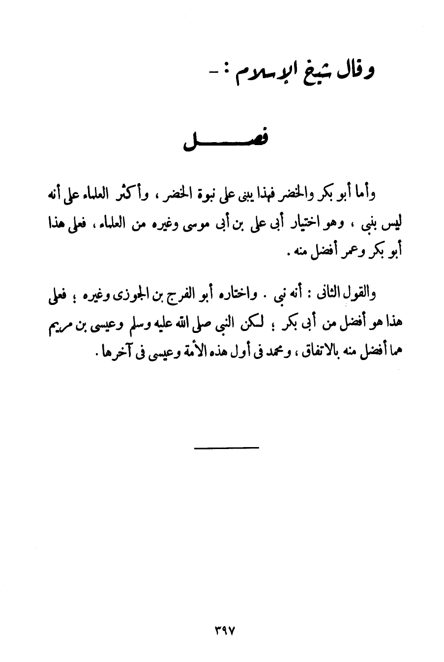 وَأَمَّا أَبُو بَكْرٍ وَالْخَضِرُ فَهَذَا يُبْنَى عَلَى نُبُوَّةِ الْخَضِرِ وَأَكْثَرُ الْعُلَمَاءِ عَلَى أَنَّهُ لَيْسَ بِنَبِيِّ وَهُوَ اخْتِيَارُ أَبِي عَلِيٍّ بْنِ أَبِي مُوسَى وَغَيْرِهِ مِنْ الْعُلَمَاءِ فَعَلَى هَذَا أَبُو بَكْرٍ وَعُمَرُ أَفْضَلُ مِنْهُ. وَالْقَوْلُ الثَّانِي: أَنَّهُ نَبِيٌّ. وَاخْتَارَهُ أَبُو الْفَرَجِ ابْنُ الْجَوْزِيِّ وَغَيْرُهُ؛ فَعَلَى هَذَا هُوَ أَفْضَلُ مِنْ أَبِي بَكْرٍ؛ لَكِنَّ النَّبِيَّ صَلَّى اللَّهُ عَلَيْهِ وَسَلَّمَ وَعِيسَى ابْنَ مَرْيَمَ هُمَا أَفْضَلُ مِنْهُ بِالِاتِّفَاقِ وَمُحَمَّدٌ فِي أَوَّلِ هَذِهِ الْأُمَّةِ وَعِيسَى فِي آخِرِهَا.