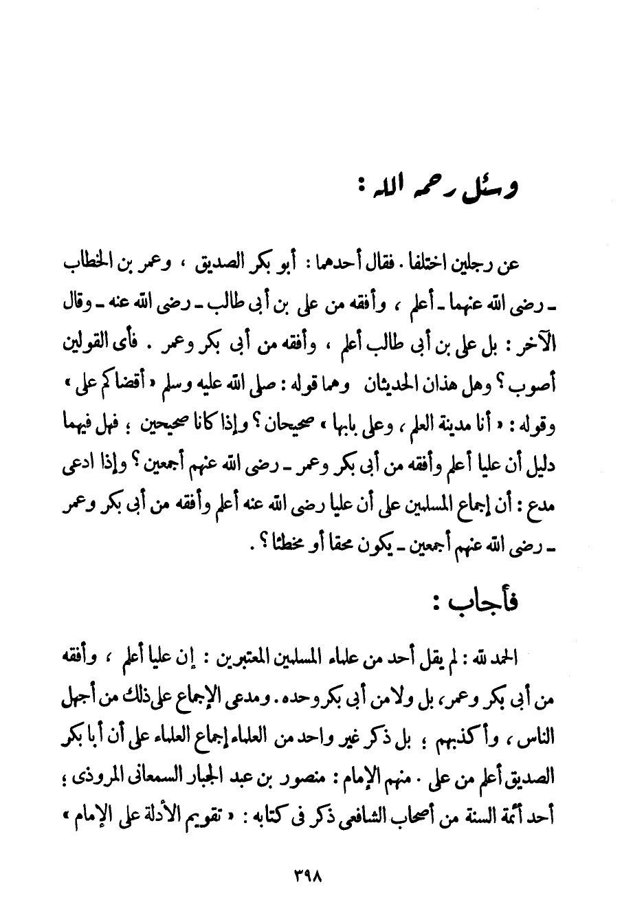 الْحَمْدُ لِلَّهِ، لَمْ يَقُلْ أَحَدٌ مِنْ عُلَمَاءِ الْمُسْلِمِينَ الْمُعْتَبِرِينَ: إنَّ عَلِيًّا أَعْلَمُ وَأَفْقَهُ مِنْ أَبِي بَكْرٍ وَعُمَرَ بَلْ وَلَا مِنْ أَبِي بَكْرٍ وَحْدَهُ. وَمُدَّعِي الْإِجْمَاعِ عَلَى ذَلِكَ مِنْ أَجْهَلِ النَّاسِ وَأَكْذَبِهِمْ؛ بَلْ ذَكَرَ غَيْرُ وَاحِدٍ مِنْ الْعُلَمَاءِ إجْمَاعَ الْعُلَمَاءِ عَلَى أَنَّ أَبَا بَكْرٍ الصِّدِّيقَ أَعْلَمُ مِنْ عَلِيٍّ. مِنْهُمْ الْإِمَامُ مَنْصُورُ بْنُ عَبْدِ الْجَبَّارِ السَّمْعَانِي المروذي؛ أَحَدُ أَئِمَّةِ السُّنَّةِ مِنْ أَصْحَابِ الشَّافِعِيِّ ذَكَرَ فِي كِتَابِهِ: " تَقْوِيمُ الْأَدِلَّةِ عَلَى الْإِمَامِ "