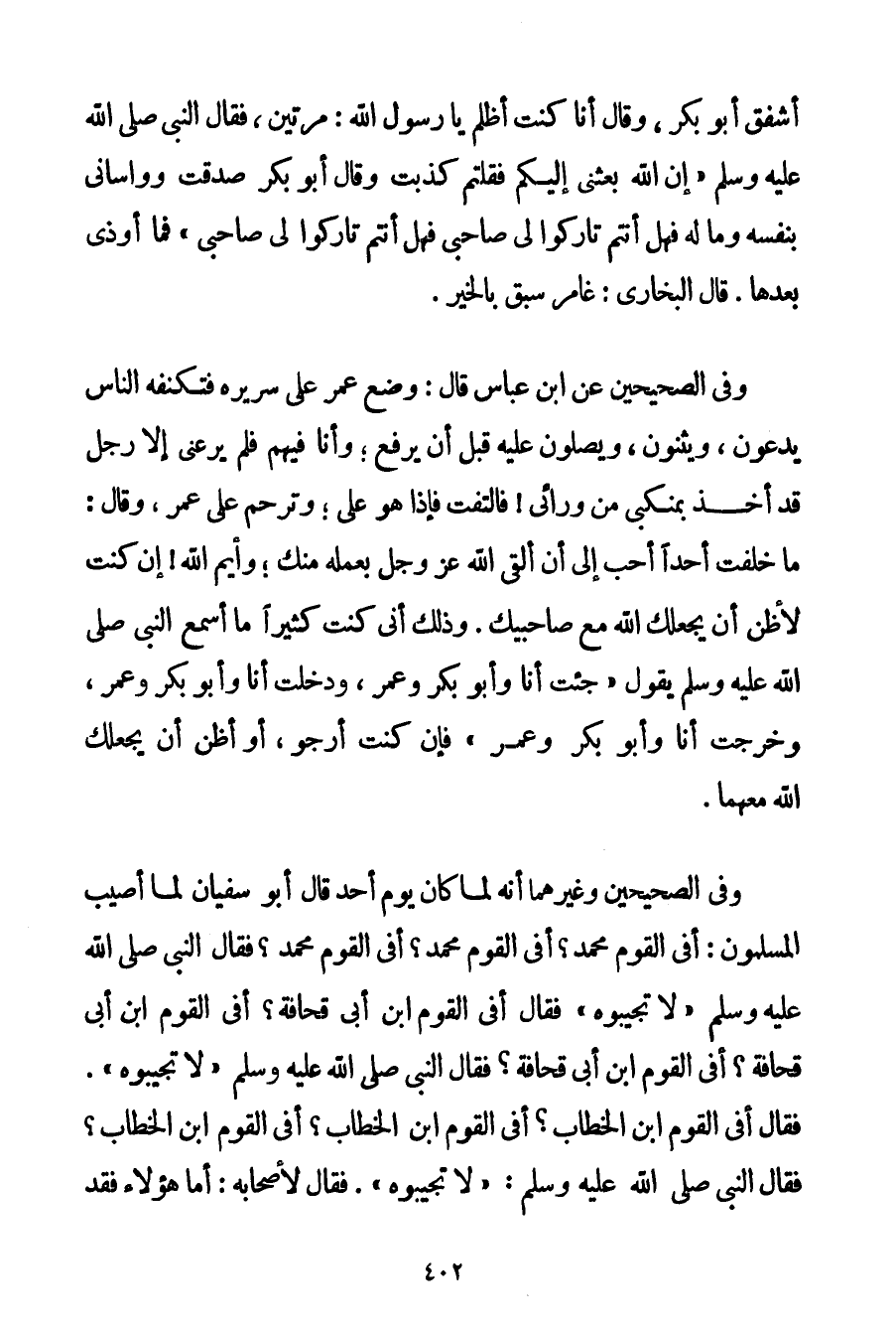 أَشْفَقَ أَبُو بَكْرٍ وَقَالَ أَنَا كُنْت أَظْلَمَ يَا رَسُولَ اللَّهِ: مَرَّتَيْنِ فَقَالَ النَّبِيُّ صَلَّى اللَّهُ عَلَيْهِ وَسَلَّمَ إنَّ اللَّهَ بَعَثَنِي إلَيْكُمْ فَقُلْتُمْ كَذَبْت وَقَالَ أَبُو بَكْرٍ صَدَقْت وَوَاسَانِي بِنَفْسِهِ وَمَالِهِ فَهَلْ أَنْتُمْ تَارِكُوا لِي صَاحِبِي فَهَلْ أَنْتُمْ تَارِكُوا لِي صَاحِبِي} فَمَا أُوذِيَ بَعْدَهَا. قَالَ الْبُخَارِيُّ. غَامَرَ سَبَقَ بِالْخَيْرِ. وَفِي الصَّحِيحَيْنِ عَنْ ابْنِ عَبَّاسٍ قَالَ: {وُضِعَ عُمَرُ عَلَى سَرِيرِهِ فَتَكَنَّفَهُ النَّاسُ يَدْعُونَ وَيُثْنُونَ وَيُصَلُّونَ عَلَيْهِ قَبْلَ أَنْ يُرْفَعَ؛ وَأَنَا فِيهِمْ فَلَمْ يَرُعْنِي إلَّا رَجُلٌ قَدْ أَخَذَ بِمَنْكِبِي مِنْ وَرَائِي فَالْتَفَتّ فَإِذَا هُوَ عَلِيٌّ؛ وَتَرَحَّمَ عَلَى عُمَرَ وَقَالَ: مَا خَلَّفْت أَحَدًا أَحَبَّ إلَيَّ أَنْ أَلْقَى اللَّهَ عَزَّ وَجَلَّ بِعَمَلِهِ مِنْك؛ وَأَيْمُ اللَّهِ إنْ كُنْت لَأَظُنُّ أَنْ يَجْعَلَك اللَّهُ مَعَ صَاحِبَيْك. وَذَلِكَ أَنِّي كُنْت كَثِيرًا مَا أَسْمَعُ النَّبِيَّ صَلَّى اللَّهُ عَلَيْهِ وَسَلَّمَ يَقُولُ جِئْت أَنَا وَأَبُو بَكْرٍ وَعُمَرُ وَدَخَلْت أَنَا وَأَبُو بَكْرٍ وَعُمَرُ وَخَرَجْت أَنَا وَأَبُو بَكْرٍ وَعُمَرُ فَإِنْ كُنْت أَرْجُو أَوْ أَظُنُّ أَنْ يَجْعَلَك اللَّهُ مَعَهُمَا} . وَفِي الصَّحِيحَيْنِ وَغَيْرِهِمَا أَنَّهُ {لَمَّا كَانَ يَوْمُ أُحُدٍ قَالَ أَبُو سُفْيَانَ لَمَّا أُصِيبَ الْمُسْلِمُونَ: أَفِي الْقَوْمِ مُحَمَّدٌ؟ أَفِي الْقَوْمِ مُحَمَّدٌ؟ أَفِي الْقَوْمِ مُحَمَّدٌ؟ فَقَالَ النَّبِيُّ صَلَّى اللَّهُ عَلَيْهِ وَسَلَّمَ لَا تُجِيبُوهُ فَقَالَ أَفِي الْقَوْمِ ابْنُ أَبِي قُحَافَةَ؟ أَفِي الْقَوْمِ ابْنُ أَبِي قُحَافَةَ؟ أَفِي الْقَوْمِ ابْنُ أَبِي قُحَافَةَ؟ فَقَالَ النَّبِيُّ صَلَّى اللَّهُ عَلَيْهِ وَسَلَّمَ لَا تُجِيبُوهُ. فَقَالَ أَفِي الْقَوْمِ ابْنُ الْخَطَّابِ؟ أَفِي الْقَوْمِ ابْنُ الْخَطَّابِ؟ أَفِي الْقَوْمِ ابْنُ الْخَطَّابِ؟ فَقَالَ النَّبِيُّ صَلَّى اللَّهُ عَلَيْهِ وَسَلَّمَ لَا تُجِيبُوهُ. فَقَالَ لِأَصْحَابِهِ: أَمَّا هَؤُلَاءِ فَقَدْ