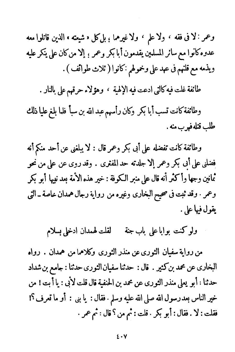 وَعُمَرَ: لَا فِي فِقْهٍ وَلَا عِلْمٍ وَلَا غَيْرِهِمَا؛ بَلْ كُلُّ " شِيعَتِهِ " الَّذِينَ قَاتَلُوا مَعَهُ عَدُّوهُ كَانُوا مَعَ سَائِرِ الْمُسْلِمِينَ يُقَدِّمُونَ أَبَا بَكْرٍ وَعُمَرَ؛ إلَّا مَنْ كَانَ عَلِيٌّ يُنْكِرُ عَلَيْهِ وَيَذُمُّهُ مَعَ قِلَّتِهِمْ فِي عَهْدِ عَلِيٍّ وَخُمُولِهِمْ: كَانُوا (ثَلَاثَ طَوَائِفَ: طَائِفَةٌ غَلَتْ فِيهِ كَاَلَّتِي ادَّعَتْ فِيهِ الْإِلَهِيَّةَ وَهَؤُلَاءِ حَرَّقَهُمْ عَلِيٌّ بِالنَّارِ. وَطَائِفَةٌ كَانَتْ تَسُبُّ أَبَا بَكْرٍ وَكَانَ رَأْسُهُمْ عَبْدَ اللَّهِ بْنَ سَبَأٍ فَلَمَّا بَلَغَ عَلِيًّا ذَلِكَ طَلَبَ قَتْلَهُ فَهَرَبَ مِنْهُ: وَطَائِفَةٌ كَانَتْ تُفَضِّلُهُ عَلَى أَبِي بَكْرٍ وَعُمَرَ قَالَ: لَا يَبْلُغُنِي عَنْ أَحَدٍ مِنْكُمْ أَنَّهُ فَضَّلَنِي عَلَى أَبِي بَكْرٍ وَعُمَرَ إلَّا جَلَدْته حَدَّ الْمُفْتَرِي. وَقَدْ رُوِيَ عَنْ عَلِيٍّ مِنْ نَحْوِ ثَمَانِينَ وَجْهًا وَأَكْثَرَ أَنَّهُ قَالَ عَلَى مِنْبَرِ الْكُوفَةَ: خَيْرُ هَذِهِ الْأُمَّةِ بَعْدَ نَبِيِّهَا أَبُو بَكْرٍ وَعُمَرُ. وَقَدْ ثَبَتَ فِي صَحِيحِ الْبُخَارِيِّ وَغَيْرِهِ مِنْ رِوَايَةِ رِجَالِ همدان خَاصَّةً - الَّتِي يَقُولُ فِيهَا عَلِيٌّ. وَلَوْ كُنْت بَوَّابًا عَلَى بَابِ جَنَّةٍ لَقُلْت لهمدان اُدْخُلِي بِسَلَامِ مِنْ رِوَايَةِ سُفْيَانَ الثَّوْرِيِّ عَنْ مُنْذِرٍ الثَّوْرِيِّ وَكِلَاهُمَا مِنْ همدان. رَوَاهُ الْبُخَارِيُّ عَنْ مُحَمَّدِ بْنِ كَثِيرٍ. قَالَ: حَدَّثَنَا سُفْيَانُ الثَّوْرِيُّ حَدَّثَنَا: جَامِعُ بْنُ شَدَّادٍ حَدَّثَنَا: أَبُو يَعْلَى مُنْذِرٌ الثَّوْرِيُّ عَنْ مُحَمَّدِ بْنِ الْحَنَفِيَّةِ قَالَ قُلْت لِأَبِي: يَا أَبَتِ مَنْ خَيْرُ النَّاسِ بَعْدَ رَسُولِ اللَّهِ صَلَّى اللَّهُ عَلَيْهِ وَسَلَّمَ. فَقَالَ: يَا بُنَيَّ: أَوَمَا تَعْرِفُ فَقُلْت: لَا. فَقَالَ: أَبُو بَكْرٍ. قُلْت: ثُمَّ مَنْ؟ قَالَ: ثُمَّ عُمَرُ.