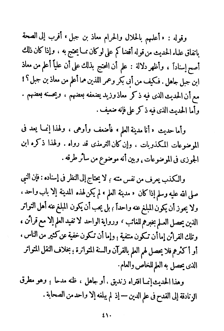 وَقَوْلُهُ: " {أَعْلَمُهُمْ بِالْحَلَالِ وَالْحَرَامِ مُعَاذُ بْنُ جَبَلٍ} أَقْرَبُ إلَى الصِّحَّةِ بِاتِّفَاقِ عُلَمَاءِ الْحَدِيثِ مِنْ قَوْلِهِ أَقْضَاكُمْ عَلِيٌّ لَوْ كَانَ مِمَّا يَحْتَجُّ بِهِ وَإِذَا كَانَ ذَلِكَ أَصَحَّ إسْنَادًا وَأَظْهَرَ دَلَالَةً: عُلِمَ أَنَّ الْمُحْتَجَّ بِذَلِكَ عَلَى أَنَّ عَلِيًّا أَعْلَمُ مِنْ مُعَاذِ بْنِ جَبَلٍ جَاهِلٌ. فَكَيْفَ مِنْ أَبِي بَكْرٍ وَعُمَرَ اللَّذَيْنِ هُمَا أَعْلَمُ مِنْ مُعَاذِ بْنِ جَبَلٍ مَعَ أَنَّ الْحَدِيثَ الَّذِي فِيهِ ذَكَرَ مُعَاذٍ وَزَيْدٍ يُضَعِّفُهُ بَعْضُهُمْ وَيُحَسِّنُهُ بَعْضُهُمْ. وَأَمَّا الْحَدِيثُ الَّذِي فِيهِ ذَكَرَ عَلِيٍّ فَإِنَّهُ ضَعِيفٌ. وَأَمَّا حَدِيثُ " {أَنَا مَدِينَةُ الْعِلْمِ} فَأَضْعَفُ وَأَوْهَى وَلِهَذَا إنَّمَا يُعَدُّ فِي الْمَوْضُوعَاتِ الْمَكْذُوبَاتِ وَإِنْ كَانَ التِّرْمِذِيُّ قَدْ رَوَاهُ. وَلِهَذَا ذَكَرَهُ ابْنُ الْجَوْزِيِّ فِي الْمَوْضُوعَاتِ وَبَيَّنَ أَنَّهُ مَوْضُوعٌ مِنْ سَائِرِ طُرُقِهِ. وَالْكَذِبُ يُعْرَفُ مِنْ نَفْسِ مَتْنِهِ؛ لَا يَحْتَاجُ إلَى النَّظَرِ فِي إسْنَادِهِ: فَإِنَّ النَّبِيَّ صَلَّى اللَّهُ عَلَيْهِ وَسَلَّمَ إذَا كَانَ " {مَدِينَةَ الْعِلْمِ} لَمْ يَكُنْ لِهَذِهِ الْمَدِينَةِ إلَّا بَابٌ وَاحِدٌ وَلَا يَجُوزُ أَنْ يَكُونَ الْمُبَلِّغُ عَنْهُ وَاحِدًا؛ بَلْ يَجِبُ أَنْ يَكُونَ الْمُبَلِّغُ عَنْهُ أَهْلَ التَّوَاتُرِ الَّذِينَ يَحْصُلُ الْعِلْمُ بِخَبَرِهِمْ لِلْغَائِبِ وَرِوَايَةُ الْوَاحِدِ لَا تُفِيدُ الْعِلْمَ إلَّا مَعَ قَرَائِنَ وَتِلْكَ الْقَرَائِنُ إمَّا أَنْ تَكُونَ مُنْتَفِيَةً؛ وَإِمَّا أَنْ تَكُونَ خَفِيَّةً عَنْ كَثِيرٍ مِنْ النَّاسِ أَوْ أَكْثَرِهِمْ فَلَا يَحْصُلُ لَهُمْ الْعِلْمُ بِالْقُرْآنِ وَالسُّنَّةِ الْمُتَوَاتِرَةِ؛ بِخِلَافِ النَّقْلِ الْمُتَوَاتِرِ: الَّذِي يَحْصُلُ بِهِ الْعِلْمُ لِلْخَاصِّ وَالْعَامِّ. وَهَذَا الْحَدِيثُ إنَّمَا افْتَرَاهُ زِنْدِيقٌ أَوْ جَاهِلٌ: ظَنَّهُ مَدْحًا؛ وَهُوَ مُطْرِقُ الزَّنَادِقَةِ إلَى الْقَدْحِ فِي عِلْمِ الدِّينِ - إذْ لَمْ يُبَلِّغْهُ إلَّا وَاحِدٌ مِنْ الصَّحَابَةِ.