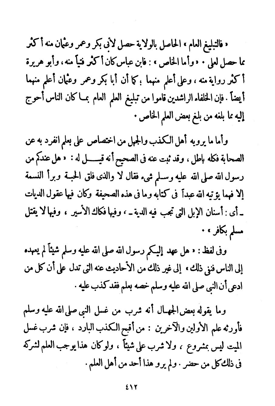 " فَالتَّبْلِيغُ الْعَامُّ " الْحَاصِلُ بِالْوِلَايَةِ حَصَلَ لِأَبِي بَكْرٍ وَعُمَرَ وَعُثْمَانَ مِنْهُ أَكْثَرُ مِمَّا حَصَلَ لِعَلِيِّ. " وَأَمَّا الْخَاصُّ ": فَابْنُ عَبَّاسٍ كَانَ أَكْثَرَ فُتْيَا مِنْهُ وَأَبُو هُرَيْرَةَ أَكْثَرَ رِوَايَةً مِنْهُ وَعَلِيٌّ أَعْلَمُ مِنْهُمَا؛ كَمَا أَنَّ أَبَا بَكْر وَعُمَرَ وَعُثْمَانَ أَعْلَمُ مِنْهُمَا أَيْضًا. فَإِنَّ الْخُلَفَاءَ الرَّاشِدِينَ قَامُوا مِنْ تَبْلِيغِ الْعِلْمِ الْعَامِّ بِمَا كَانَ النَّاسُ أَحْوَجَ إلَيْهِ مِمَّا بَلَّغَهُ مَنْ بَلَّغَ بَعْضَ الْعِلْمِ الْخَاصِّ. وَأَمَّا مَا يَرْوِيه أَهْلُ الْكَذِبِ وَالْجَهْلِ مِنْ اخْتِصَاصِ عَلِيٍّ بِعِلْمِ انْفَرَدَ بِهِ عَنْ الصَّحَابَةِ فَكُلُّهُ بَاطِلٌ وَقَدْ ثَبَتَ عَنْهُ فِي الصَّحِيحِ أَنَّهُ قِيلَ لَهُ: " {هَلْ عِنْدَكُمْ مِنْ رَسُولِ اللَّهِ صَلَّى اللَّهُ عَلَيْهِ وَسَلَّمَ شَيْءٌ فَقَالَ لَا وَاَلَّذِي فَلَقَ الْحَبَّةَ وَبَرَأَ النَّسَمَةَ إلَّا فَهْمًا يُؤْتِيهِ اللَّهُ عَبْدًا فِي كِتَابِهِ وَمَا فِي هَذِهِ الصَّحِيفَةِ وَكَانَ فِيهَا عُقُولُ الدِّيَاتِ - أَيْ: أَسْنَانُ الْإِبِلِ الَّتِي تَجِبُ فِيهِ الدِّيَةُ - وَفِيهَا فِكَاكُ الْأَسِيرِ وَفِيهَا لَا يُقْتَلُ مُسْلِمٌ بِكَافِرِ} . وَفِي لَفْظٍ: " {هَلْ عَهِدَ إلَيْكُمْ رَسُولُ اللَّهِ صَلَّى اللَّهُ عَلَيْهِ وَسَلَّمَ شَيْئًا لَمْ يَعْهَدْهُ إلَى النَّاسِ فَنَفَى ذَلِكَ} إلَى غَيْرِ ذَلِكَ مِنْ الْأَحَادِيثِ عَنْهُ الَّتِي تَدُلُّ عَلَى أَنَّ كُلَّ مَنْ ادَّعَى أَنَّ النَّبِيَّ صَلَّى اللَّهُ عَلَيْهِ وَسَلَّمَ خَصَّهُ بِعِلْمِ فَقَدْ كَذَبَ عَلَيْهِ. وَمَا يَقُولُهُ بَعْضُ الْجُهَّالِ أَنَّهُ شَرِبَ مِنْ غُسْلِ النَّبِيِّ صَلَّى اللَّهُ عَلَيْهِ وَسَلَّمَ فَأَوْرَثَهُ عِلْمَ الْأَوَّلِينَ والآخرين:. مِنْ أَقْبَحِ الْكَذِبِ الْبَارِدِ فَإِنَّ شُرْبَ غُسْلِ الْمَيِّتِ لَيْسَ بِمَشْرُوعِ وَلَا شَرِبَ عَلِيٌّ شَيْئًا وَلَوْ كَانَ هَذَا يُوجِبُ الْعِلْمَ لَشَرِكَهُ فِي ذَلِكَ كُلُّ مَنْ حَضَرَ. وَلَمْ يَرْوِ هَذَا أَحَدٌ مِنْ أَهْلِ الْعِلْمِ.