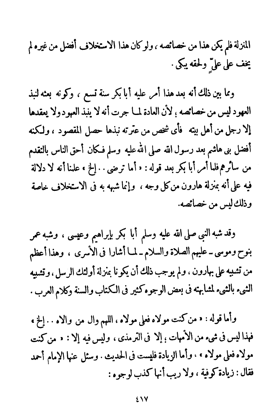 الْمَنْزِلَةِ فَلَمْ يَكُنْ هَذَا مِنْ خَصَائِصِهِ وَلَوْ كَانَ هَذَا الِاسْتِخْلَافُ أَفْضَلَ مِنْ غَيْرِهِ لَمْ يُخْفِ عَلَى عَلِيٍّ وَلَحِقَهُ يَبْكِي. وَمِمَّا بَيَّنَ ذَلِكَ أَنَّهُ بَعْدَ هَذَا أَمَّرَ عَلَيْهِ أَبَا بَكْرٍ سَنَةَ تِسْعٍ وَكَوْنُهُ بَعَثَهُ لِنَبْذِ الْعُهُودِ لَيْسَ مِنْ خَصَائِصِهِ؛ لِأَنَّ الْعَادَةَ لَمَّا جَرَتْ أَنَّهُ لَا يَنْبِذُ الْعُهُودَ وَلَا يَعْقِدُهَا إلَّا رَجُلٌ مِنْ أَهْلِ بَيْتِهِ: فَأَيُّ شَخْصٍ مِنْ عِتْرَتِهِ نَبَذَهَا حَصَلَ الْمَقْصُودُ وَلَكِنَّهُ أَفْضَلُ بَنِي هَاشِمٍ بَعْدَ رَسُولِ اللَّهِ صَلَّى اللَّهُ عَلَيْهِ وَسَلَّمَ فَكَانَ أَحَقَّ النَّاسِ بِالتَّقَدُّمِ مِنْ سَائِرِهِمْ فَلَمَّا أَمَرَ أَبَا بَكْرٍ بَعْدَ قَوْلِهِ: " {أَمَا تَرْضَى} . . . إلَخْ " عَلِمْنَا أَنَّهُ لَا دَلَالَةَ فِيهِ عَلَى أَنَّهُ بِمَنْزِلَةِ هَارُونَ مِنْ كُلِّ وَجْهٍ وَإِنَّمَا شَبَّهَهُ بِهِ فِي الِاسْتِخْلَافِ خَاصَّةً وَذَلِكَ لَيْسَ مِنْ خَصَائِصِهِ. وَقَدْ شَبَّهَ النَّبِيُّ صَلَّى اللَّهُ عَلَيْهِ وَسَلَّمَ أَبَا بَكْرٍ بِإِبْرَاهِيمَ وَعِيسَى وَشَبَّهَ عُمَرَ بِنُوحِ وَمُوسَى - عَلَيْهِمْ الصَّلَاةُ وَالسَّلَامُ - لَمَّا أَشَارَا فِي الْأَسْرَى وَهَذَا أَعْظَمُ مِنْ تَشْبِيهِ عَلِيٍّ بِهَارُونَ وَلَمْ يُوجِبْ ذَلِكَ أَنْ يَكُونَا بِمَنْزِلَةِ أُولَئِكَ الرُّسُلِ وَتَشْبِيهُ الشَّيْءِ بِالشَّيْءِ لِمُشَابَهَتِهِ فِي بَعْضِ الْوُجُوهِ كَثِيرٌ فِي الْكِتَابِ وَالسُّنَّةِ وَكَلَامِ الْعَرَبِ. وَأَمَّا قَوْلُهُ: " {مَنْ كُنْت مَوْلَاهُ فَعَلِيٌّ مَوْلَاهُ اللَّهُمَّ وَالِ مَنْ وَالَاهُ} . . . إلَخْ " فَهَذَا لَيْسَ فِي شَيْءٍ مِنْ الْأُمَّهَاتِ؛ إلَّا فِي التِّرْمِذِيِّ وَلَيْسَ فِيهِ إلَّا: " {مَنْ كُنْت مَوْلَاهُ فَعَلِيٌّ مَوْلَاهُ} وَأَمَّا الزِّيَادَةُ فَلَيْسَتْ فِي الْحَدِيثِ. وَسُئِلَ عَنْهَا الْإِمَامُ أَحْمَد فَقَالَ: زِيَادَةٌ كُوفِيَّةٌ وَلَا رَيْبَ أَنَّهَا كَذِبٌ لِوُجُوهِ: