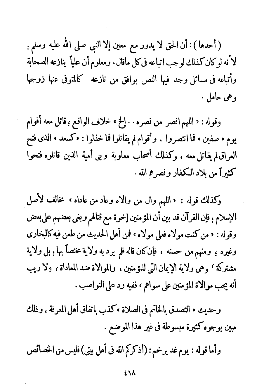 أَحَدُهَا: أَنَّ الْحَقَّ لَا يَدُورُ مَعَ مُعَيَّنٍ إلَّا النَّبِيُّ صَلَّى اللَّهُ عَلَيْهِ وَسَلَّمَ لِأَنَّهُ لَوْ كَانَ كَذَلِكَ لَوَجَبَ اتِّبَاعُهُ فِي كُلِّ مَا قَالَ وَمَعْلُومٌ أَنَّ عَلِيًّا يُنَازِعُهُ الصَّحَابَةُ وَأَتْبَاعُهُ فِي مَسَائِلَ وُجِدَ فِيهَا النَّصُّ يُوَافِقُ مَنْ نَازَعَهُ: كَالْمُتَوَفَّى عَنْهَا زَوْجُهَا وَهِيَ حَامِلٌ. وَقَوْلُهُ: " {اللَّهُمَّ اُنْصُرْ مَنْ نَصَرَهُ} . . إلَخْ " خِلَافُ الْوَاقِعِ؛ قَاتَلَ مَعَهُ أَقْوَامٌ يَوْمَ " صفين " فَمَا انْتَصَرُوا وَأَقْوَامٌ لَمْ يُقَاتِلُوا فَمَا خُذِلُوا: " كَسَعْدِ " الَّذِي فَتَحَ الْعِرَاقَ لَمْ يُقَاتِلْ مَعَهُ وَكَذَلِكَ أَصْحَابُ مُعَاوِيَةَ وَبَنِيَّ أُمَيَّةَ الَّذِينَ قَاتَلُوهُ فَتَحُوا كَثِيرًا مِنْ بِلَادِ الْكُفَّارِ وَنَصَرَهُمْ اللَّهُ. وَكَذَلِكَ قَوْلُهُ: " {اللَّهُمَّ وَالِ مَنْ وَالَاهُ وَعَادِ مَنْ عَادَاهُ} مُخَالِفٌ لِأَصْلِ الْإِسْلَامِ؛ فَإِنَّ الْقُرْآنَ قَدْ بَيَّنَ أَنَّ الْمُؤْمِنِينَ إخْوَةٌ مَعَ قِتَالِهِمْ وَبَغْيِ بَعْضِهِمْ عَلَى بَعْضٍ وَقَوْلُهُ: " {مَنْ كُنْت مَوْلَاهُ فَعَلِيٌّ مَوْلَاهُ} فَمِنْ أَهْلِ الْحَدِيثِ مَنْ طَعَنَ فِيهِ كَالْبُخَارِيِّ وَغَيْرِهِ؛ وَمِنْهُمْ مَنْ حَسَّنَهُ فَإِنْ كَانَ قَالَهُ فَلَمْ يُرِدْ بِهِ وِلَايَةً مُخْتَصًّا بِهَا؛ بَلْ وِلَايَةً مُشْتَرِكَةً وَهِيَ وِلَايَةُ الْإِيمَانِ الَّتِي لِلْمُؤْمِنِينَ وَالْمُوَالَاةُ ضِدُّ الْمُعَادَاةِ وَلَا رَيْبَ أَنَّهُ يَجِبُ مُوَالَاةُ الْمُؤْمِنِينَ عَلَى سِوَاهُمْ فَفِيهِ رَدٌّ عَلَى النَّوَاصِبِ. وَحَدِيثُ " {التَّصَدُّقِ بِالْخَاتَمِ فِي الصَّلَاةِ} كَذِبٌ بِاتِّفَاقِ أَهْلِ الْمَعْرِفَةِ وَذَلِكَ مُبَيَّنٌ بِوُجُوهِ كَثِيرَةٍ مَبْسُوطَةٍ فِي غَيْرِ هَذَا الْمَوْضِعِ. وَأَمَّا قَوْلُهُ: يَوْمَ غَدِيرِ خُمٍّ: أُذَكِّرُكُمْ اللَّهَ فِي أَهْلِ بَيْتِي فَلَيْسَ مِنْ الْخَصَائِصِ