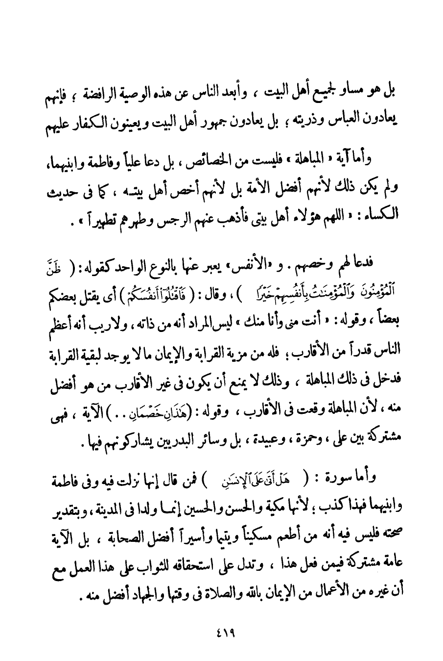 بَلْ هُوَ مُسَاوٍ لِجَمِيعِ أَهْلِ الْبَيْتِ وَأَبْعَدُ النَّاسِ عَنْ هَذِهِ الْوَصِيَّةِ الرَّافِضَةُ؛ فَإِنَّهُمْ يُعَادُونَ الْعَبَّاسَ وَذُرِّيَّتَهُ؛ بَلْ يُعَادُونَ جُمْهُورَ أَهْلِ الْبَيْتِ وَيُعِينُونَ الْكُفَّارَ عَلَيْهِمْ وَأَمَّا آيَةُ " الْمُبَاهَلَةِ " فَلَيْسَتْ مِنْ الْخَصَائِصِ بَلْ دَعَا عَلِيًّا وَفَاطِمَةَ وَابْنَيْهِمَا وَلَمْ يَكُنْ ذَلِكَ لِأَنَّهُمْ أَفْضَلُ الْأُمَّةِ بَلْ لِأَنَّهُمْ أَخَصُّ أَهْلِ بَيْتِهِ كَمَا فِي حَدِيثِ الْكِسَاءِ: " {اللَّهُمَّ هَؤُلَاءِ أَهْلُ بَيْتِي فَأَذْهِبْ عَنْهُمْ الرِّجْسَ وَطَهِّرْهُمْ تَطْهِيرًا} . فَدَعَا لَهُمْ وَخَصَّهُمْ. وَ " الْأَنْفُسُ " يُعَبَّرُ عَنْهَا بِالنَّوْعِ الْوَاحِدِ كَقَوْلِهِ: {ظَنَّ الْمُؤْمِنُونَ وَالْمُؤْمِنَاتُ بِأَنْفُسِهِمْ خَيْرًا} وَقَالَ: {فَاقْتُلُوا أَنْفُسَكُمْ} أَيْ يَقْتُلُ بَعْضُكُمْ بَعْضًا وَقَوْلُهُ: " {أَنْتَ مِنِّي وَأَنَا مِنْك} لَيْسَ الْمُرَادُ أَنَّهُ مِنْ ذَاتِهِ وَلَا رَيْبَ أَنَّهُ أَعْظَمُ النَّاسِ قَدْرًا مِنْ الْأَقَارِبِ؛ فَلَهُ مِنْ مَزِيَّةِ الْقَرَابَةِ وَالْإِيمَانِ مَا لَا يُوجَدُ لِبَقِيَّةِ الْقَرَابَةِ فَدَخَلَ فِي ذَلِكَ الْمُبَاهَلَةِ وَذَلِكَ لَا يَمْنَعُ أَنْ يَكُونَ فِي غَيْرِ الْأَقَارِبِ مَنْ هُوَ أَفْضَلُ مِنْهُ لِأَنَّ الْمُبَاهَلَةَ وَقَعَتْ فِي الْأَقَارِبِ وَقَوْلُهُ: {هَذَانِ خَصْمَانِ} الْآيَةَ فَهِيَ مُشْتَرَكَةٌ بَيْنَ عَلِيٍّ وَحَمْزَةَ وَعُبَيْدَةَ بَلْ وَسَائِرُ الْبَدْرِيِّينَ يُشَارِكُونَهُمْ فِيهَا. وَأَمَّا سُورَةُ: {هَلْ أَتَى عَلَى الْإِنْسَانِ} فَمَنْ قَالَ إنَّهَا نَزَلَتْ فِيهِ وَفِي فَاطِمَةَ وَابْنَيْهِمَا فَهَذَا كَذِبٌ؛ لِأَنَّهَا مَكِّيَّةٌ وَالْحَسَنُ وَالْحُسَيْنُ إنَّمَا وُلِدَا فِي الْمَدِينَةِ وَبِتَقْدِيرِ صِحَّتِهِ فَلَيْسَ فِيهِ أَنَّهُ مَنْ أَطْعَمَ مِسْكِينًا وَيَتِيمًا وَأَسِيرًا أَفْضَلُ الصَّحَابَةِ بَلْ الْآيَةُ عَامَّةٌ مُشْتَرَكَةٌ فِيمَنْ فَعَلَ هَذَا وَتَدُلُّ عَلَى اسْتِحْقَاقِهِ لِلثَّوَابِ عَلَى هَذَا الْعَمَلِ مَعَ أَنَّ غَيْرَهُ مِنْ الْأَعْمَالِ مِنْ الْإِيمَانِ بِاَللَّهِ وَالصَّلَاةِ فِي وَقْتِهَا وَالْجِهَادُ أَفْضَلُ مِنْهُ.