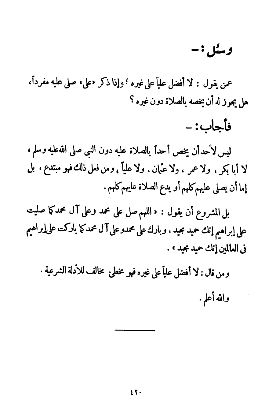 لَيْسَ لِأَحَدِ أَنْ يَخُصَّ أَحَدًا بِالصَّلَاةِ عَلَيْهِ دُونَ النَّبِيِّ صَلَّى اللَّهُ عَلَيْهِ وَسَلَّمَ لَا أَبَا بَكْرٍ وَلَا عُمَرَ وَلَا عُثْمَانَ وَلَا عَلِيًّا وَمَنْ فَعَلَ ذَلِكَ فَهُوَ مُبْتَدِعٌ بَلْ إمَّا أَنْ يُصَلِّيَ عَلَيْهِمْ كُلِّهِمْ أَوْ يَدَعُ الصَّلَاةَ عَلَيْهِمْ كُلِّهِمْ. بَلْ الْمَشْرُوعُ أَنْ يَقُولَ: " اللَّهُمَّ صَلِّ عَلَى مُحَمَّدٍ وَعَلَى آلِ مُحَمَّدٍ كَمَا صَلَّيْت عَلَى إبْرَاهِيمَ إنَّك حَمِيدٌ مَجِيدٌ وَبَارِكْ عَلَى مُحَمَّدٍ وَعَلَى آلِ مُحَمَّدٍ كَمَا بَارَكْت عَلَى إبْرَاهِيمَ فِي الْعَالَمِينَ إنَّك حَمِيدٌ مَجِيدٌ ". وَمَنْ قَالَ: لَا أُفَضِّلُ عَلِيًّا عَلَى غَيْرِهِ فَهُوَ مُخْطِئٌ مُخَالِفٌ لِلْأَدِلَّةِ الشَّرْعِيَّةِ. وَاَللَّهُ أَعْلَمُ.