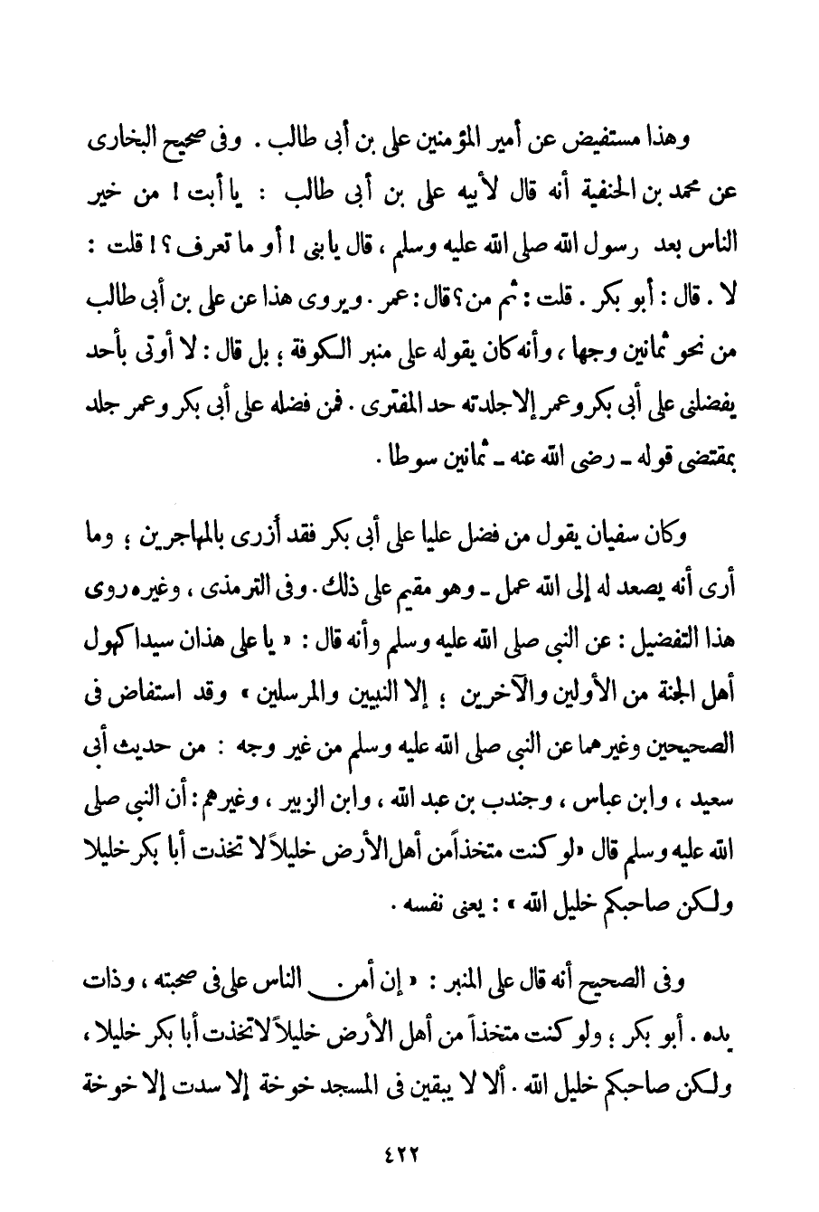 وَهَذَا مُسْتَفِيضٌ عَنْ أَمِيرِ الْمُؤْمِنِينَ عَلِيِّ بْنِ أَبِي طَالِبٍ. وَفِي صَحِيحِ الْبُخَارِيِّ عَنْ مُحَمَّدِ بْنِ الْحَنَفِيَّةِ أَنَّهُ قَالَ لِأَبِيهِ عَلِيِّ بْنِ أَبِي طَالِبٍ: يَا أَبَتِ مَنْ خَيْرُ النَّاسِ بَعْدَ رَسُولِ اللَّهِ صَلَّى اللَّهُ عَلَيْهِ وَسَلَّمَ قَالَ يَا بُنَيَّ أَوَمَا تَعْرِفُ قُلْت: لَا. قَالَ: أَبُو بَكْرٍ. قُلْت: ثُمَّ مَنْ؟ قَالَ: عُمَرُ. وَيُرْوَى هَذَا عَنْ عَلِيِّ بْنِ أَبِي طَالِبٍ مِنْ نَحْوِ ثَمَانِينَ وَجْهًا وَأَنَّهُ كَانَ يَقُولُهُ عَلَى مِنْبَرِ الْكُوفَةِ؛ بَلْ قَالَ: لَا أوتى بِأَحَدِ يُفَضِّلُنِي عَلَى أَبِي بَكْرٍ وَعُمَرَ إلَّا جَلَدْته حَدَّ الْمُفْتَرِي. فَمَنْ فَضَّلَهُ عَلَى أَبِي بَكْرٍ وَعُمَرَ جُلِدَ بِمُقْتَضَى قَوْلِهِ - رَضِيَ اللَّهُ عَنْهُ - ثَمَانِينَ سَوْطًا. وَكَانَ سُفْيَانُ يَقُولُ مَنْ فَضَّلَ عَلِيًّا عَلَى أَبِي بَكْر فَقَدْ أَزْرَى بِالْمُهَاجِرِينَ؛ وَمَا أَرَى أَنَّهُ يَصْعَدُ لَهُ إلَى اللَّهِ عَمَلٌ - وَهُوَ مُقِيمٌ عَلَى ذَلِكَ. وَفِي التِّرْمِذِيِّ وَغَيْرِهِ رُوِيَ هَذَا التَّفْضِيلُ: عَنْ النَّبِيِّ صَلَّى اللَّهُ عَلَيْهِ وَسَلَّمَ وَأَنَّهُ قَالَ: " {يَا عَلِيُّ هَذَانِ سَيِّدَا كُهُولِ أَهْلِ الْجَنَّةِ مِنْ الْأَوَّلِينَ والآخرين؛ إلَّا النَّبِيِّينَ وَالْمُرْسَلِينَ} وَقَدْ اسْتَفَاضَ فِي الصَّحِيحَيْنِ وَغَيْرِهِمَا عَنْ النَّبِيِّ صَلَّى اللَّهُ عَلَيْهِ وَسَلَّمَ مِنْ غَيْرِ وَجْهٍ: مِنْ حَدِيثِ أَبِي سَعِيدٍ وَابْنِ عَبَّاسٍ وَجُنْدُبِ بْنِ عَبْدِ اللَّهِ وَابْنِ الزُّبَيْرِ وَغَيْرِهِمْ: أَنَّ النَّبِيَّ صَلَّى اللَّهُ عَلَيْهِ وَسَلَّمَ قَالَ " {لَوْ كُنْت مُتَّخِذًا مِنْ أَهْلِ الْأَرْضِ خَلِيلًا لَاِتَّخَذْت أَبَا بَكْرٍ خَلِيلًا وَلَكِنَّ صَاحِبَكُمْ خَلِيلُ اللَّهِ} يَعْنِي نَفْسَهُ. وَفِي الصَّحِيحِ أَنَّهُ قَالَ عَلَى الْمِنْبَرِ: " {إنَّ أَمَنَّ النَّاسِ عَلَيَّ فِي صُحْبَتِهِ وَذَاتِ يَدِهِ. أَبُو بَكْرٍ؛ وَلَوْ كُنْت مُتَّخِذًا مِنْ أَهْلِ الْأَرْضِ خَلِيلًا لَاِتَّخَذْت أَبَا بَكْرٍ خَلِيلًا وَلَكِنَّ صَاحِبَكُمْ خَلِيلُ اللَّهِ. أَلَا لَا يَبْقَيَنَّ فِي الْمَسْجِدِ خَوْخَةٌ إلَّا سُدَّتْ إلَّا خَوْخَةُ