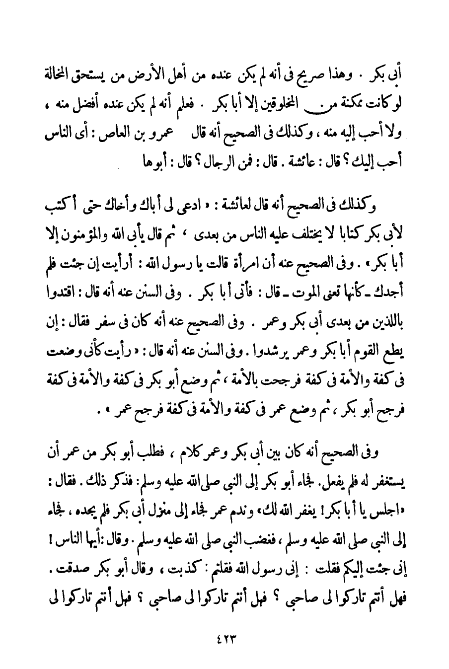 أَبِي بَكْرٍ} . وَهَذَا صَرِيحٌ فِي أَنَّهُ لَمْ يَكُنْ عِنْدَهُ مِنْ أَهْلِ الْأَرْضِ مَنْ يَسْتَحِقُّ الْمُخَالَةَ لَوْ كَانَتْ مُمْكِنَةً مِنْ الْمَخْلُوقِينَ إلَّا أَبَا بَكْرٍ. فَعُلِمَ أَنَّهُ لَمْ يَكُنْ عِنْدَهُ أَفْضَلُ مِنْهُ وَلَا أَحَبُّ إلَيْهِ مِنْهُ وَكَذَلِكَ فِي الصَّحِيحِ أَنَّهُ {قَالَ عَمْرُو بْنُ العاص: أَيُّ النَّاسِ أَحَبُّ إلَيْك؟ قَالَ: عَائِشَةُ. قَالَ: فَمِنْ الرِّجَالِ؟ قَالَ: أَبُوهَا} . وَكَذَلِكَ فِي الصَّحِيحِ أَنَّهُ قَالَ لِعَائِشَةَ: " {اُدْعِي لِي أَبَاك وَأَخَاك حَتَّى أَكْتُبَ لِأَبِي بَكْرٍ كِتَابًا لَا يَخْتَلِفُ عَلَيْهِ النَّاسُ مِنْ بَعْدِي ثُمَّ قَالَ يَأْبَى اللَّهُ وَالْمُؤْمِنُونَ إلَّا أَبَا بَكْرٍ} . وَفِي الصَّحِيحِ عَنْهُ {أَنَّ امْرَأَةً قَالَتْ يَا رَسُولَ اللَّهِ: أَرَأَيْت إنْ جِئْت فَلَمْ أَجِدْك - كَأَنَّهَا تَعْنِي الْمَوْتَ - قَالَ: فَأْتِي أَبَا بَكْرٍ} . وَفِي السُّنَنِ عَنْهُ أَنَّهُ قَالَ: {اقْتَدُوا بِاَللَّذَيْنِ مِنْ بَعْدِي أَبِي بَكْرٍ وَعُمَرَ} . وَفِي الصَّحِيحِ عَنْهُ أَنَّهُ كَانَ فِي سَفَرٍ فَقَالَ: {إنْ يُطِعْ الْقَوْمُ أَبَا بَكْرٍ وَعُمَرَ يَرْشُدُوا} . وَفِي السُّنَنِ عَنْهُ أَنَّهُ قَالَ: " {رَأَيْت كَأَنِّي وُضِعْت فِي كِفَّةٍ وَالْأُمَّةُ فِي كِفَّةٍ فَرَجَحْت بِالْأُمَّةِ ثُمَّ وُضِعَ أَبُو بَكْرٍ فِي كِفَّةٍ وَالْأُمَّةُ فِي كِفَّةٍ فَرَجَحَ أَبُو بَكْرٍ ثُمَّ وُضِعَ عُمَرُ فِي كِفَّةٍ وَالْأُمَّةُ فِي كِفَّةٍ فَرَجَحَ عُمَرُ} . وَفِي الصَّحِيحِ أَنَّهُ {كَانَ بَيْنَ أَبِي بَكْرٍ وَعُمَرَ كَلَامٌ فَطَلَبَ أَبُو بَكْرٍ مِنْ عُمَرَ أَنْ يَسْتَغْفِرَ لَهُ فَلَمْ يَفْعَلْ. فَجَاءَ أَبُو بَكْرٍ إلَى النَّبِيِّ صَلَّى اللَّهُ عَلَيْهِ وَسَلَّمَ فَذَكَرَ ذَلِكَ. فَقَالَ: اجْلِسْ يَا أَبَا بَكْرٍ يَغْفِرُ اللَّهُ لَك وَنَدِمَ عُمَرُ فَجَاءَ إلَى مَنْزِلِ أَبِي بَكْرٍ فَلَمْ يَجِدْهُ فَجَاءَ إلَى النَّبِيِّ صَلَّى اللَّهُ عَلَيْهِ وَسَلَّمَ فَغَضِبَ النَّبِيُّ صَلَّى اللَّهُ عَلَيْهِ وَسَلَّمَ. وَقَالَ: أَيُّهَا النَّاسُ إنِّي جِئْت إلَيْكُمْ فَقُلْت: إنِّي رَسُولُ اللَّهِ فَقُلْتُمْ: كَذَبْت وَقَالَ أَبُو بَكْرٍ صَدَقْت. فَهَلْ أَنْتُمْ تَارِكُو لِي صَاحِبِي؟ فَهَلْ أَنْتُمْ تَارِكُو لِي صَاحِبِي؟ فَهَلْ أَنْتُمْ تَارِكُو لِي
