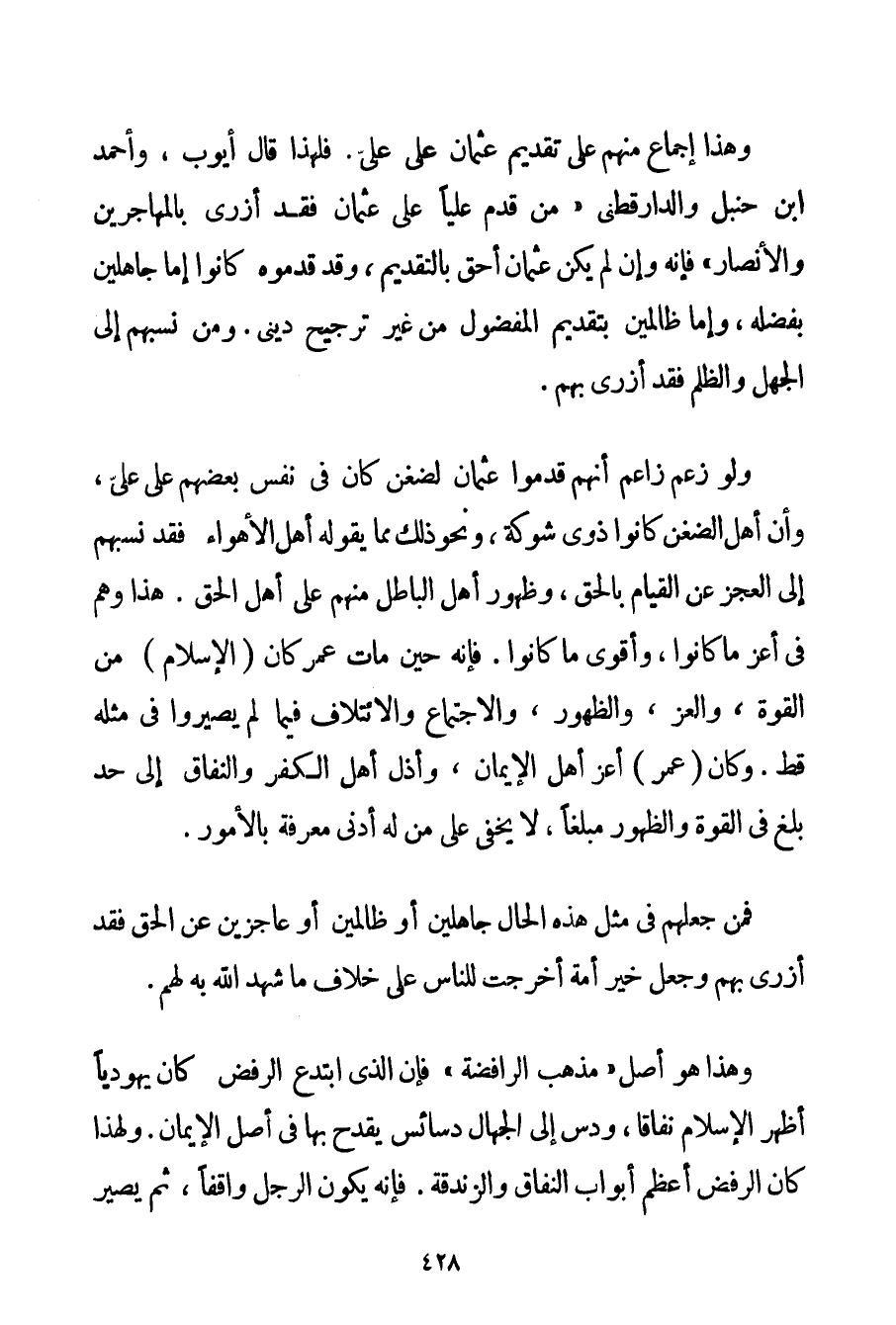 وَهَذَا إجْمَاعٌ مِنْهُمْ عَلَى تَقْدِيمِ عُثْمَانَ عَلَى عَلِيٍّ. فَلِهَذَا قَالَ أَيُّوبُ وَأَحْمَد بْنُ حَنْبَلٍ وَالدَّارَقُطْنِي " مَنْ قَدَّمَ عَلِيًّا عَلَى عُثْمَانَ فَقَدْ أَزْرَى بِالْمُهَاجِرِينَ وَالْأَنْصَارِ " فَإِنَّهُ وَإِنْ لَمْ يَكُنْ عُثْمَانُ أَحَقَّ بِالتَّقْدِيمِ وَقَدْ قَدَّمُوهُ كَانُوا إمَّا جَاهِلِينَ بِفَضْلِهِ وَإِمَّا ظَالِمِينَ بِتَقْدِيمِ الْمَفْضُولِ مِنْ غَيْرِ تَرْجِيحٍ دِينِيٍّ. وَمَنْ نَسَبَهُمْ إلَى الْجَهْلِ وَالظُّلْمِ فَقَدْ أَزْرَى بِهِمْ. وَلَوْ زَعَمَ زَاعِمٌ أَنَّهُمْ قَدَّمُوا عُثْمَانَ لِضَغَنِ كَانَ فِي نَفْسِ بَعْضِهِمْ عَلَى عَلِيٍّ وَأَنَّ أَهْلَ الضَّغَنِ كَانُوا ذَوِي شَوْكَةٍ وَنَحْوَ ذَلِكَ مِمَّا يَقُولُهُ أَهْلُ الْأَهْوَاءِ: فَقَدْ نَسَبَهُمْ إلَى الْعَجْزِ عَنْ الْقِيَامِ بِالْحَقِّ وَظُهُورِ أَهْلِ الْبَاطِلِ مِنْهُمْ عَلَى أَهْلِ الْحَقِّ. هَذَا وَهْمٌ فِي أَعَزِّ مَا كَانُوا وَأَقْوَى مَا كَانُوا. فَإِنَّهُ حِينَ مَاتَ عُمَرُ كَانَ (الْإِسْلَامُ: مِنْ الْقُوَّةِ وَالْعِزِّ وَالظُّهُورِ وَالِاجْتِمَاعِ والائتلاف فِيمَا لَمْ يَصِيرُوا فِي مِثْلِهِ قَطُّ. وَكَانَ (عُمَرُ أَعَزَّ أَهْلَ الْإِيمَانِ وَأَذَلَّ أَهْلَ الْكُفْرِ وَالنِّفَاقِ إلَى حَدٍّ بَلَغَ فِي الْقُوَّةِ وَالظُّهُورِ مَبْلَغًا لَا يَخْفَى عَلَى مَنْ لَهُ أَدْنَى مَعْرِفَةٍ بِالْأُمُورِ. فَمَنْ جَعَلَهُمْ فِي مِثْلِ هَذِهِ الْحَالِ جَاهِلِينَ أَوْ ظَالِمِينَ أَوْ عَاجِزِينَ عَنْ الْحَقِّ فَقَدْ أَزْرَى بِهِمْ وَجَعَلَ خَيْرَ أُمَّةٍ أُخْرِجَتْ لِلنَّاسِ عَلَى خِلَافِ مَا شَهِدَ اللَّهُ بِهِ لَهُمْ. وَهَذَا هُوَ أَصْلُ " مَذْهَبِ الرَّافِضَةِ " فَإِنَّ الَّذِي ابْتَدَعَ الرَّفْضَ كَانَ يَهُودِيًّا أَظْهَر الْإِسْلَامَ نِفَاقًا وَدَسَّ إلَى الْجُهَّالِ دَسَائِسَ يَقْدَحُ بِهَا فِي أَصْلِ الْإِيمَانِ. وَلِهَذَا كَانَ الرَّفْضُ أَعْظَمَ أَبْوَابِ النِّفَاقِ وَالزَّنْدَقَةِ. فَإِنَّهُ يَكُونُ الرَّجُلُ وَاقِفًا ثُمَّ يَصِيرُ